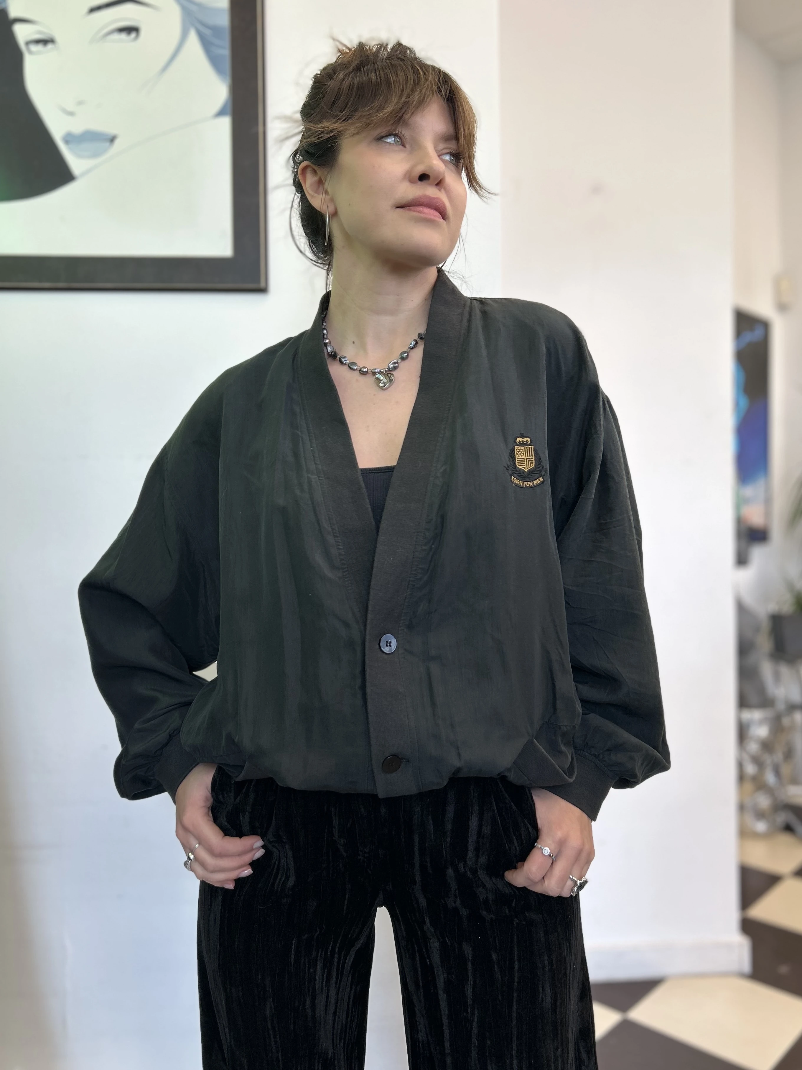 Czarna, jedwabna kurtka bomberka vintage. Kurtka wykonana z lśniącego jedwabiu. Posiada podszewkę.