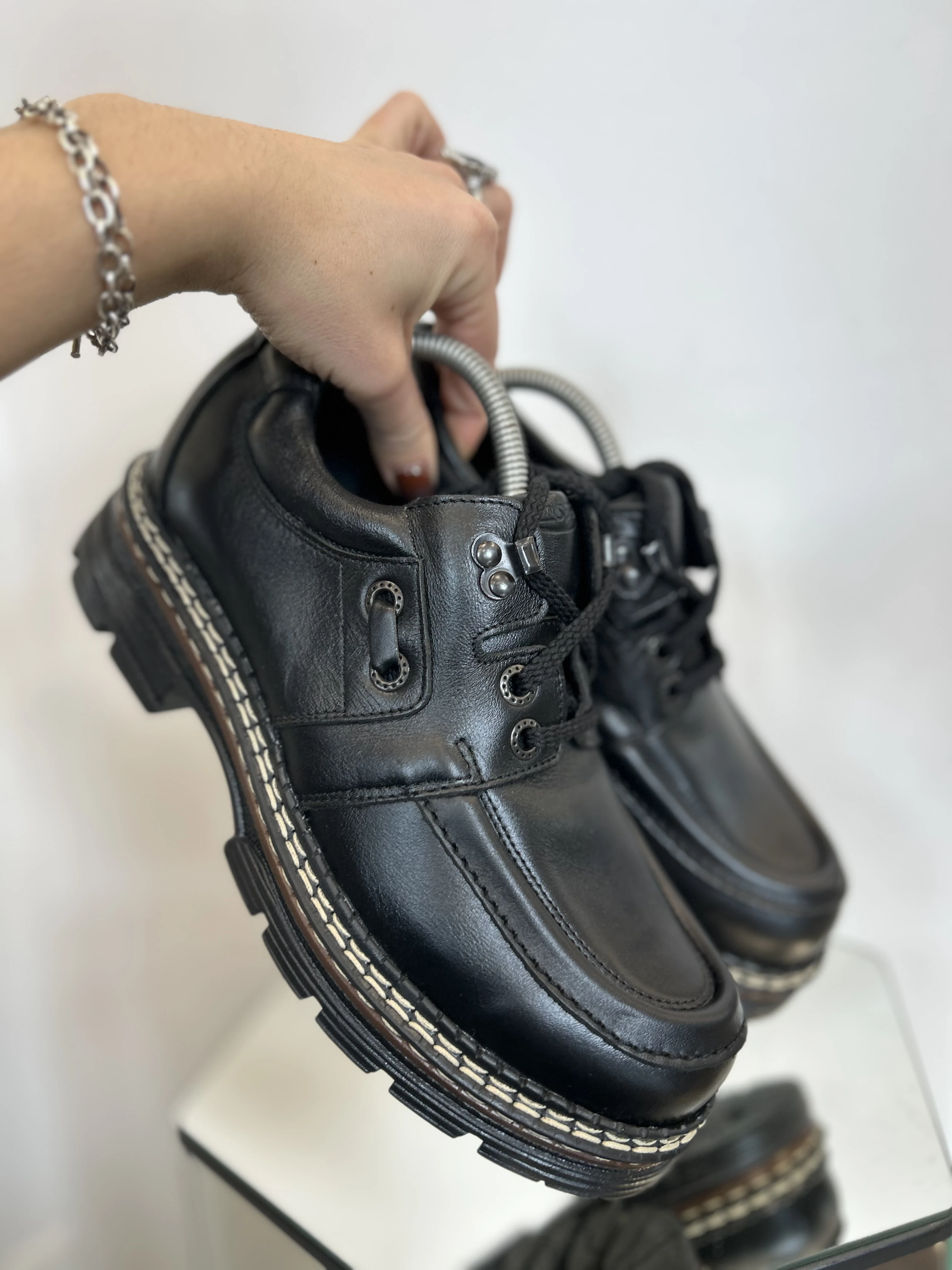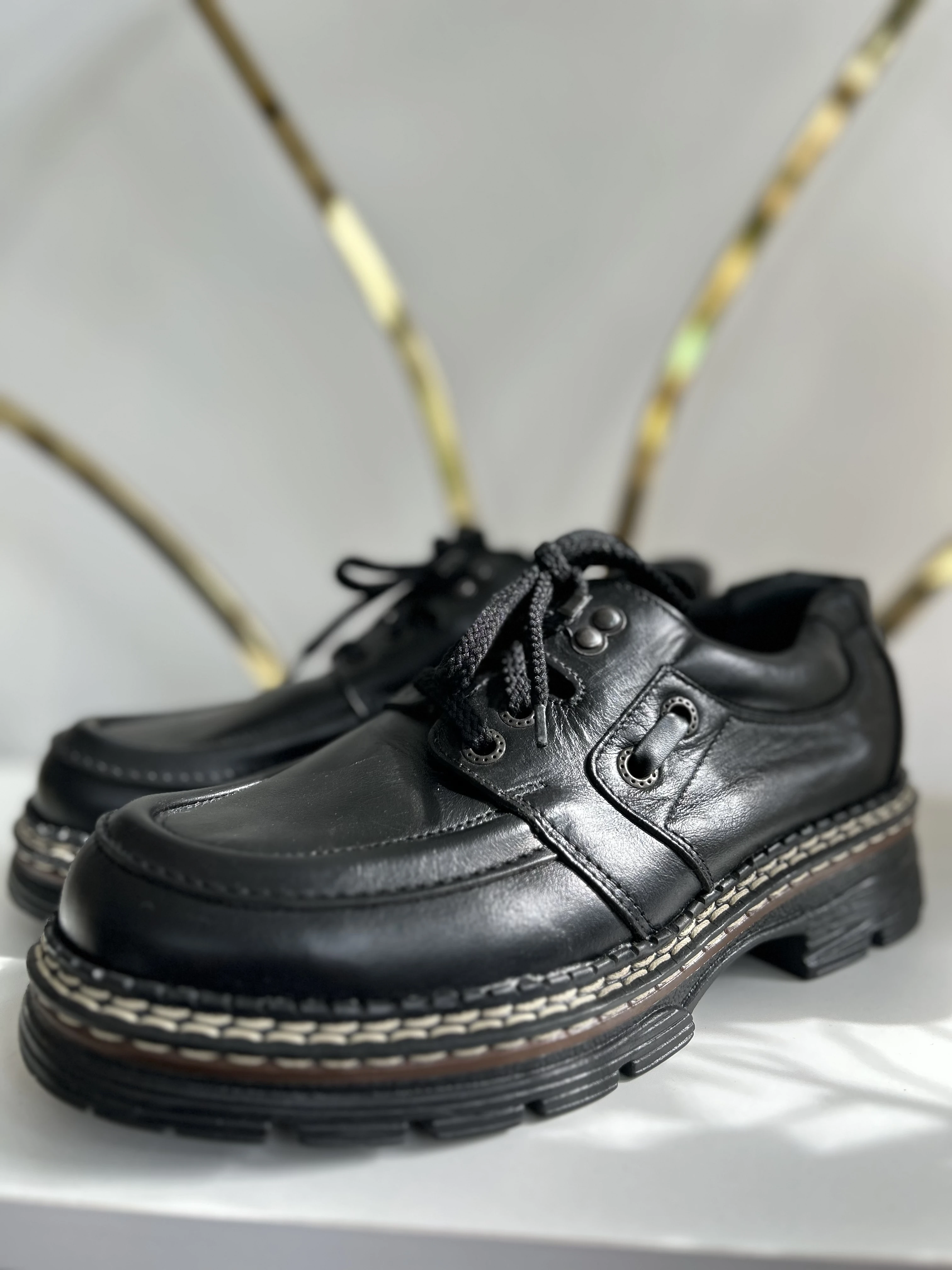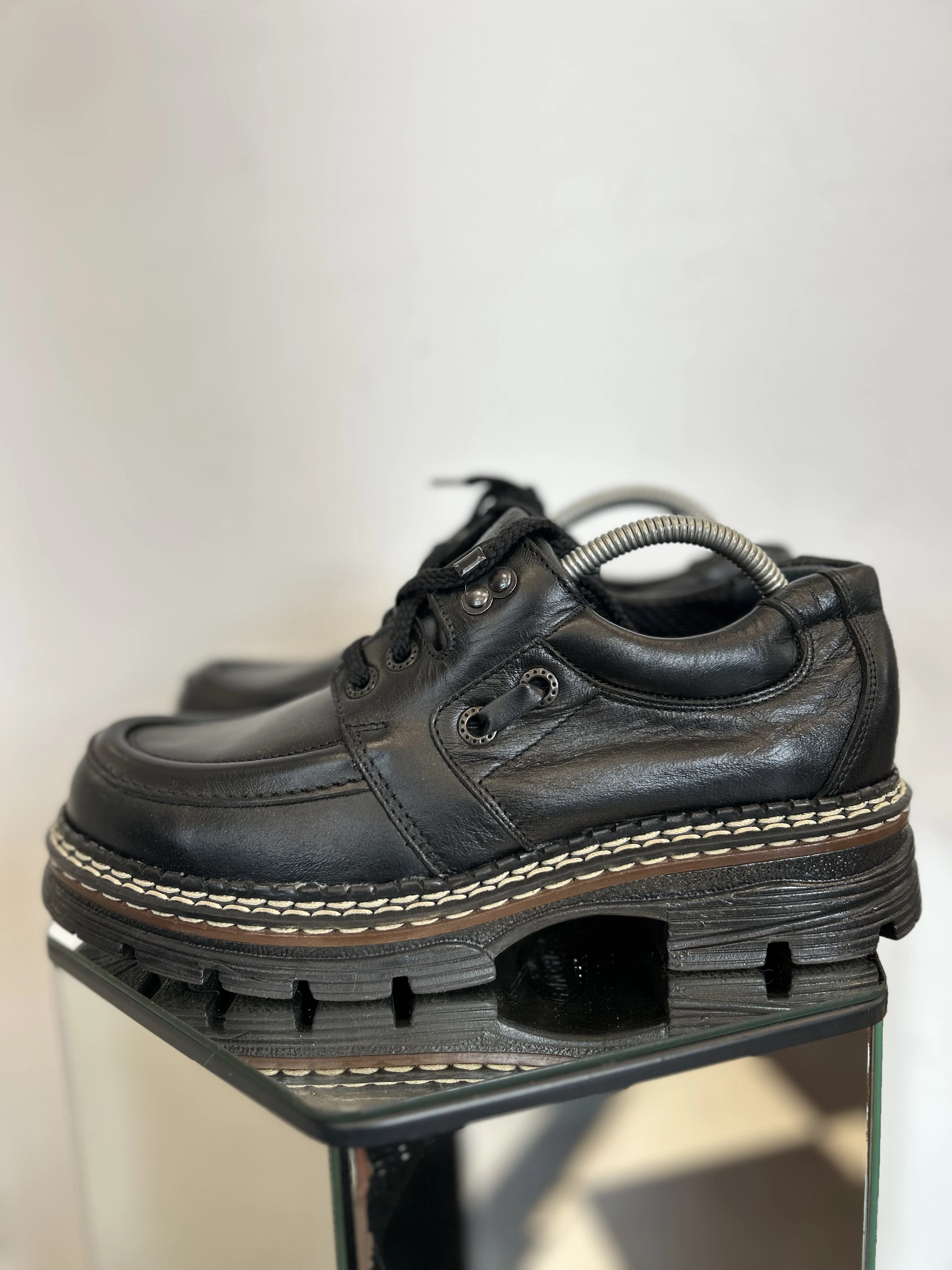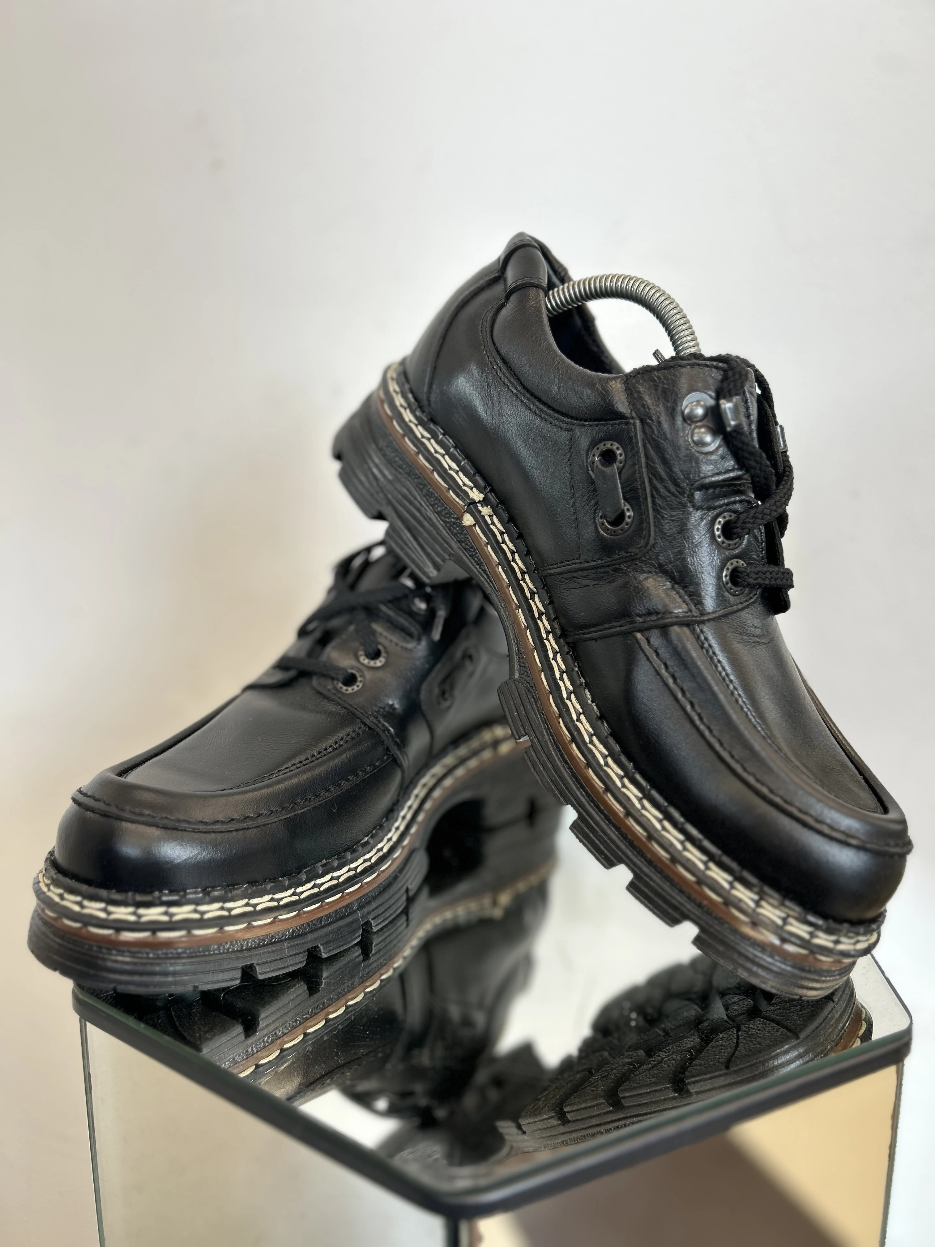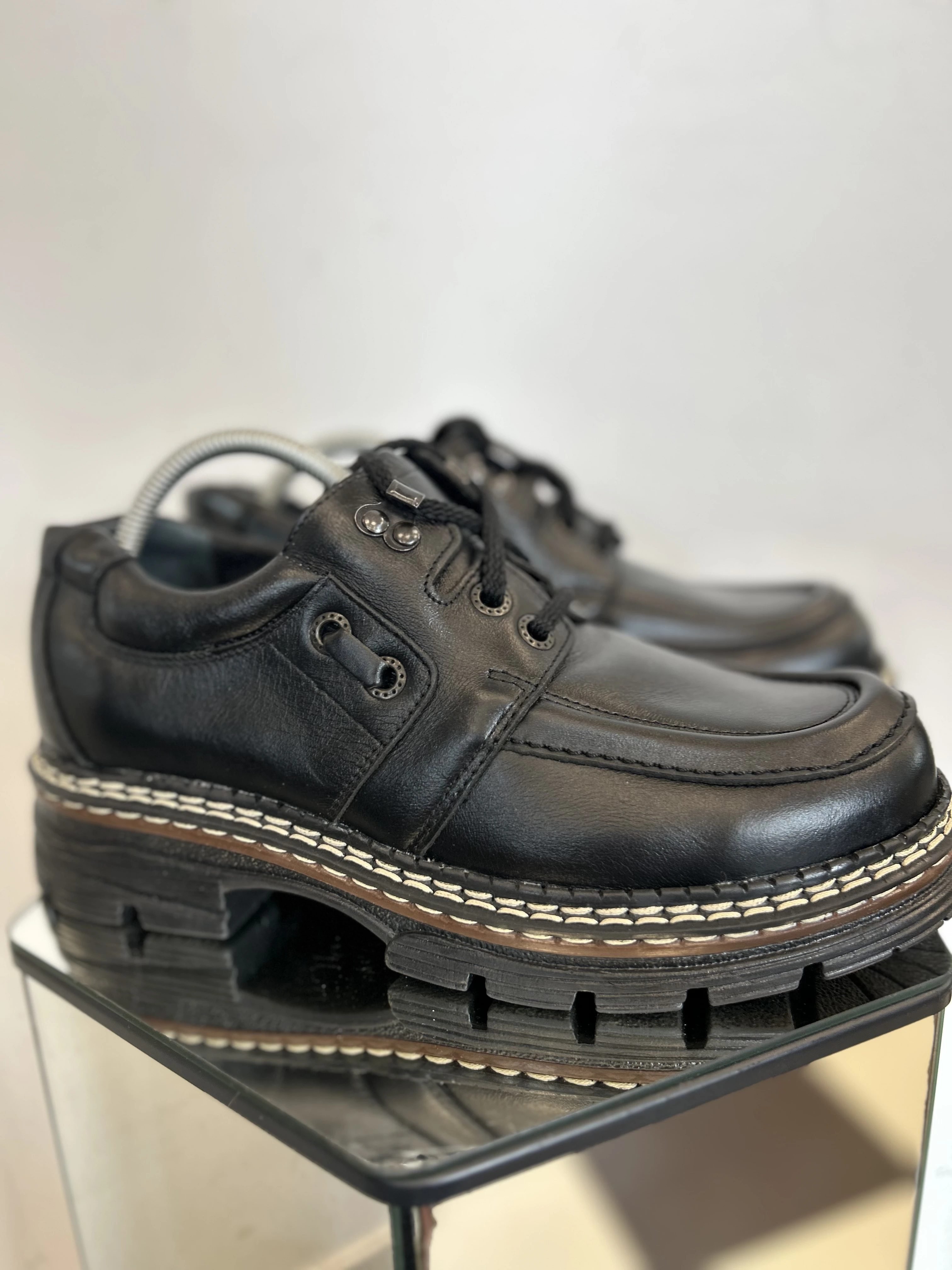 Wspaniałe, wysokiej jakości buty ze skóry naturalnej na platformie w typie klasycznych Martensów. Solidna podeszwa z tworzywa. Produkowane w Polsce w latach 90. Vintage Dead stock!