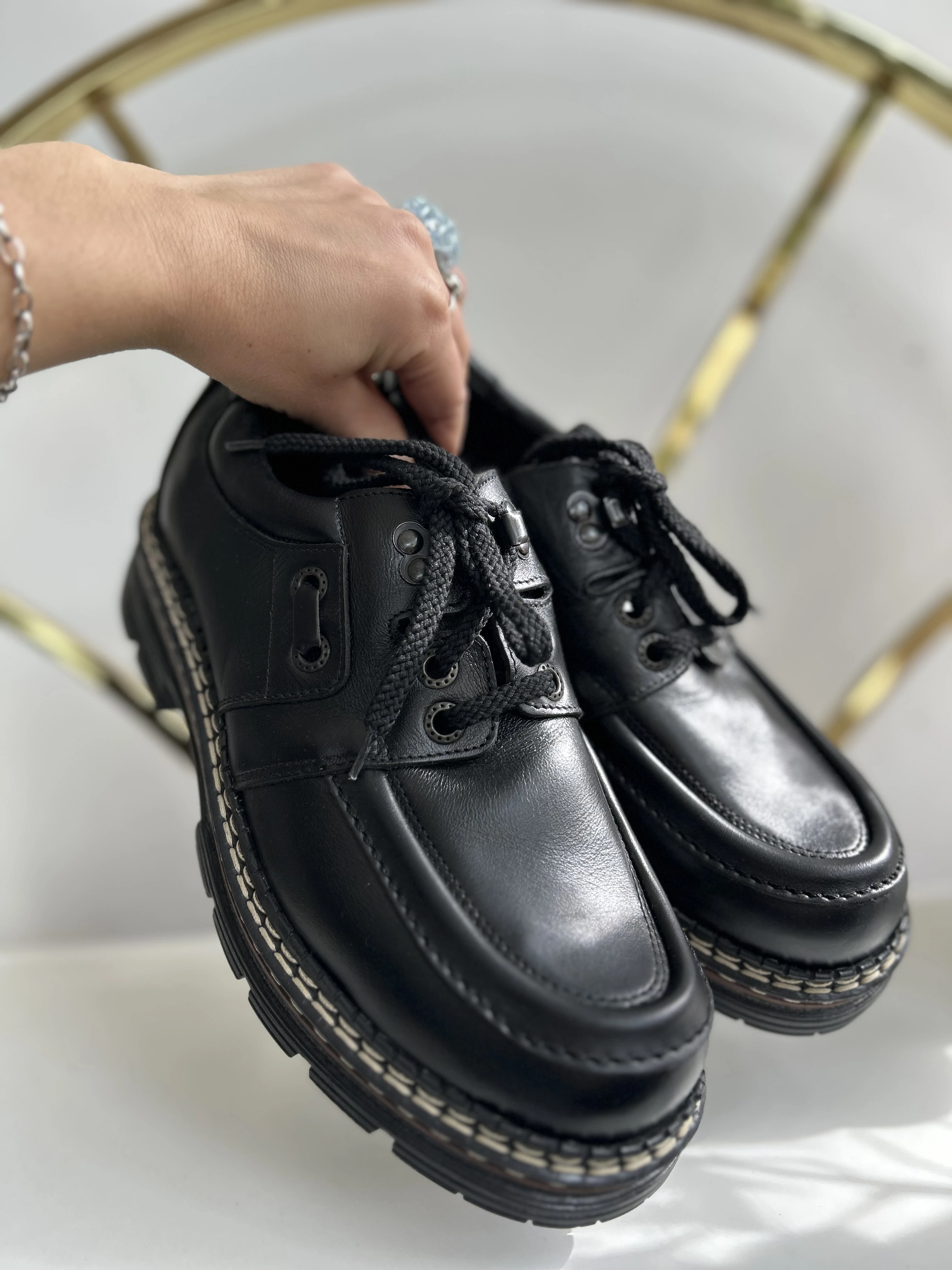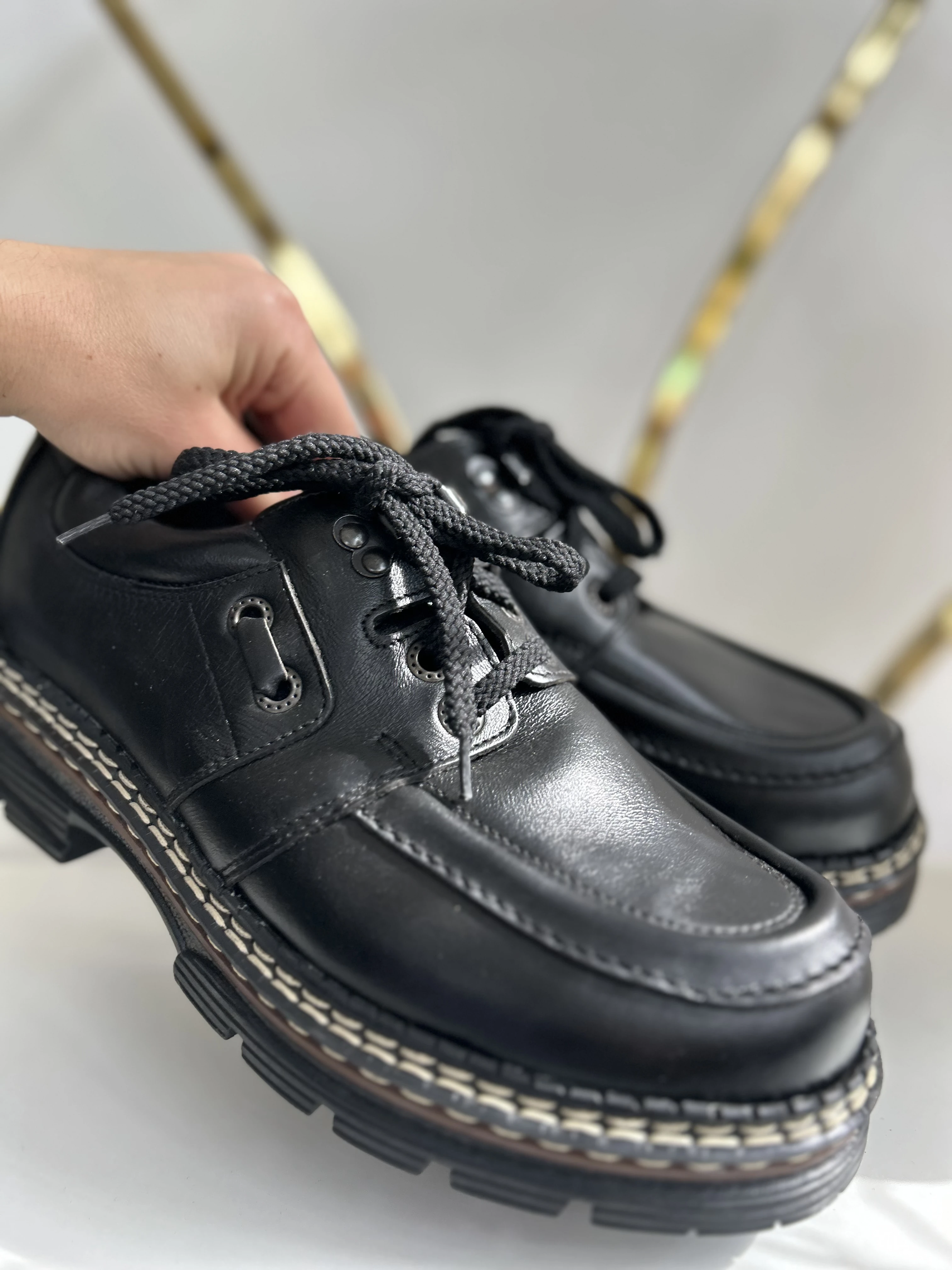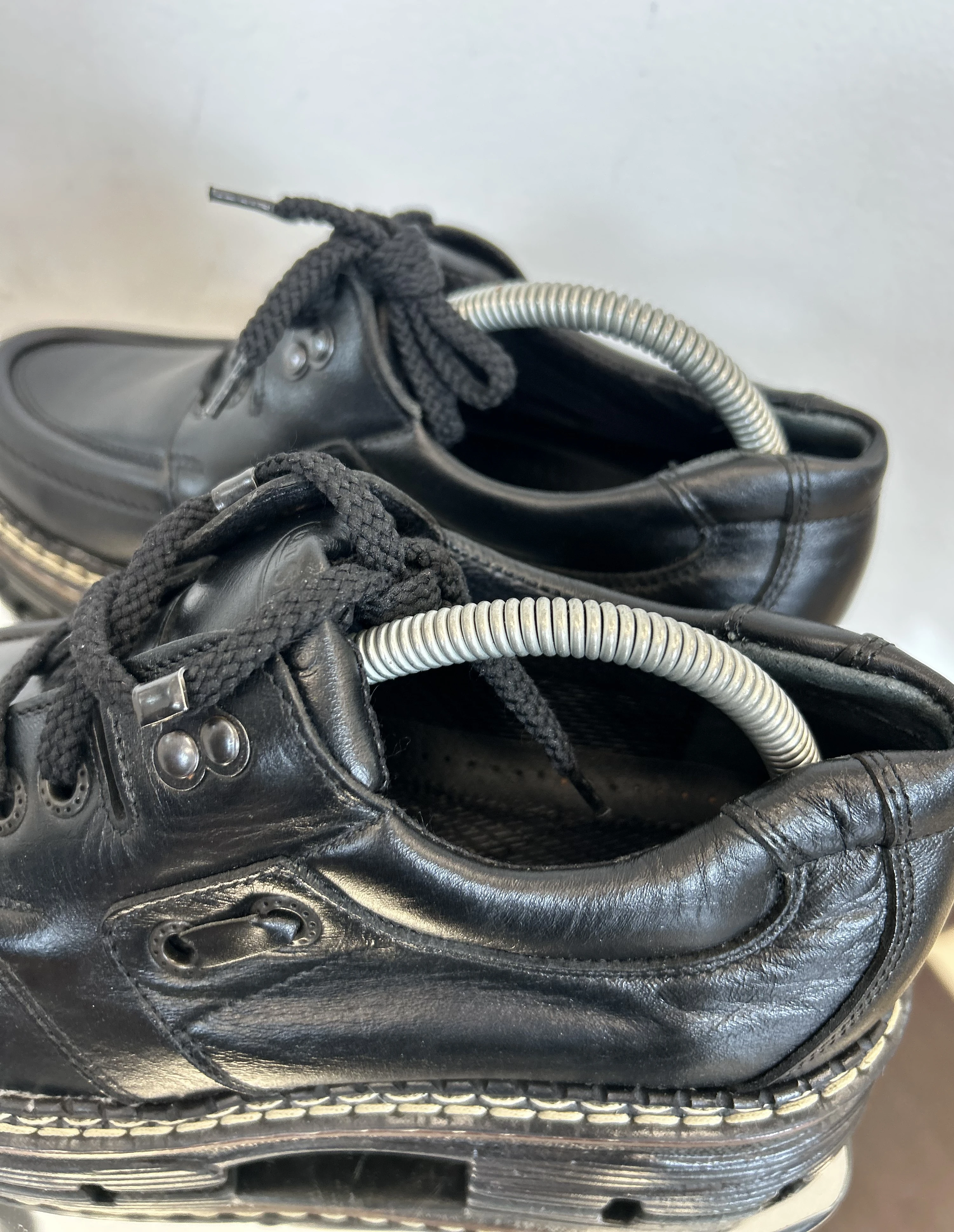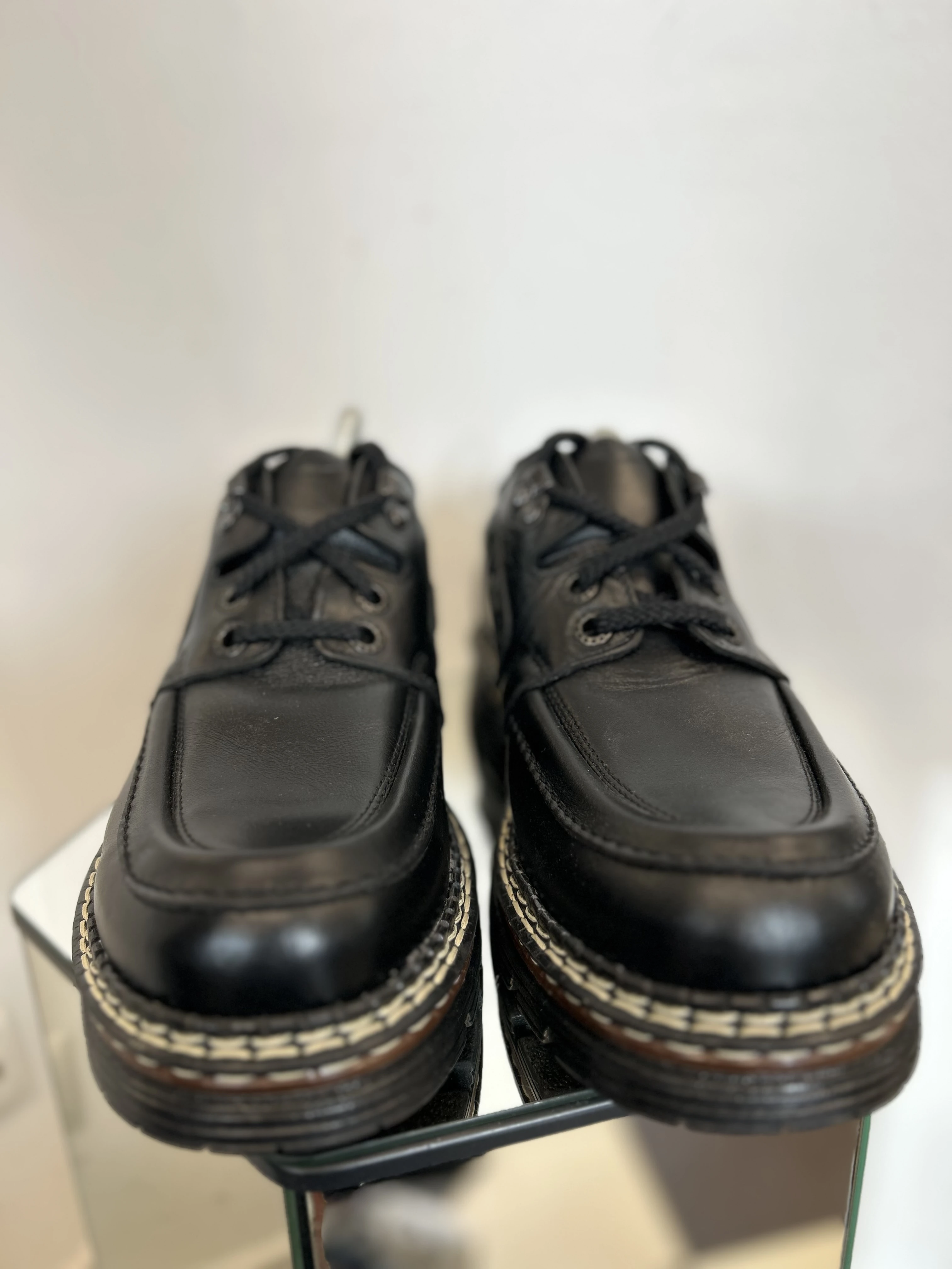 Wspaniałe, wysokiej jakości buty ze skóry naturalnej na platformie w typie klasycznych Martensów. Solidna podeszwa z tworzywa. Produkowane w Polsce w latach 90. Vintage Dead stock!