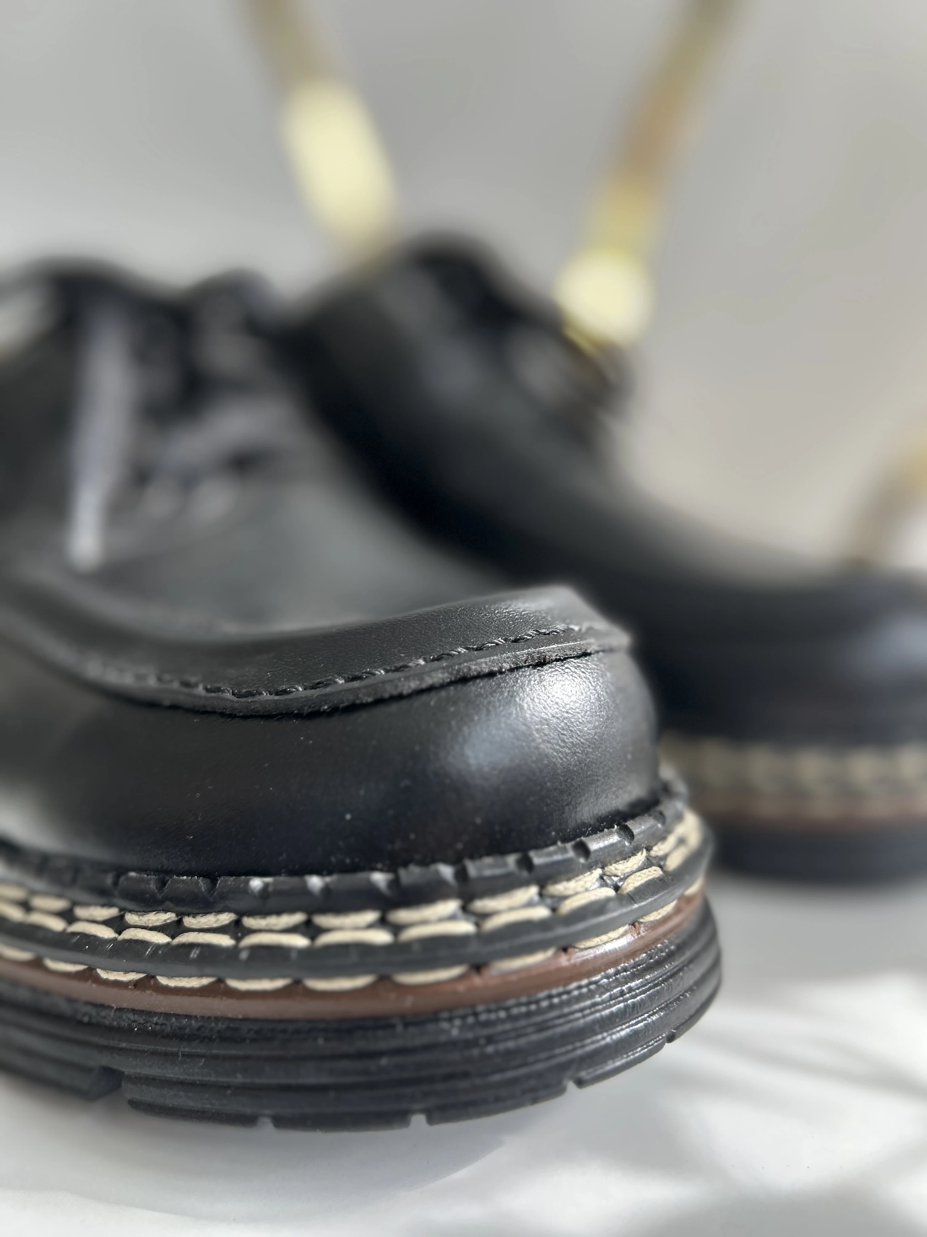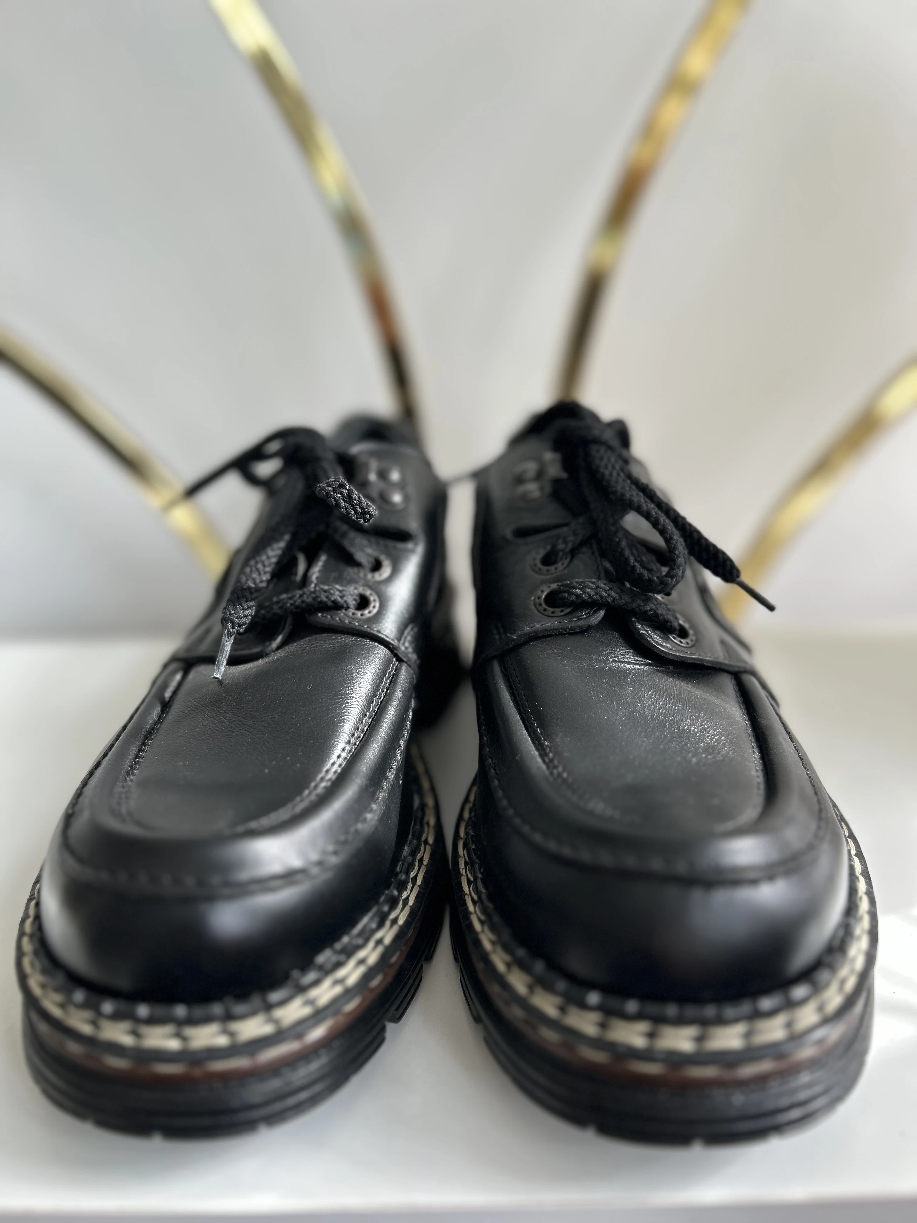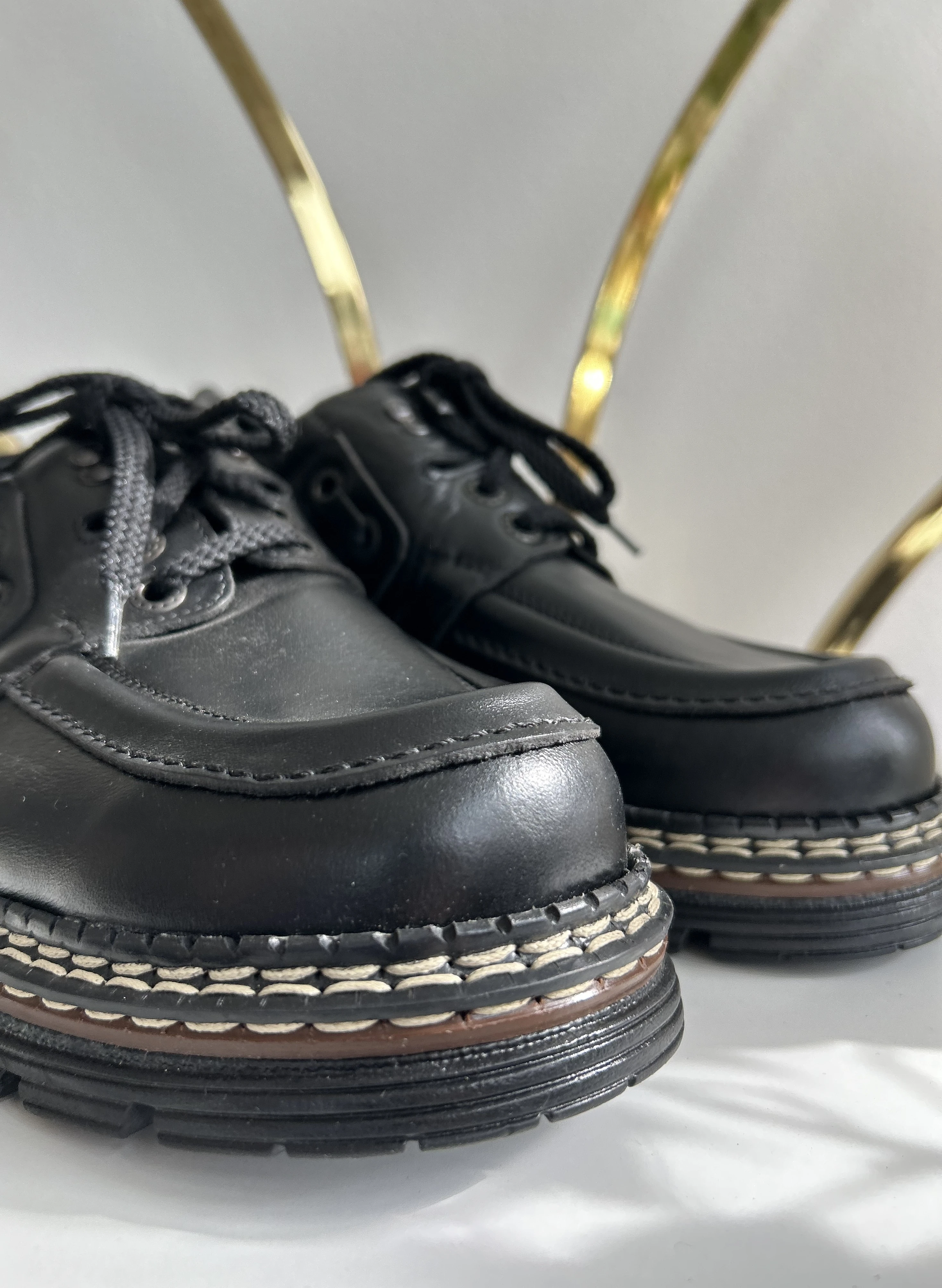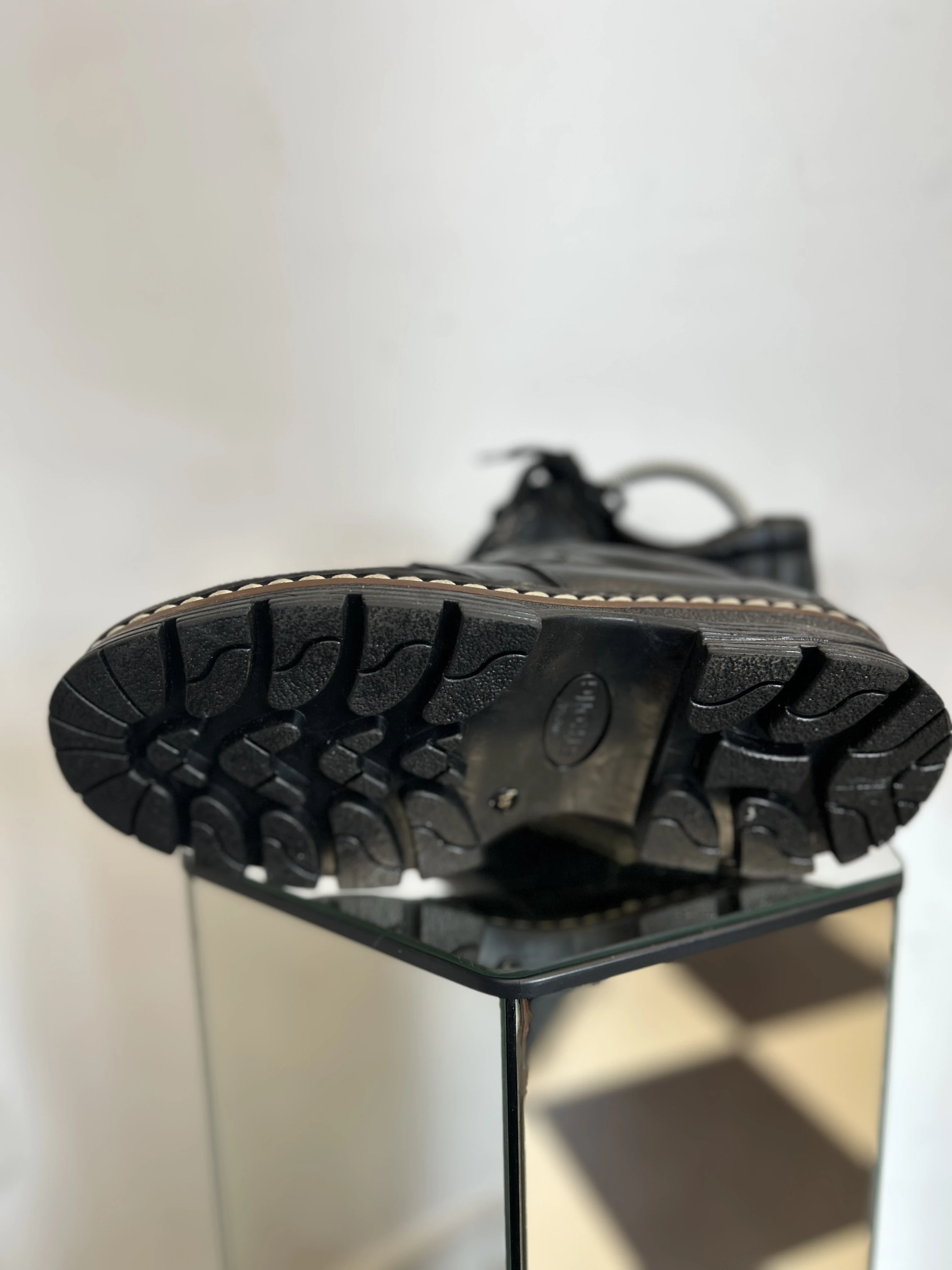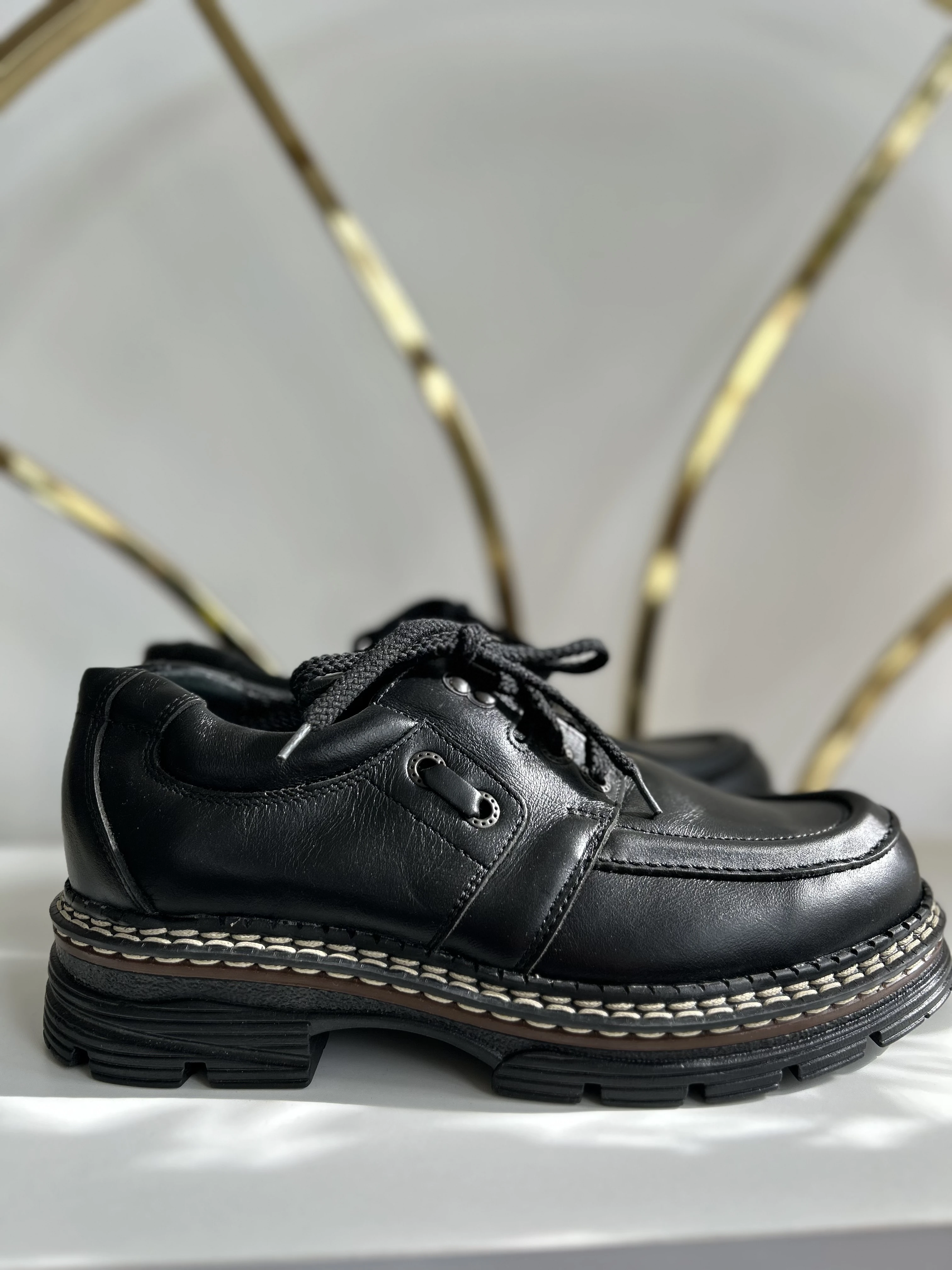 Wspaniałe, wysokiej jakości buty ze skóry naturalnej na platformie w typie klasycznych Martensów. Solidna podeszwa z tworzywa. Produkowane w Polsce w latach 90. Vintage Dead stock!
