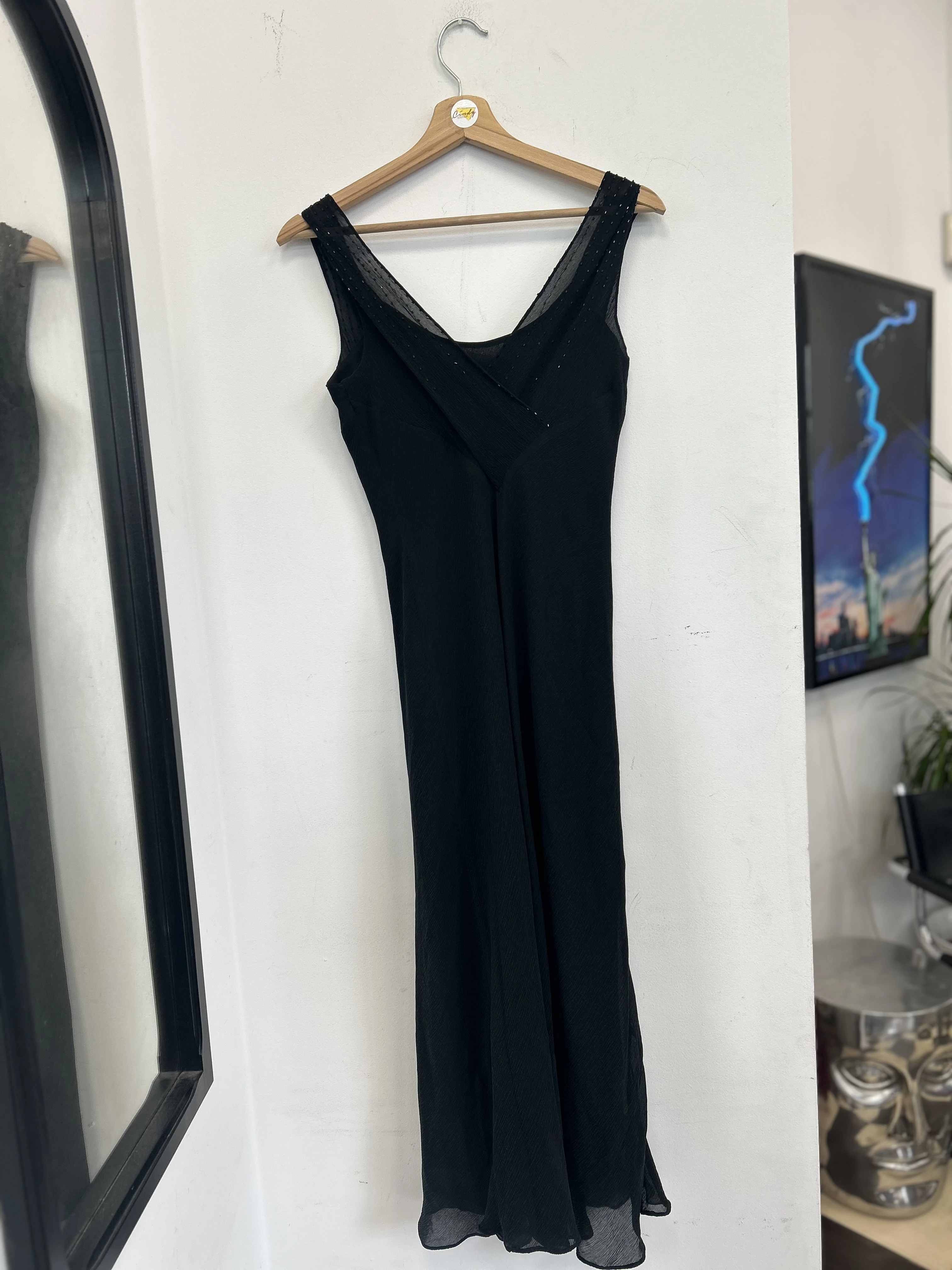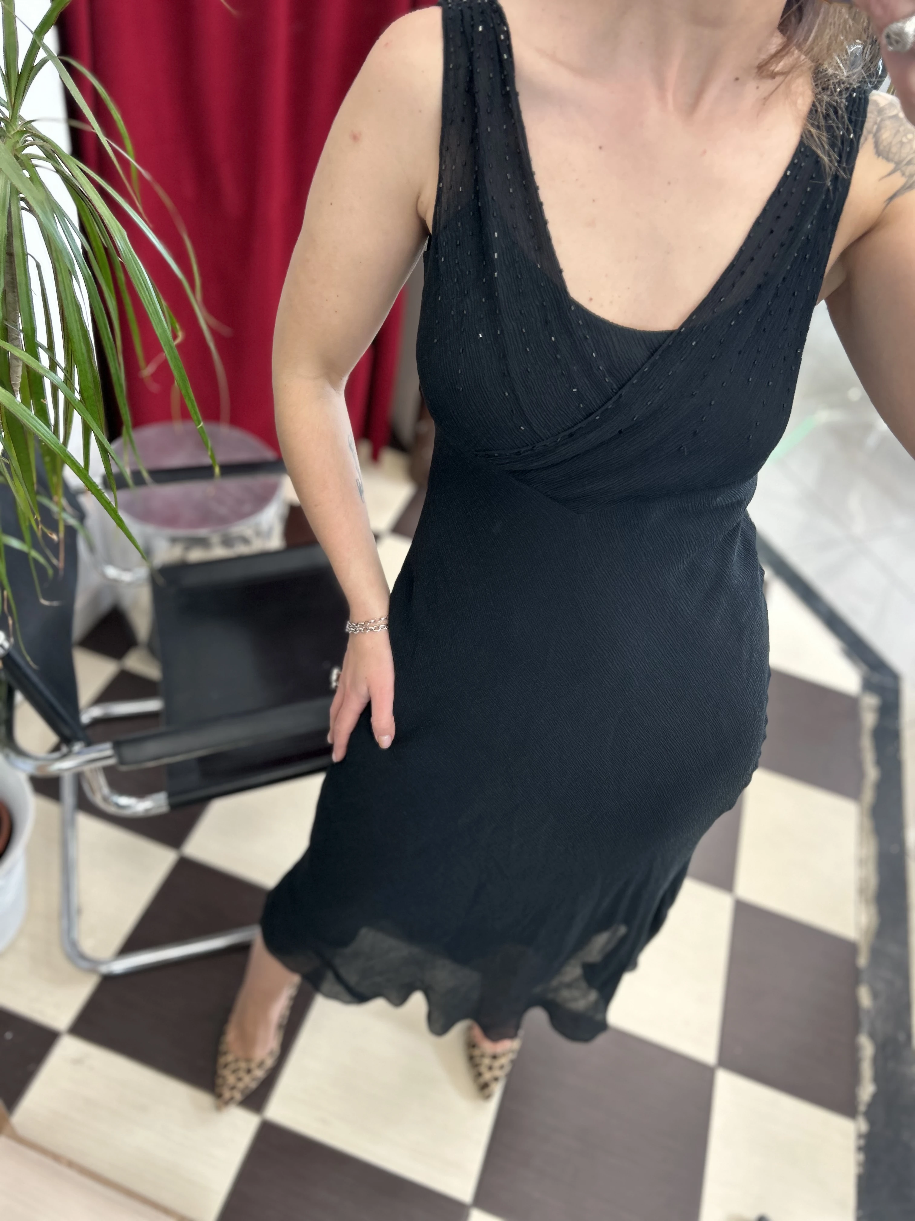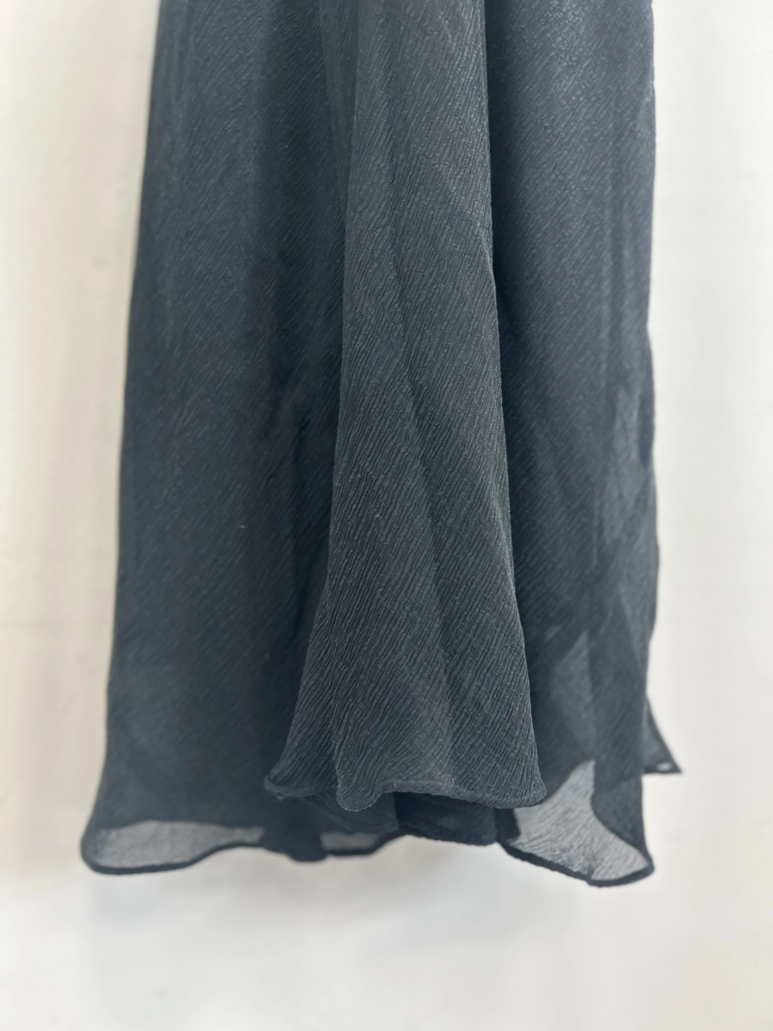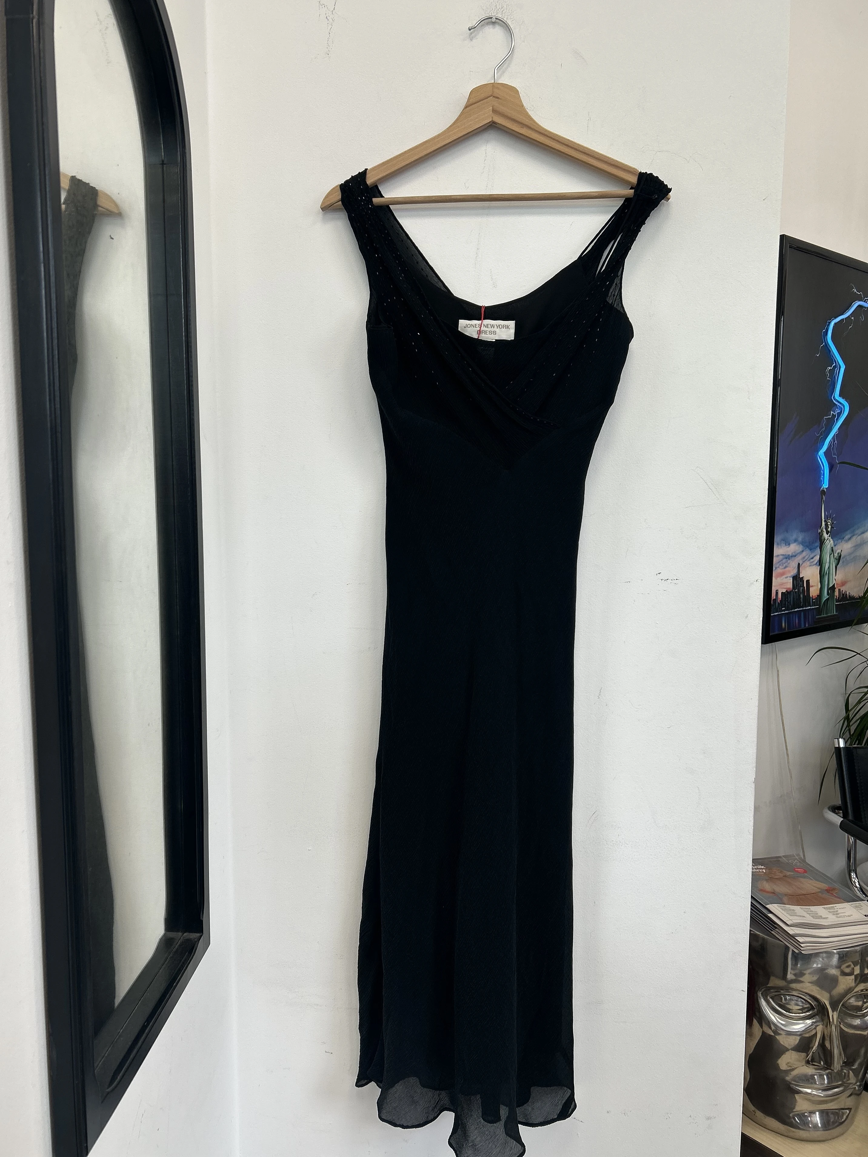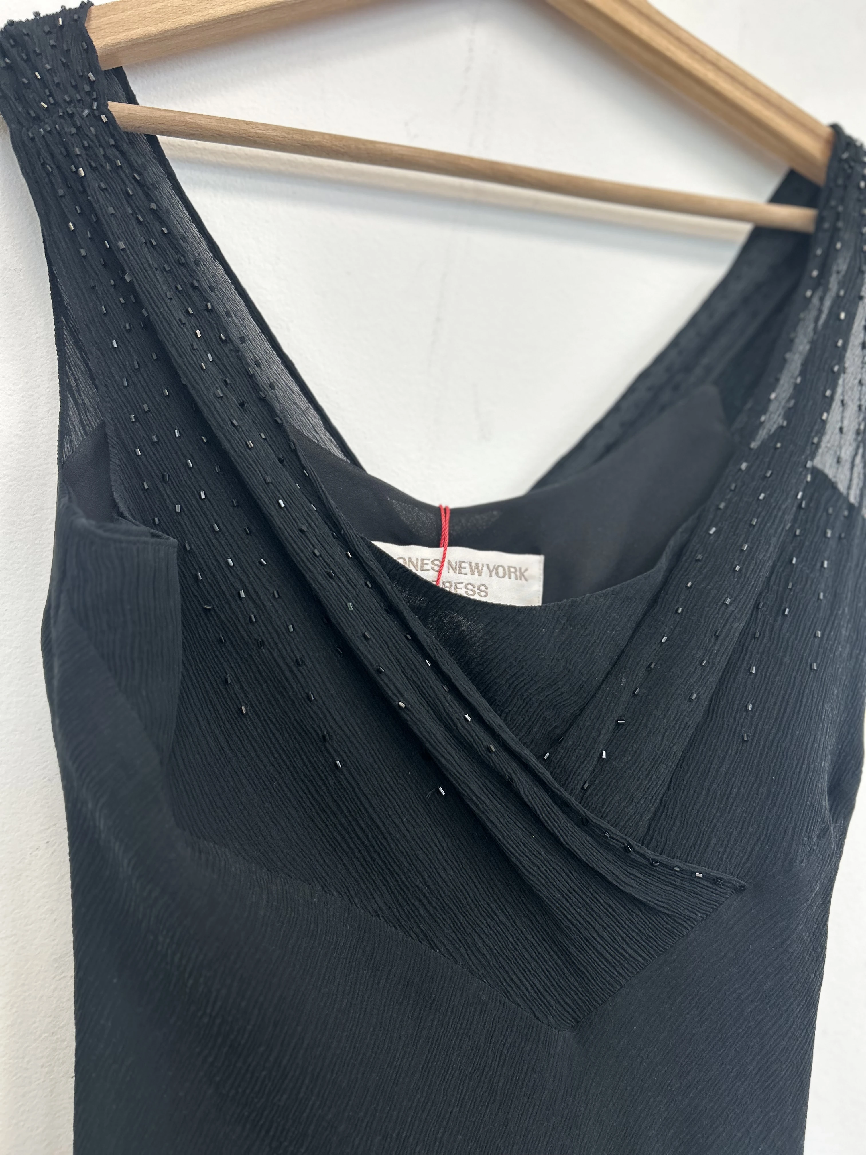 Czarna jedwabna sukienka Jones New York. Góra zdobiona koralikami. Wykonana z dwóch warstw jedwabiu : solidnej podszewki oraz transparentnej mgiełki. Sukienka nie prześwituje. Pięknie układa się na ciele.