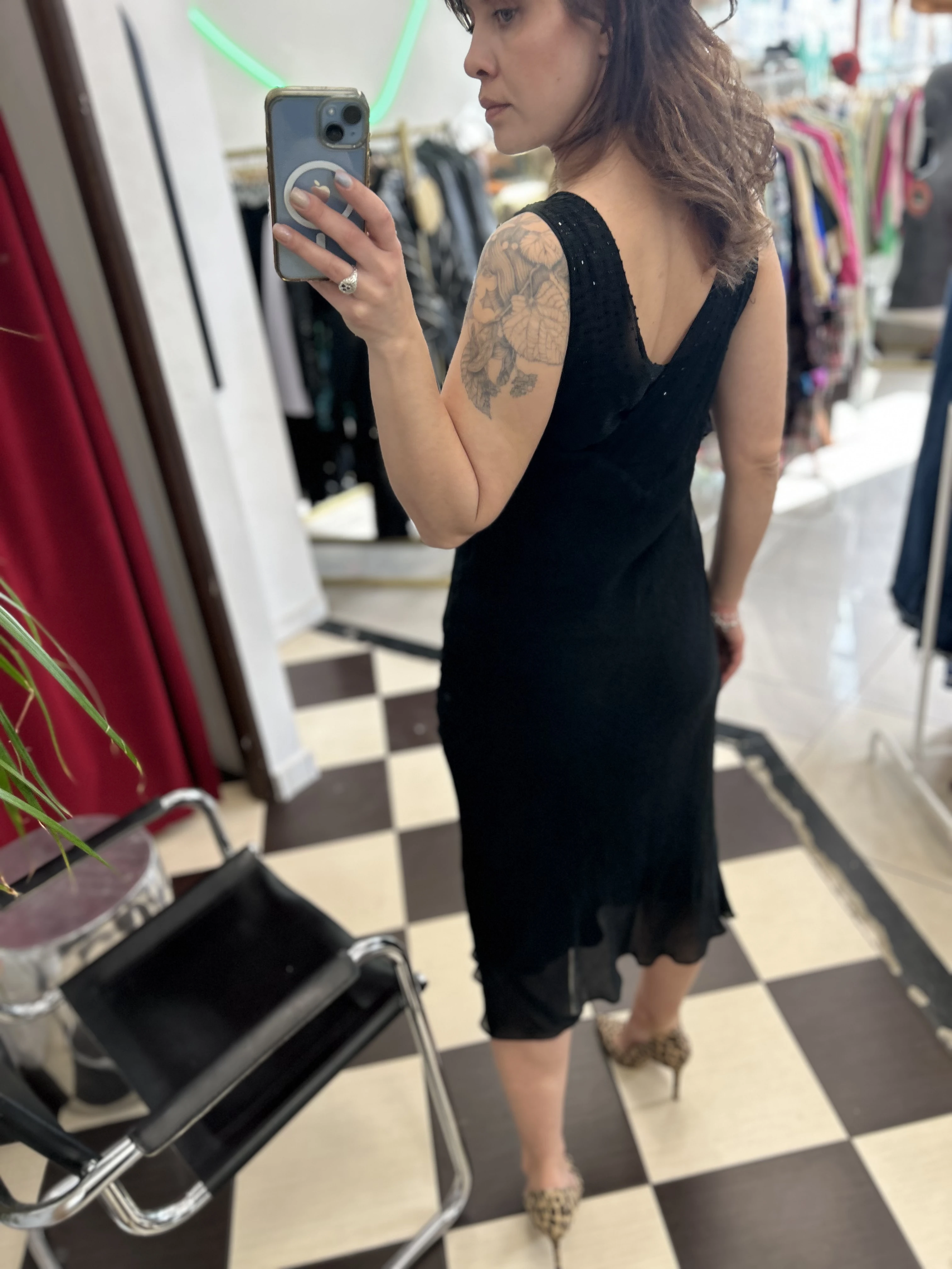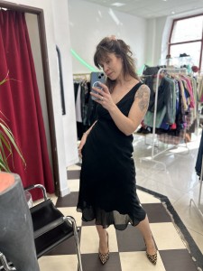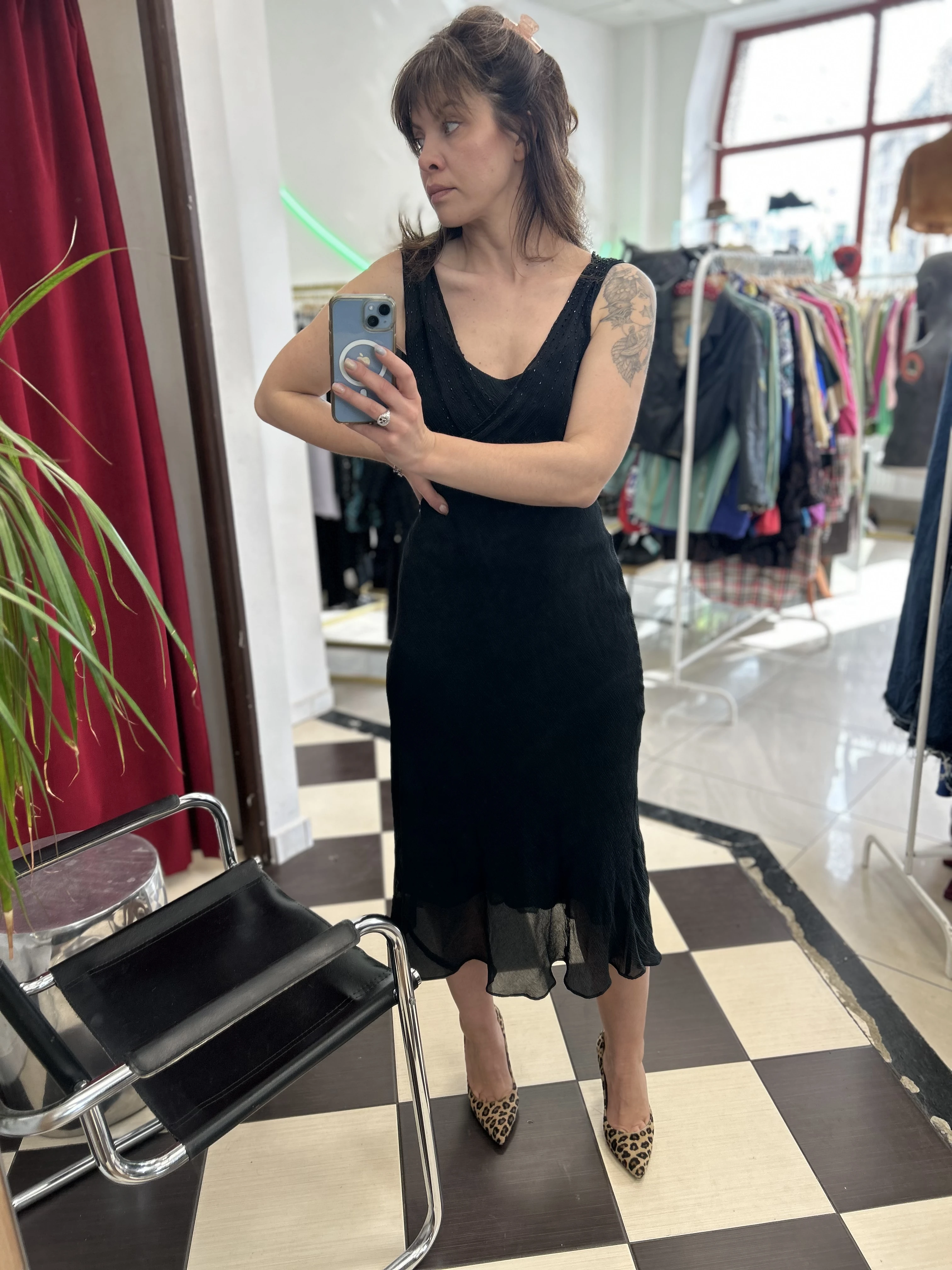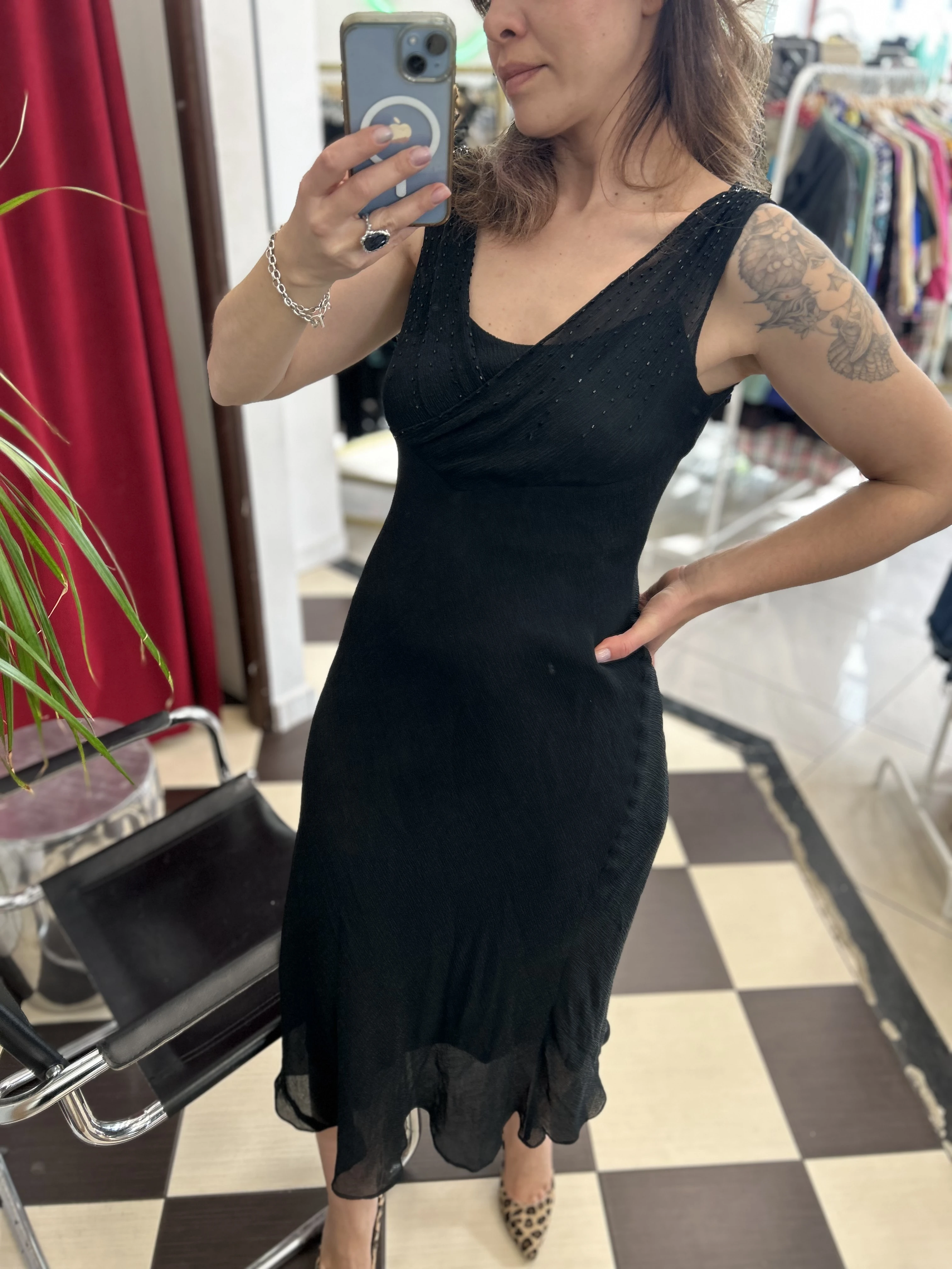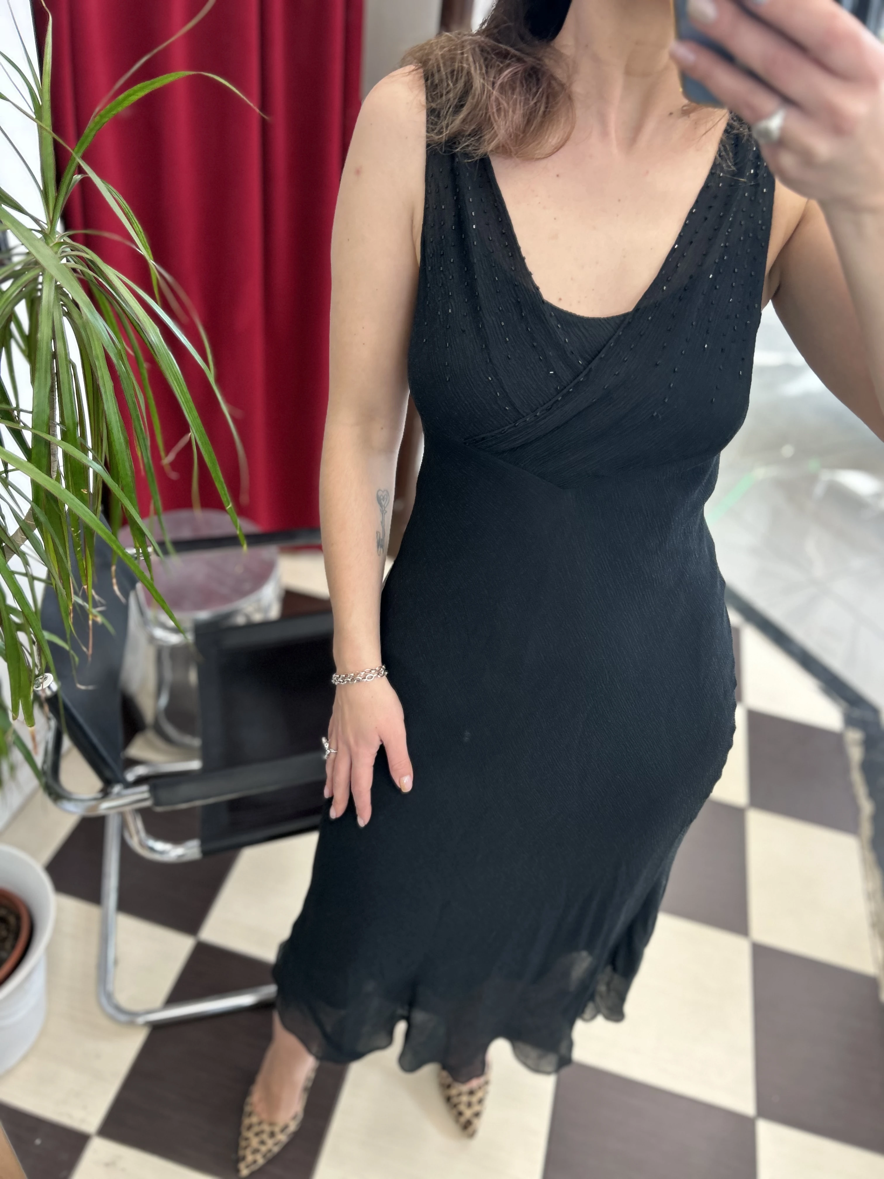 Czarna jedwabna sukienka Jones New York. Góra zdobiona koralikami. Wykonana z dwóch warstw jedwabiu : solidnej podszewki oraz transparentnej mgiełki. Sukienka nie prześwituje. Pięknie układa się na ciele.