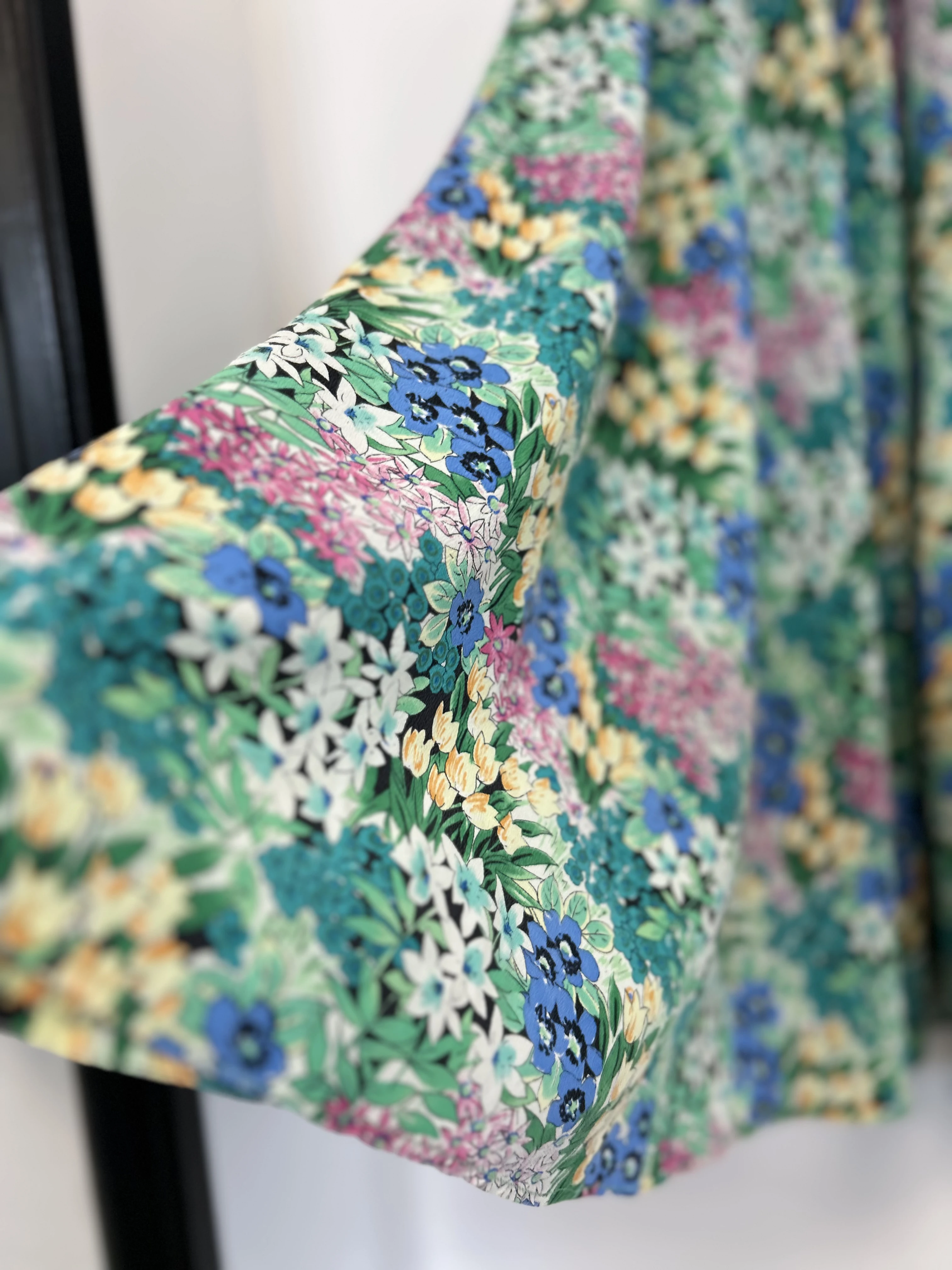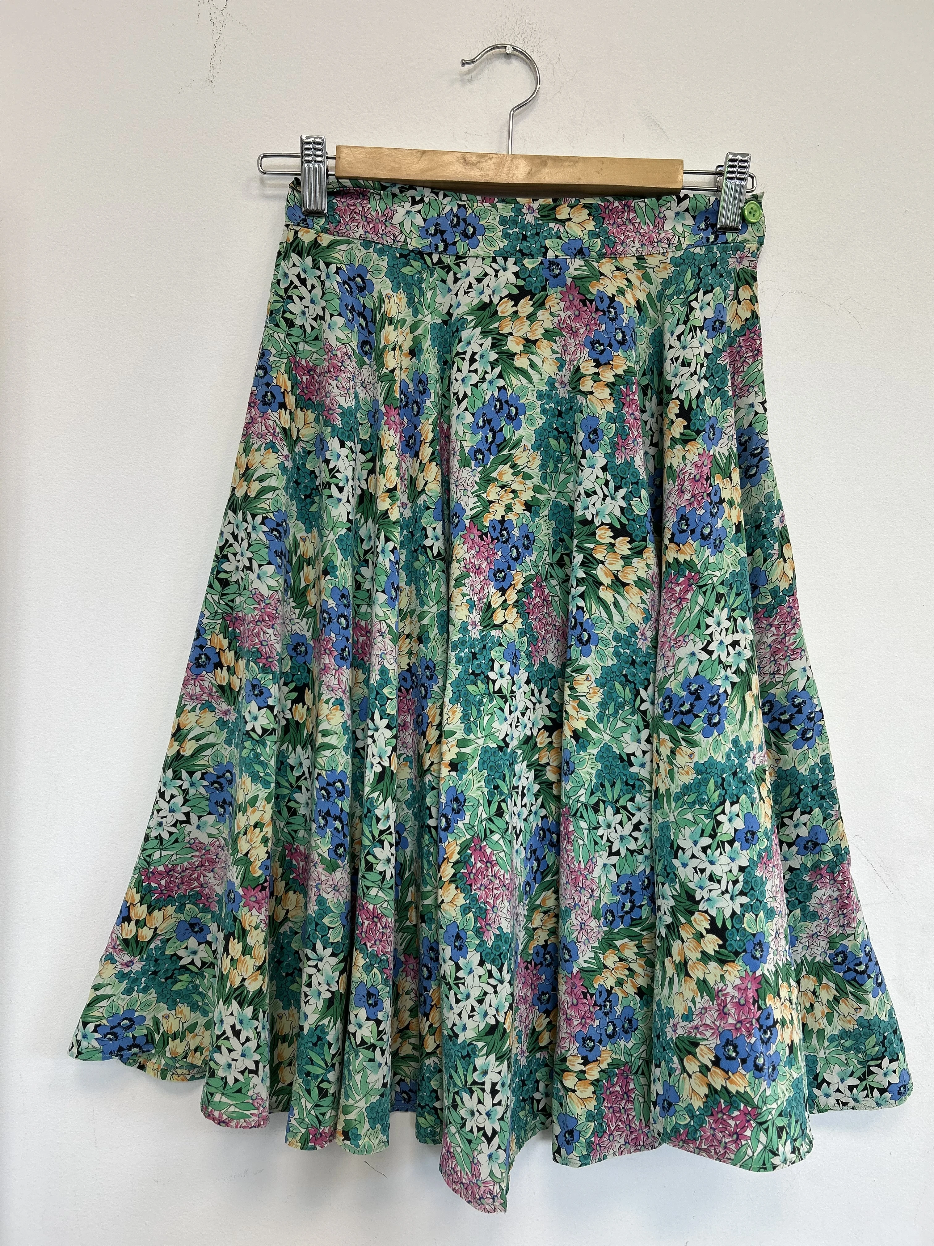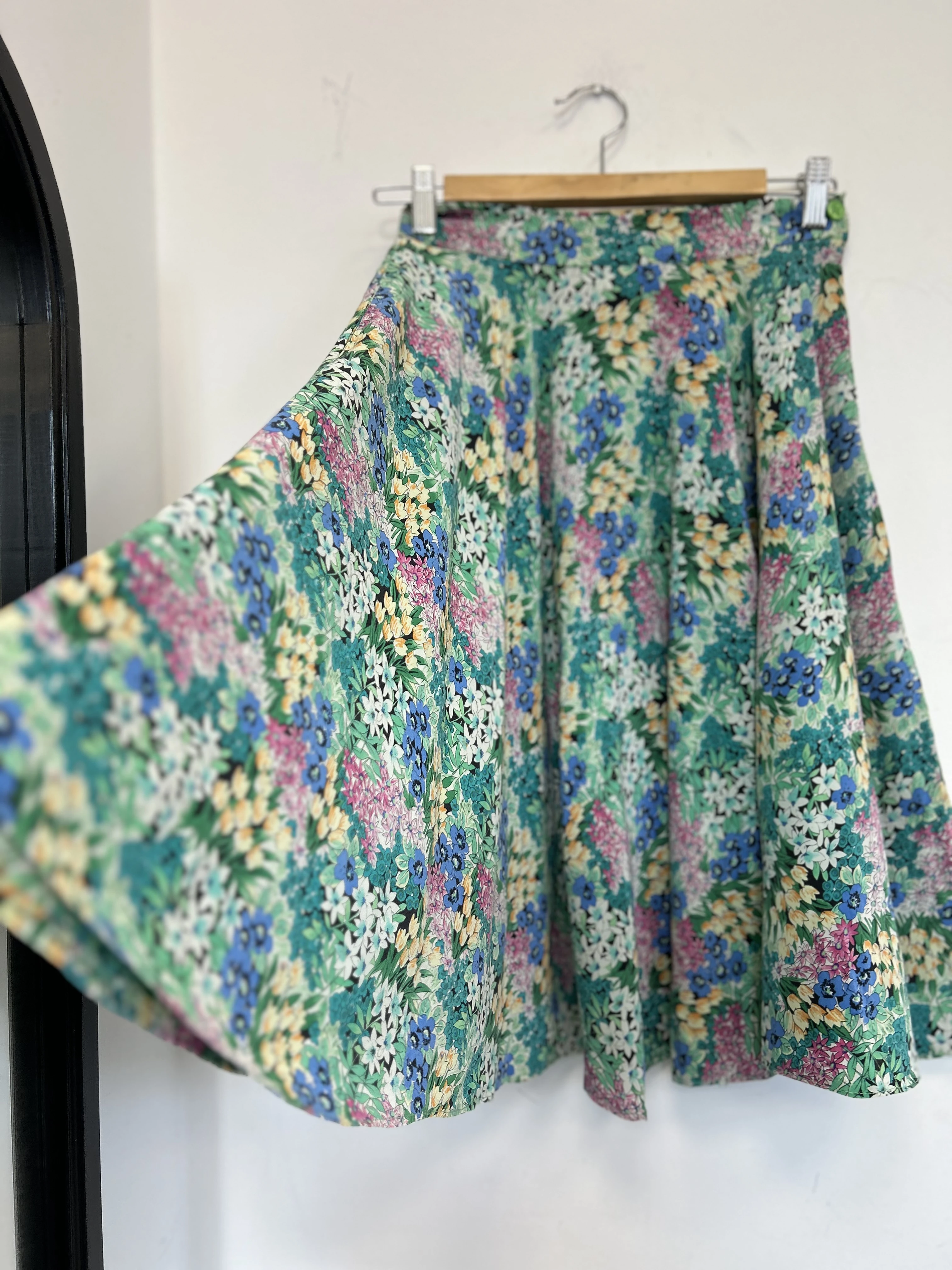 Kwiecista, lekka i zwiewna spódnica vintage z jedwabiu. Spódnica nie posiada podszewki. Zapinana z boku na zamek. Spódnica była skracana.