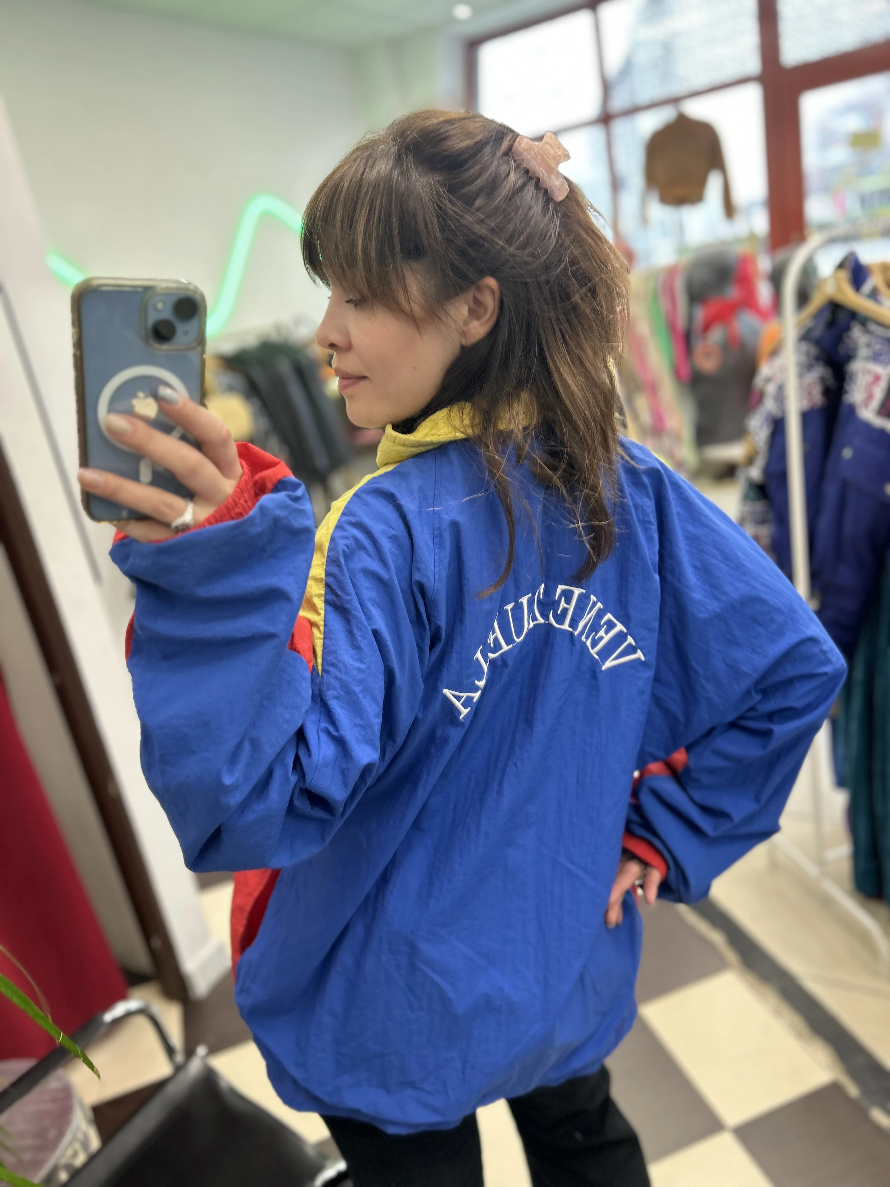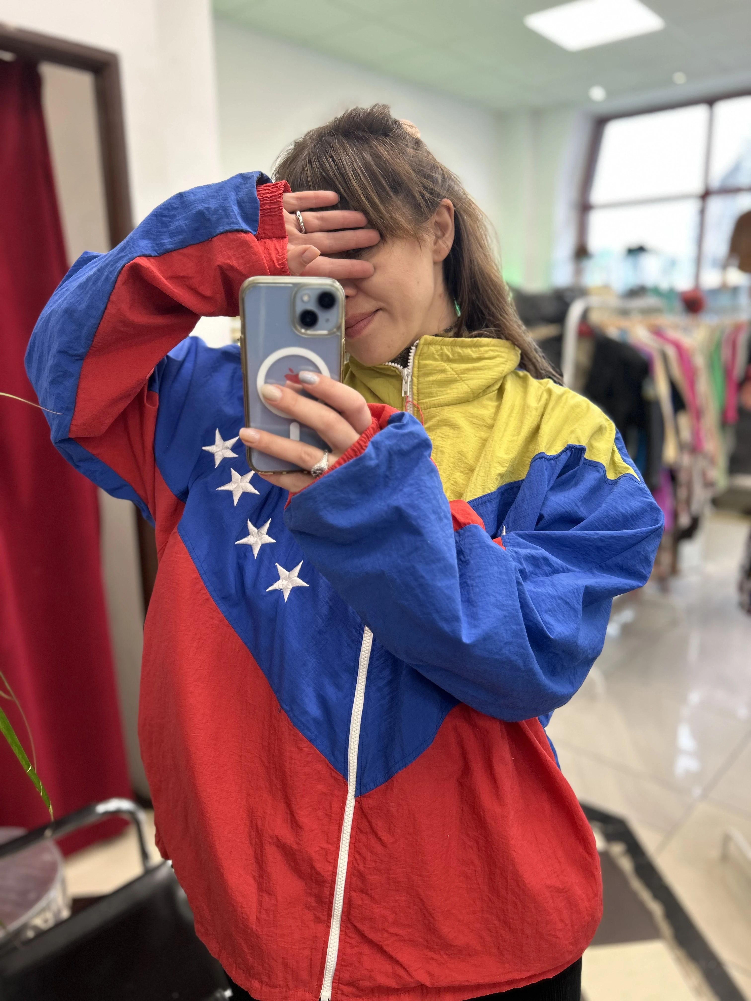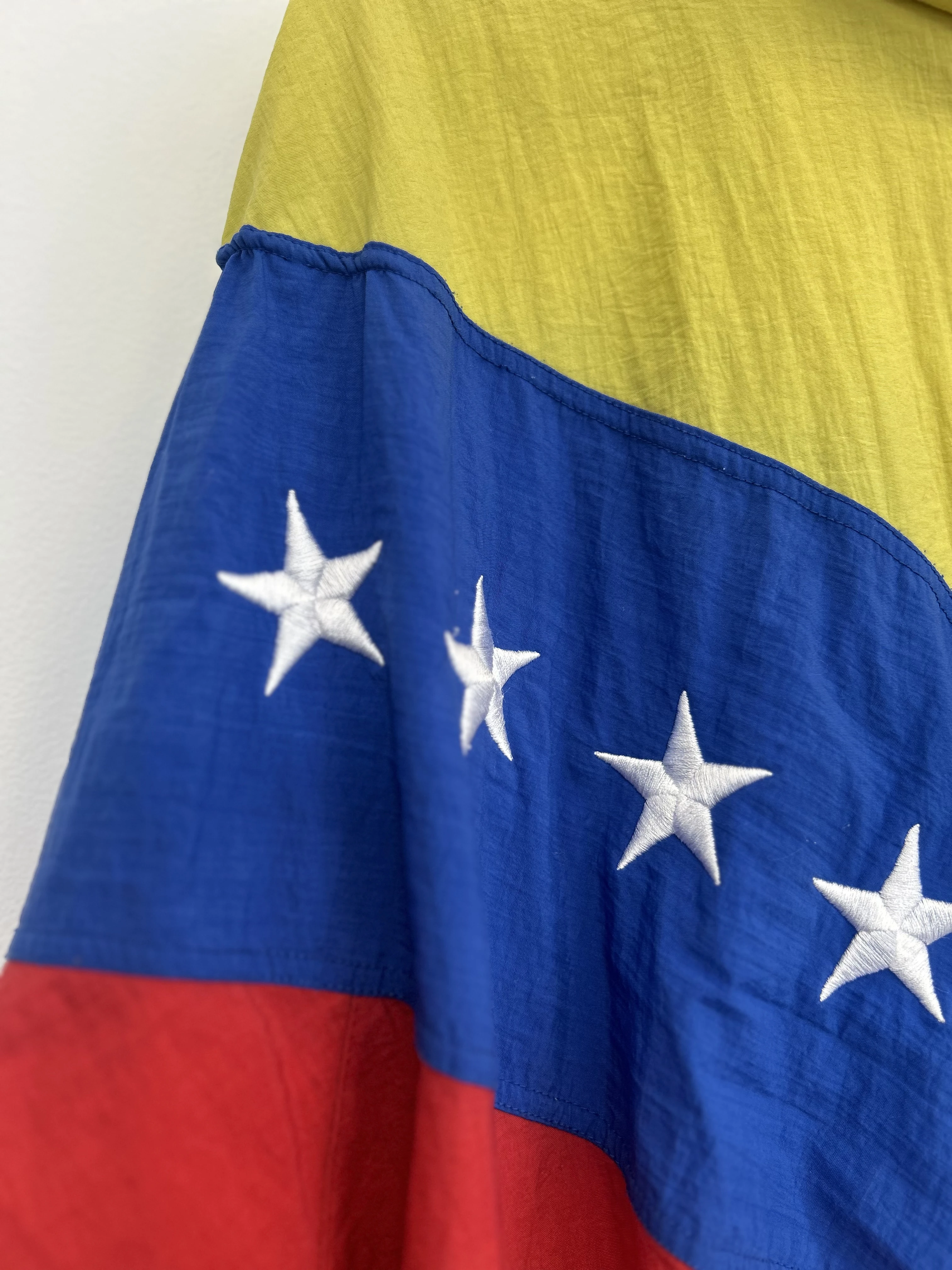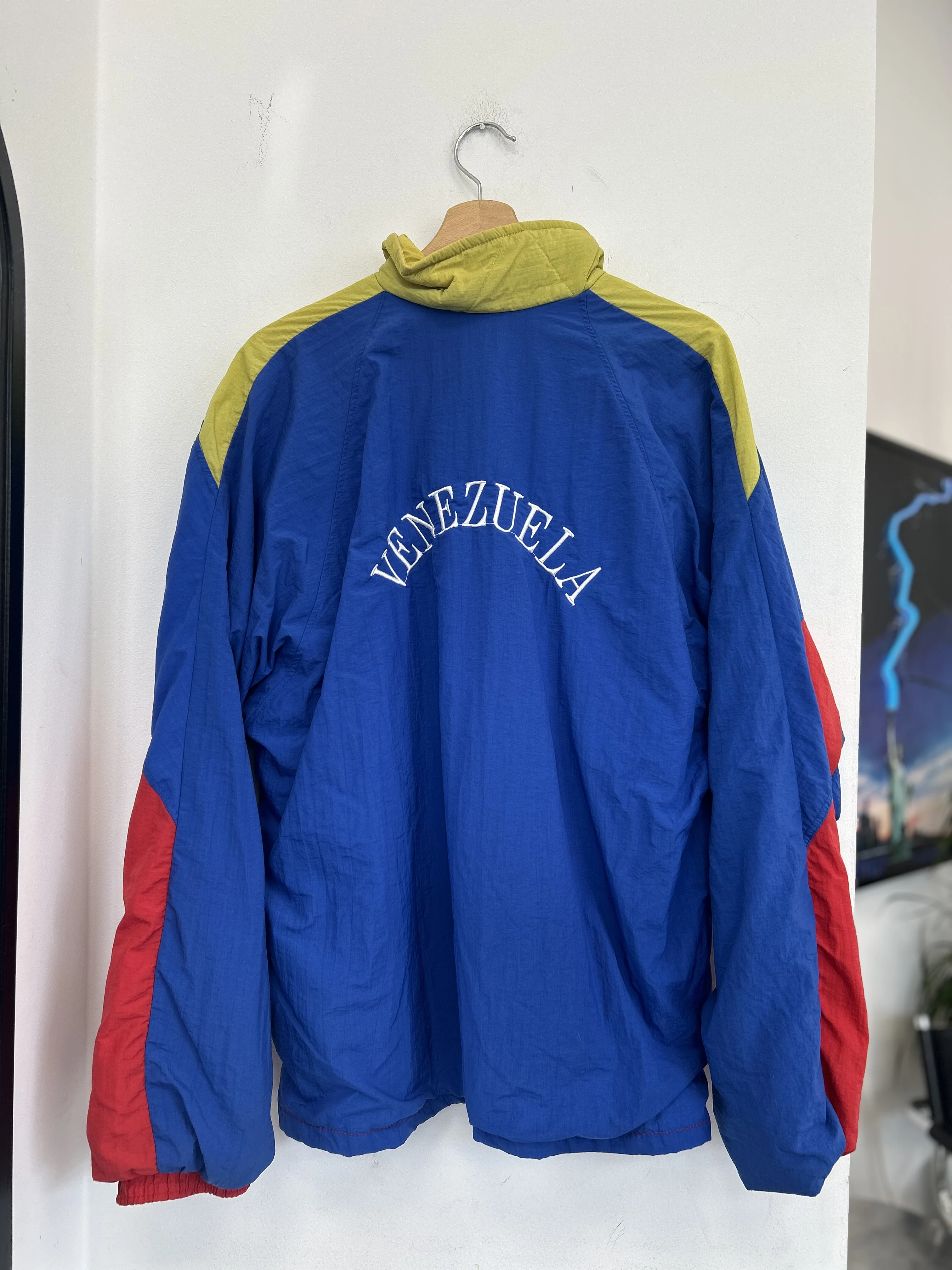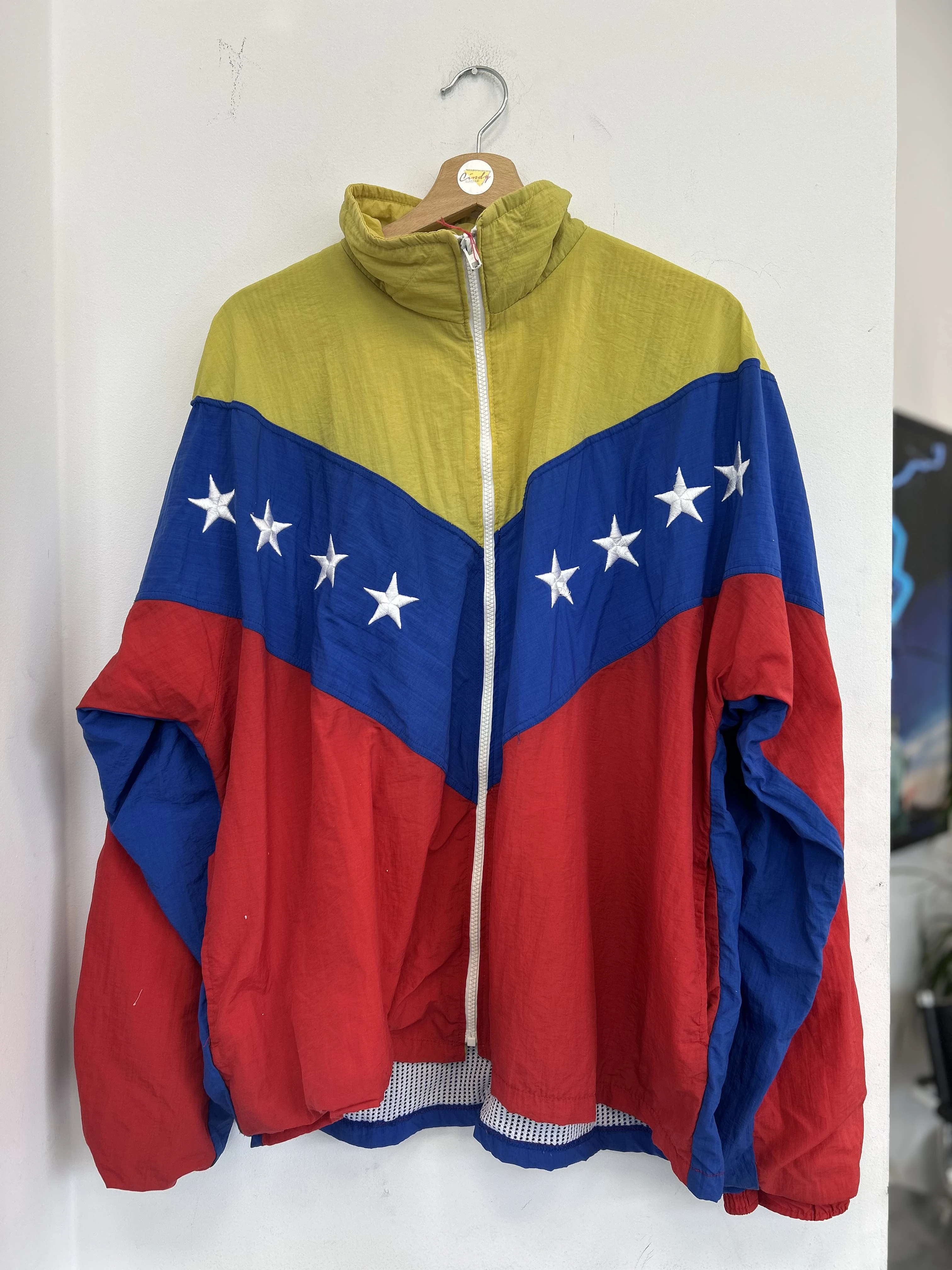 Kolorowa kurtka kreszowa vintage Venezuela. Kurtka z podszewką z siateczki. Na dole brak ściągacza. Posiada dwie kieszenie.