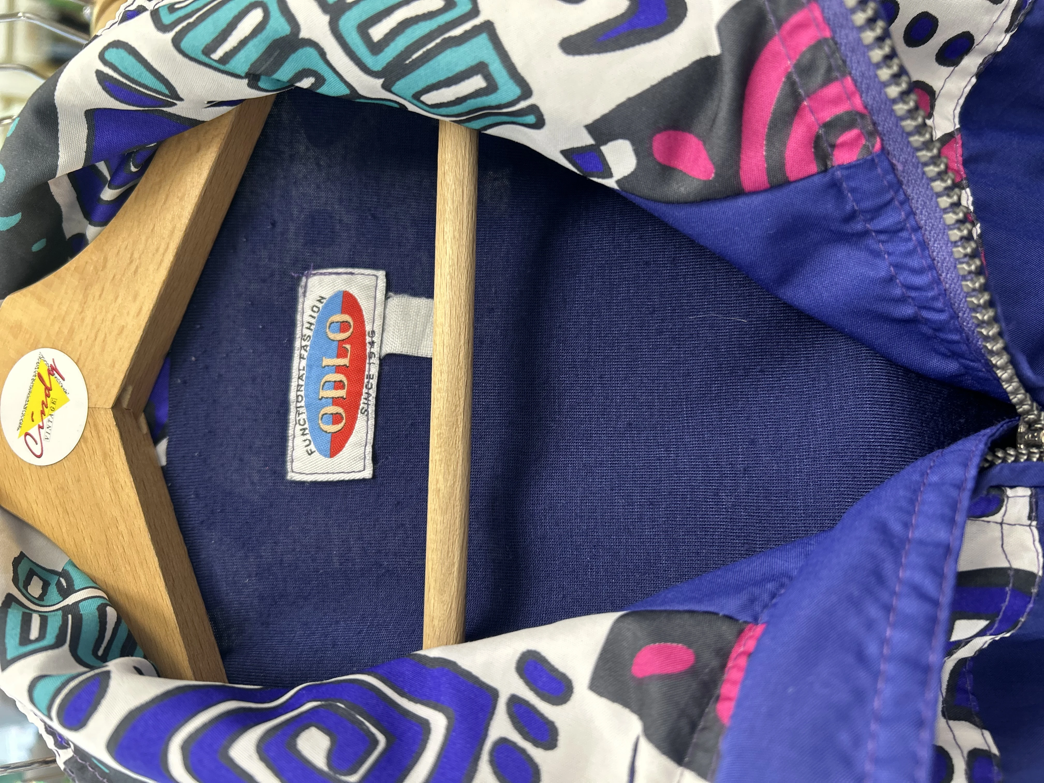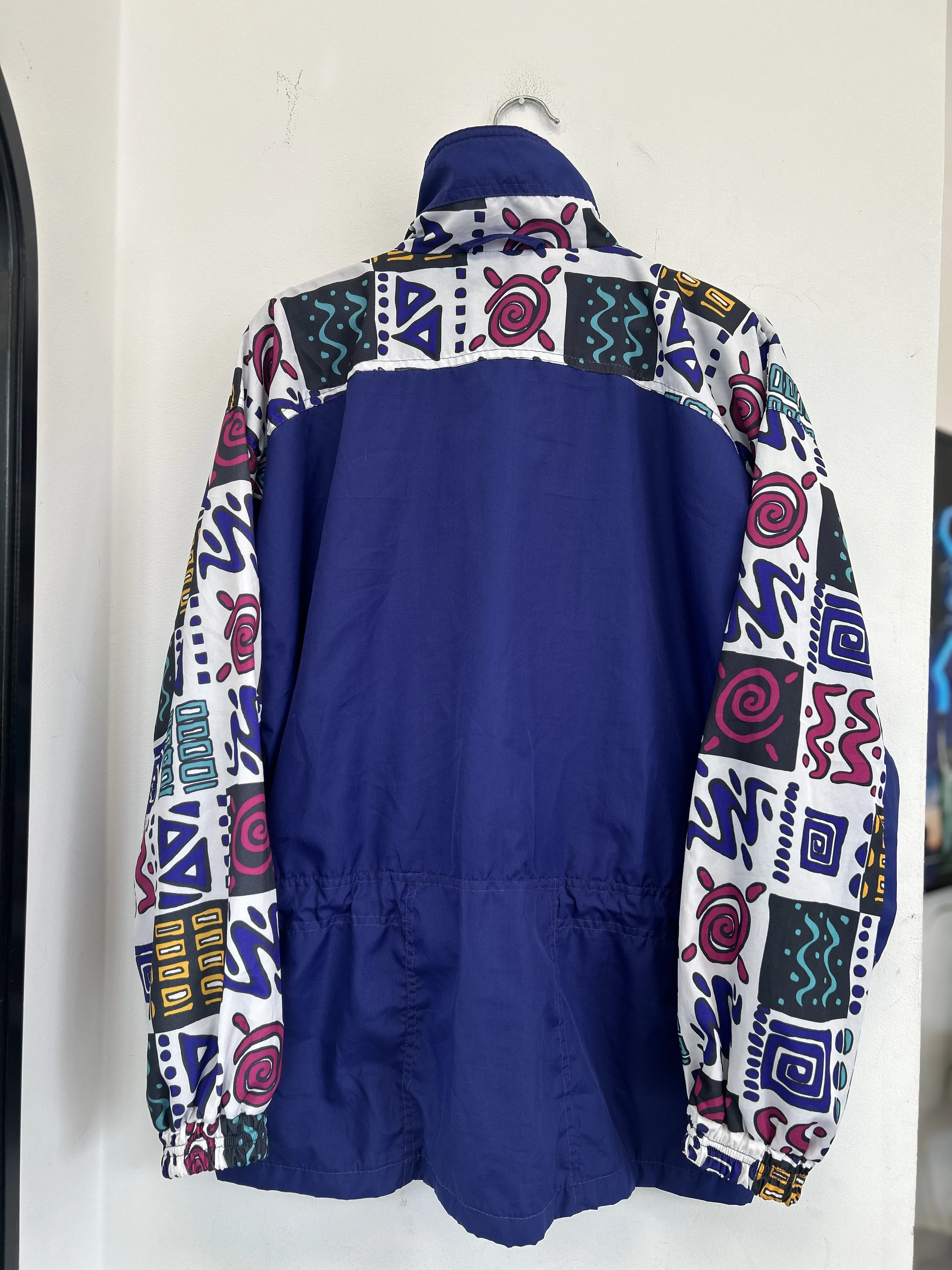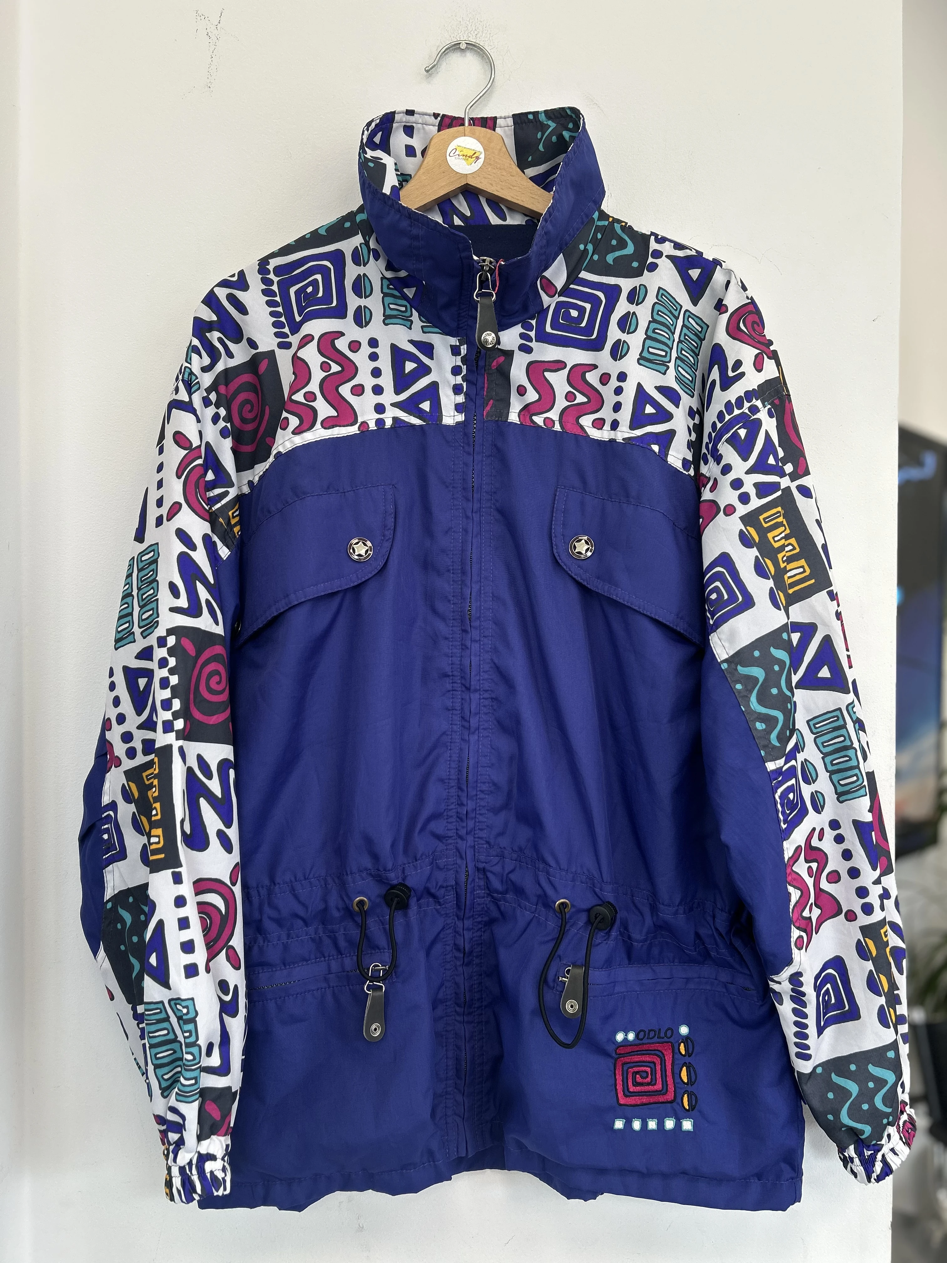 Kolorowa, wzorzysta kurtka vintage z lat 90. Odlo. Kurtka zapinana na zamek. Posiada podszewkę, ściągacz w pasie i 4 solidne kieszenie.