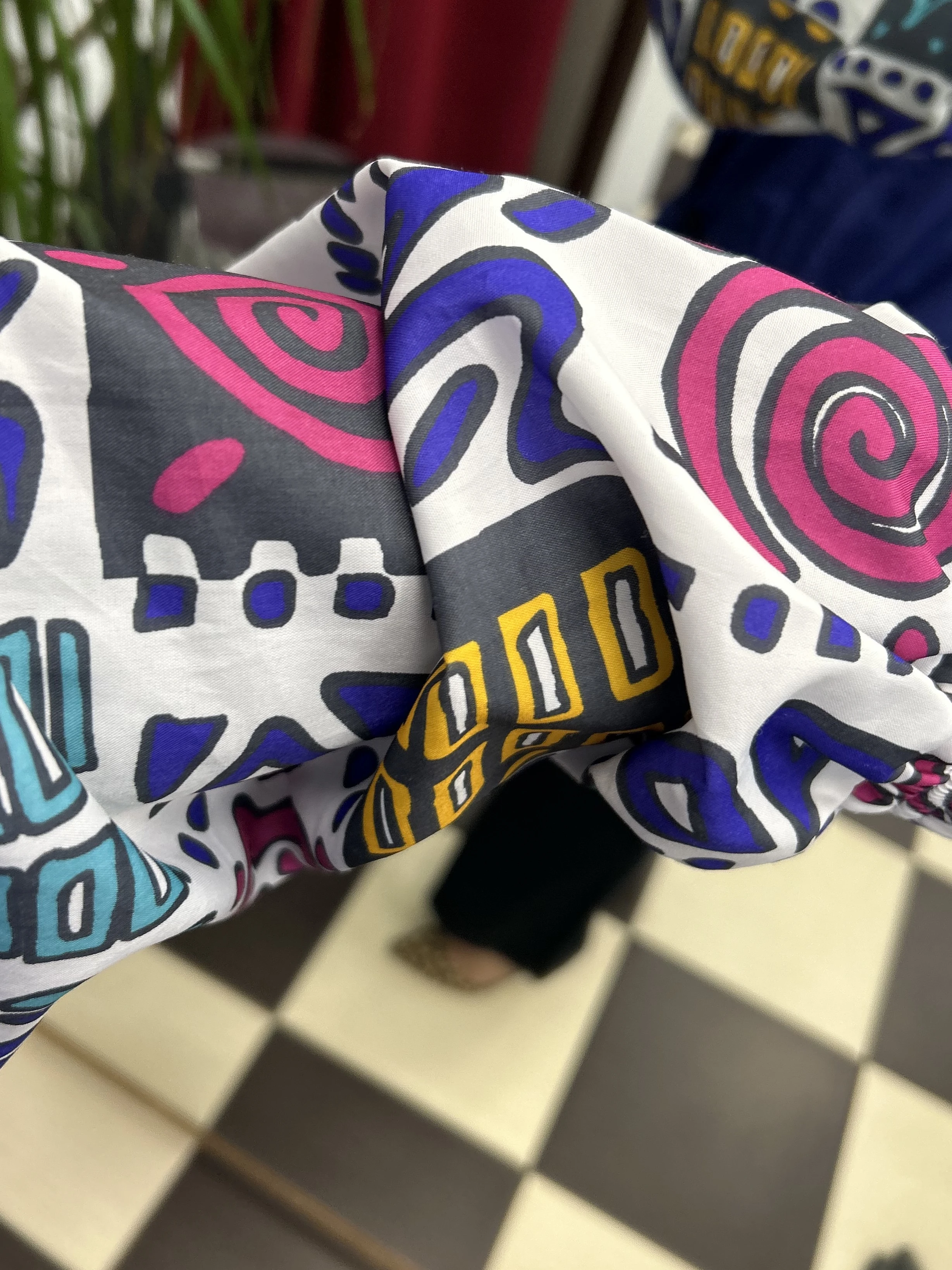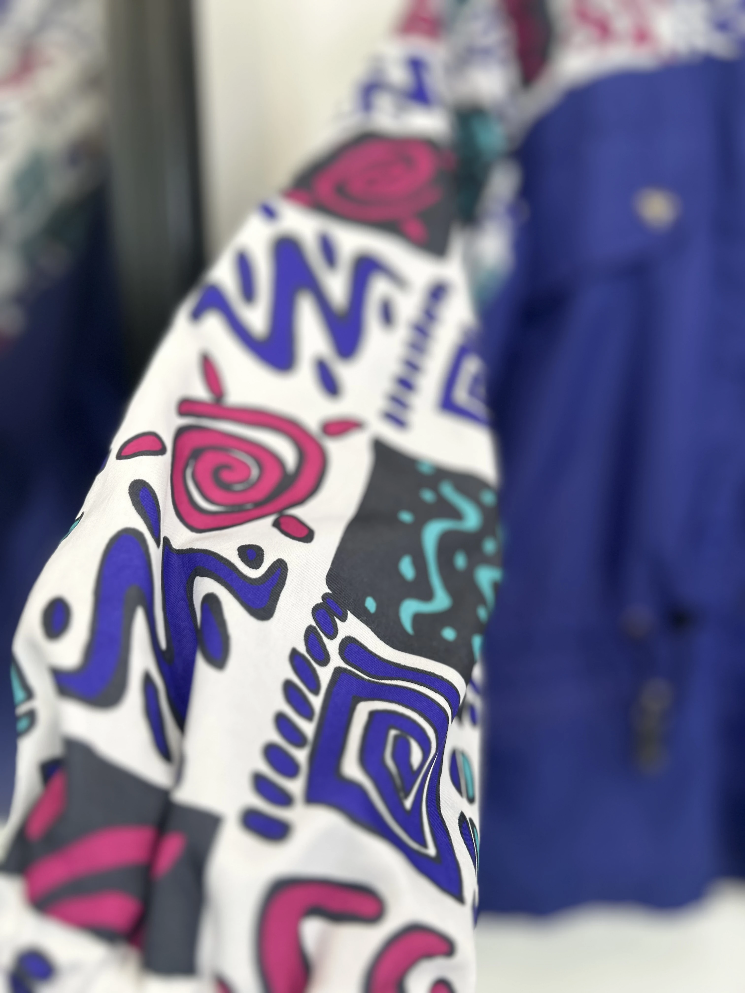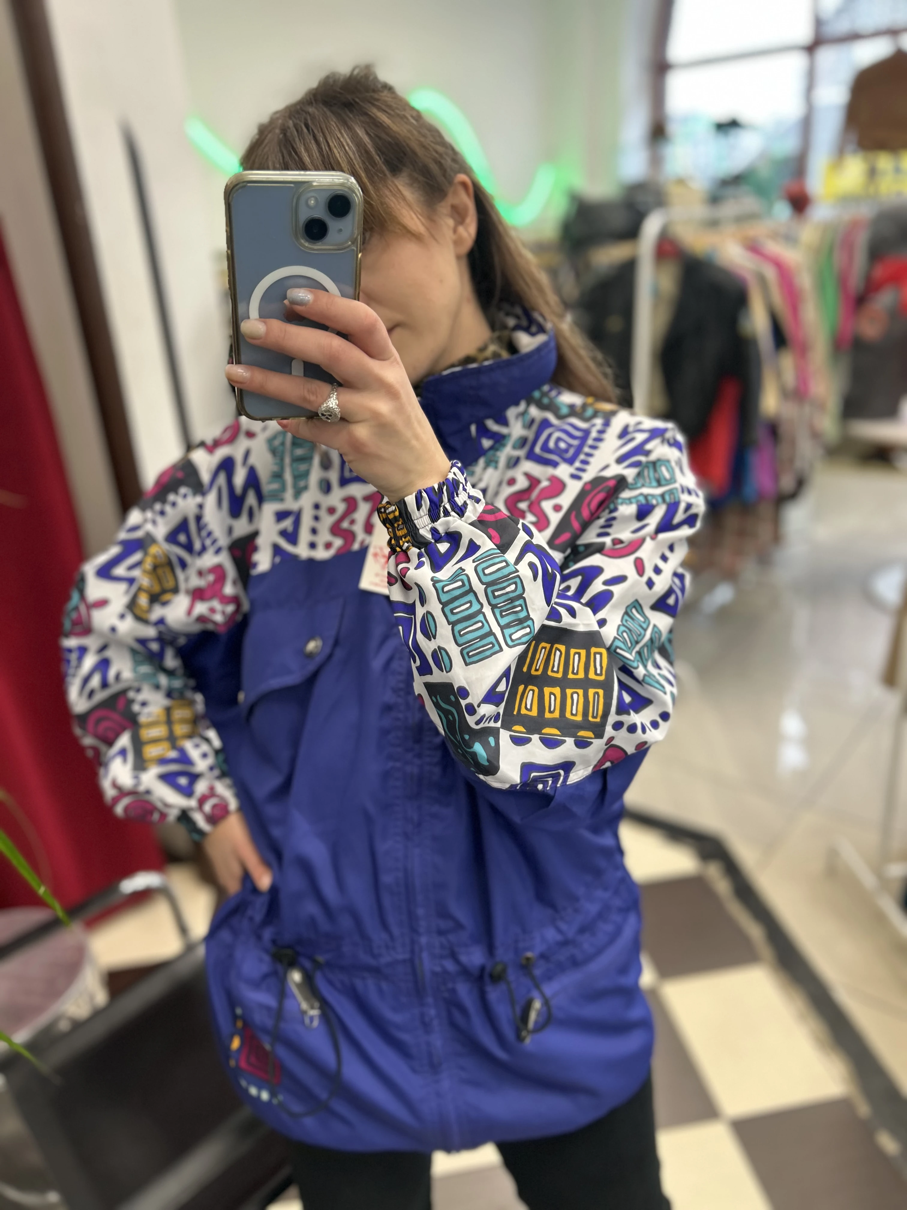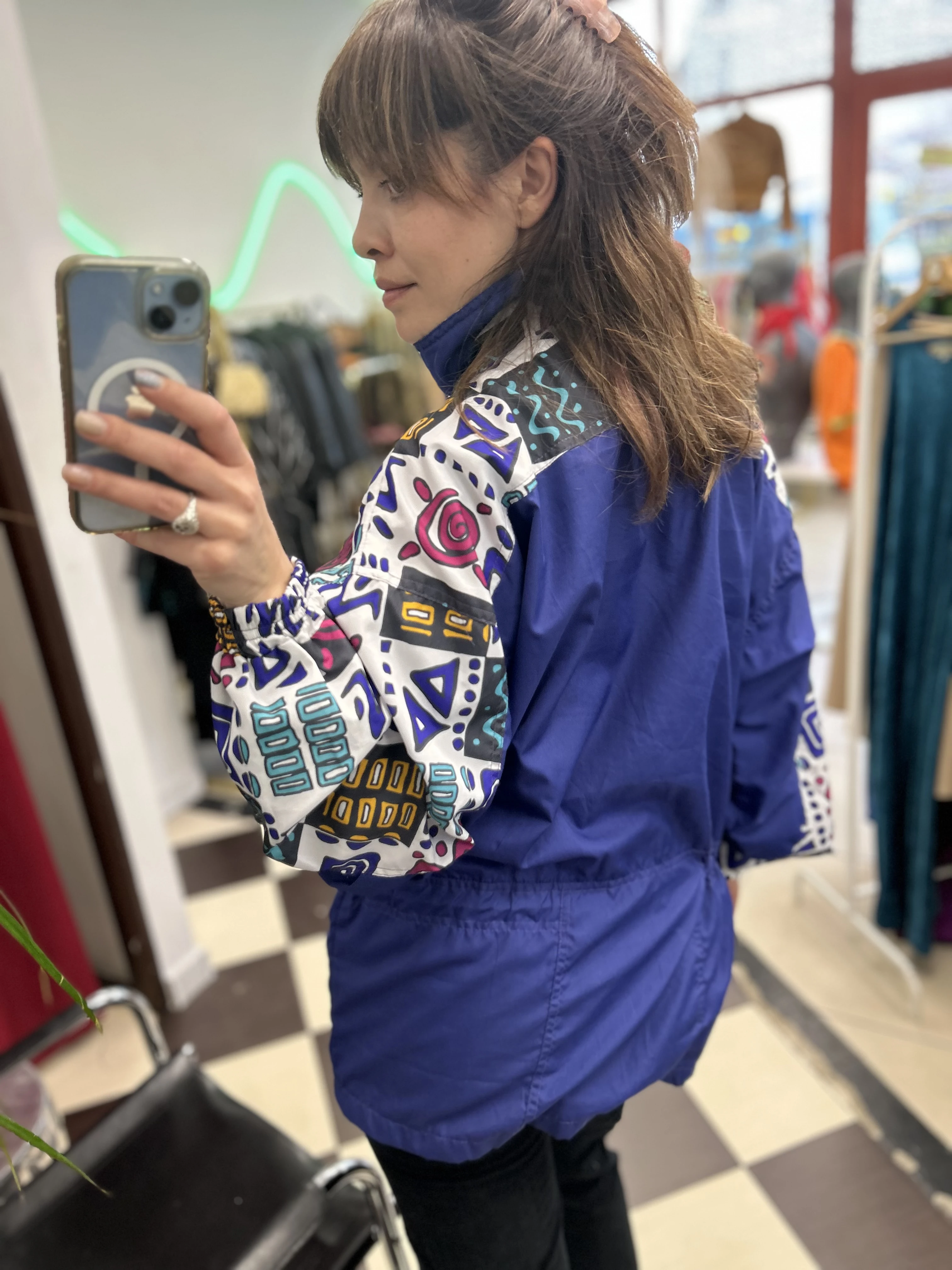 Kolorowa, wzorzysta kurtka vintage z lat 90. Odlo. Kurtka zapinana na zamek. Posiada podszewkę, ściągacz w pasie i 4 solidne kieszenie.