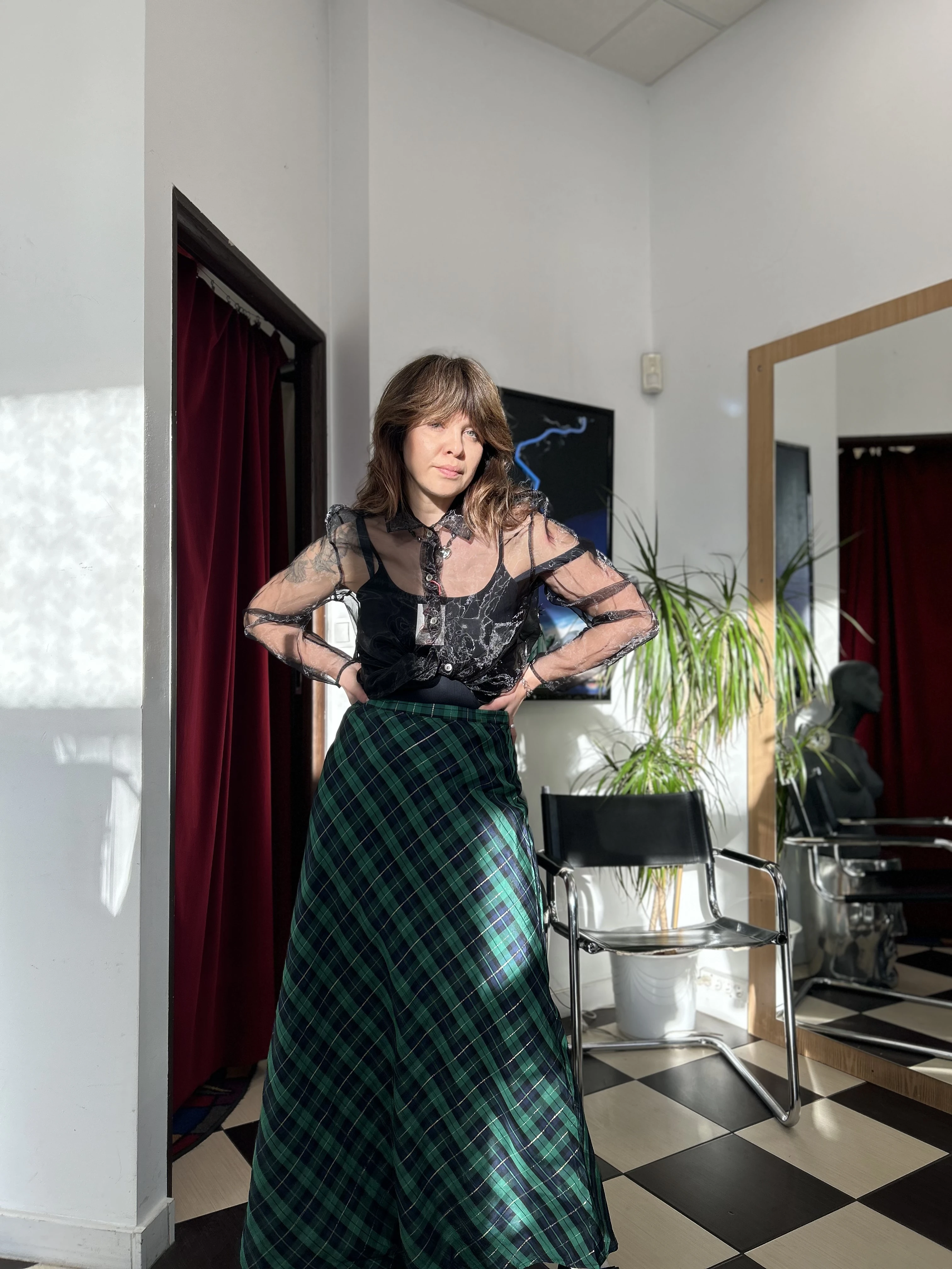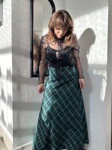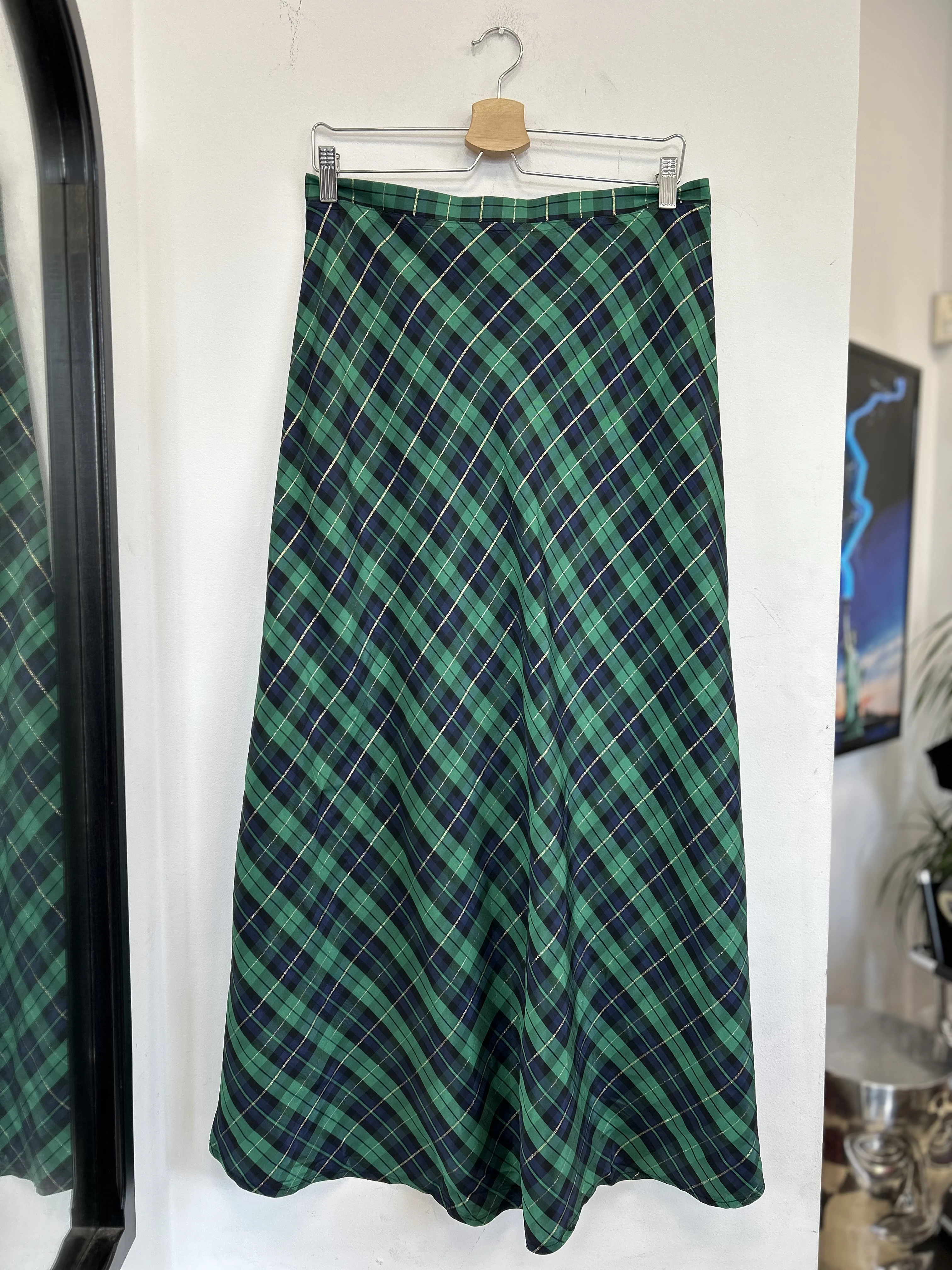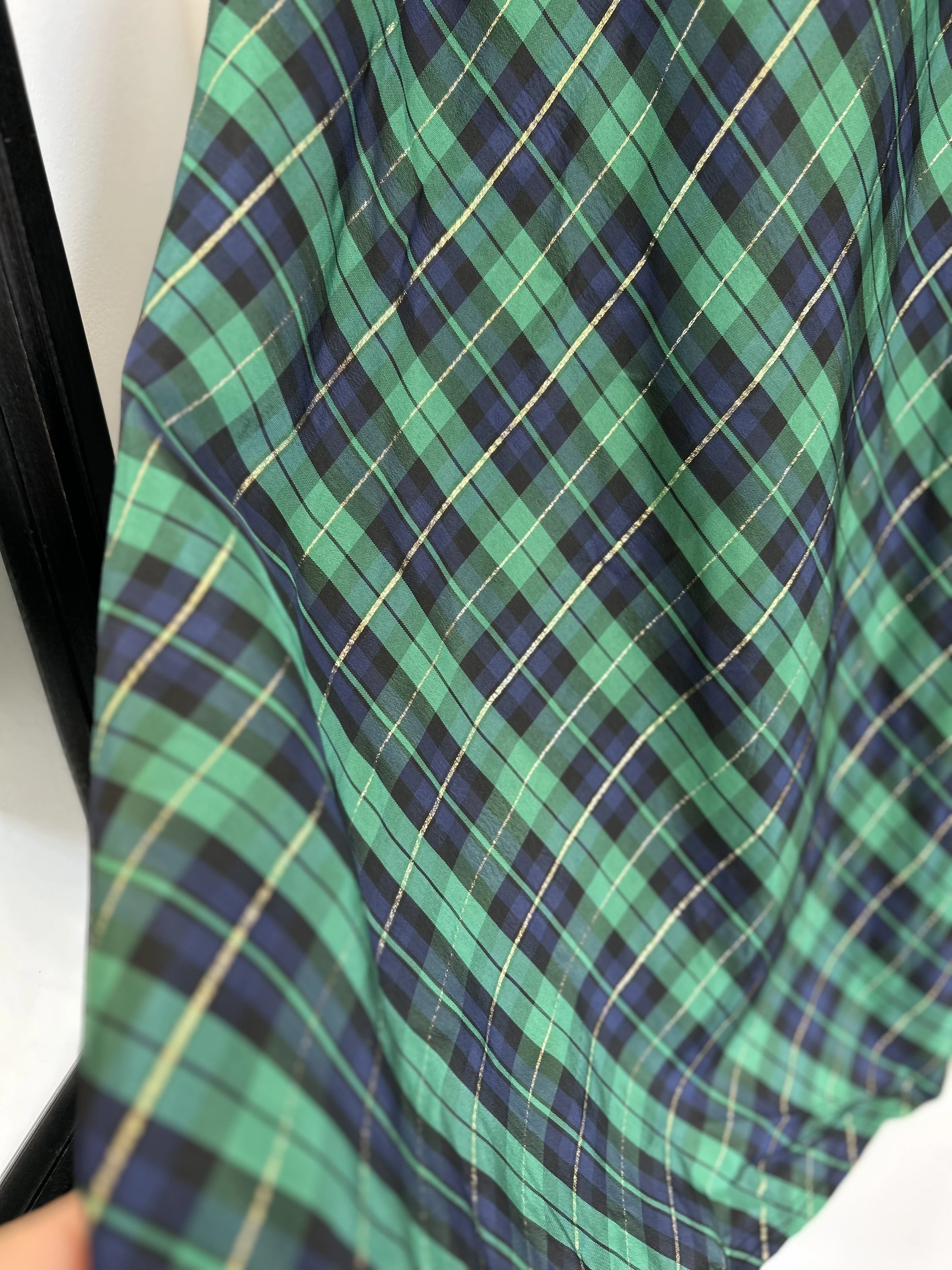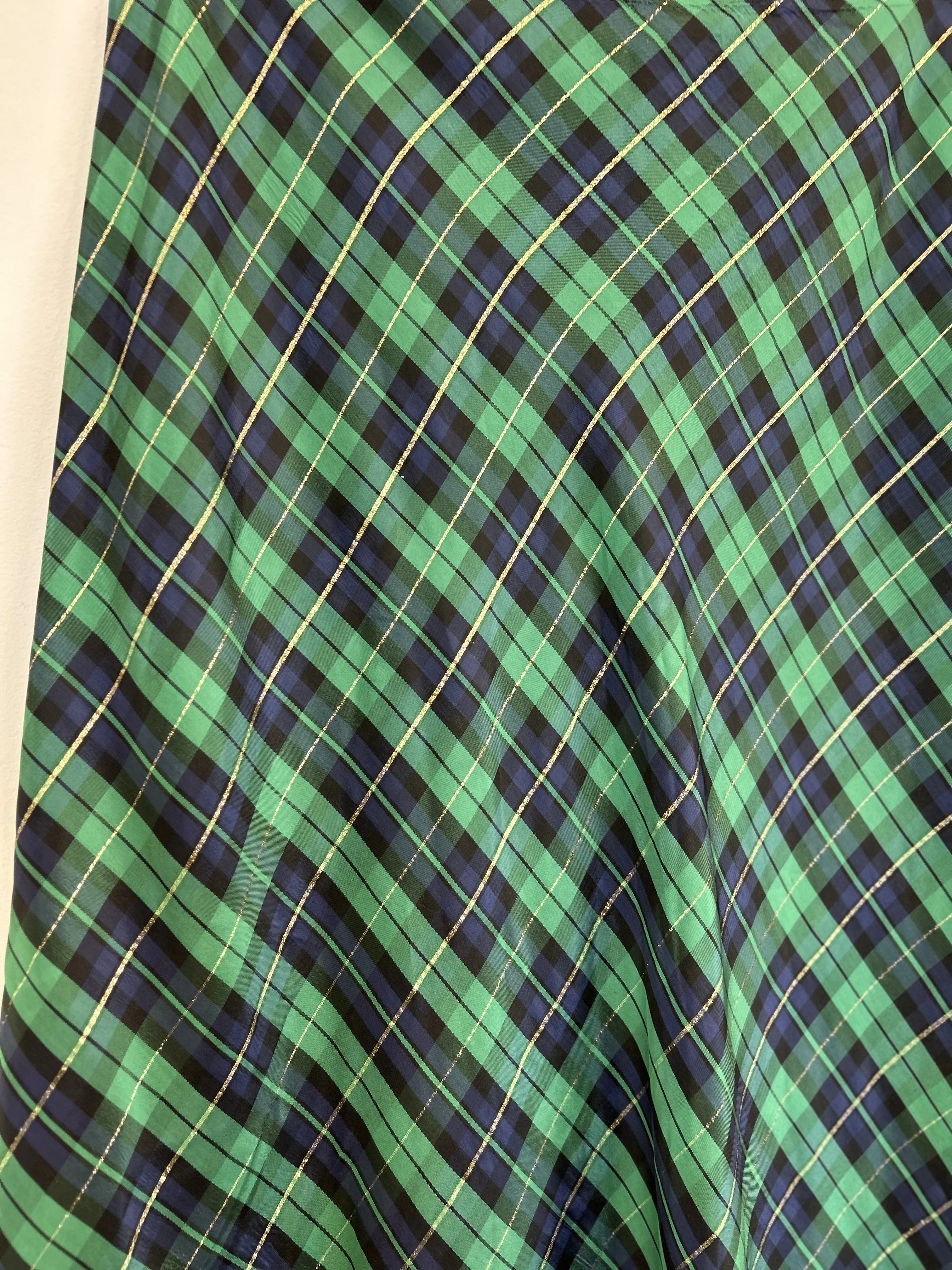 Kolorowa, kraciasta spódnica vintage. Spódnica zapinana z tyłu na zamek. Trapezowy kształt. Spódnica wykonana z acetatu. Na kratce połyskująca, metaliczna złota nitka.