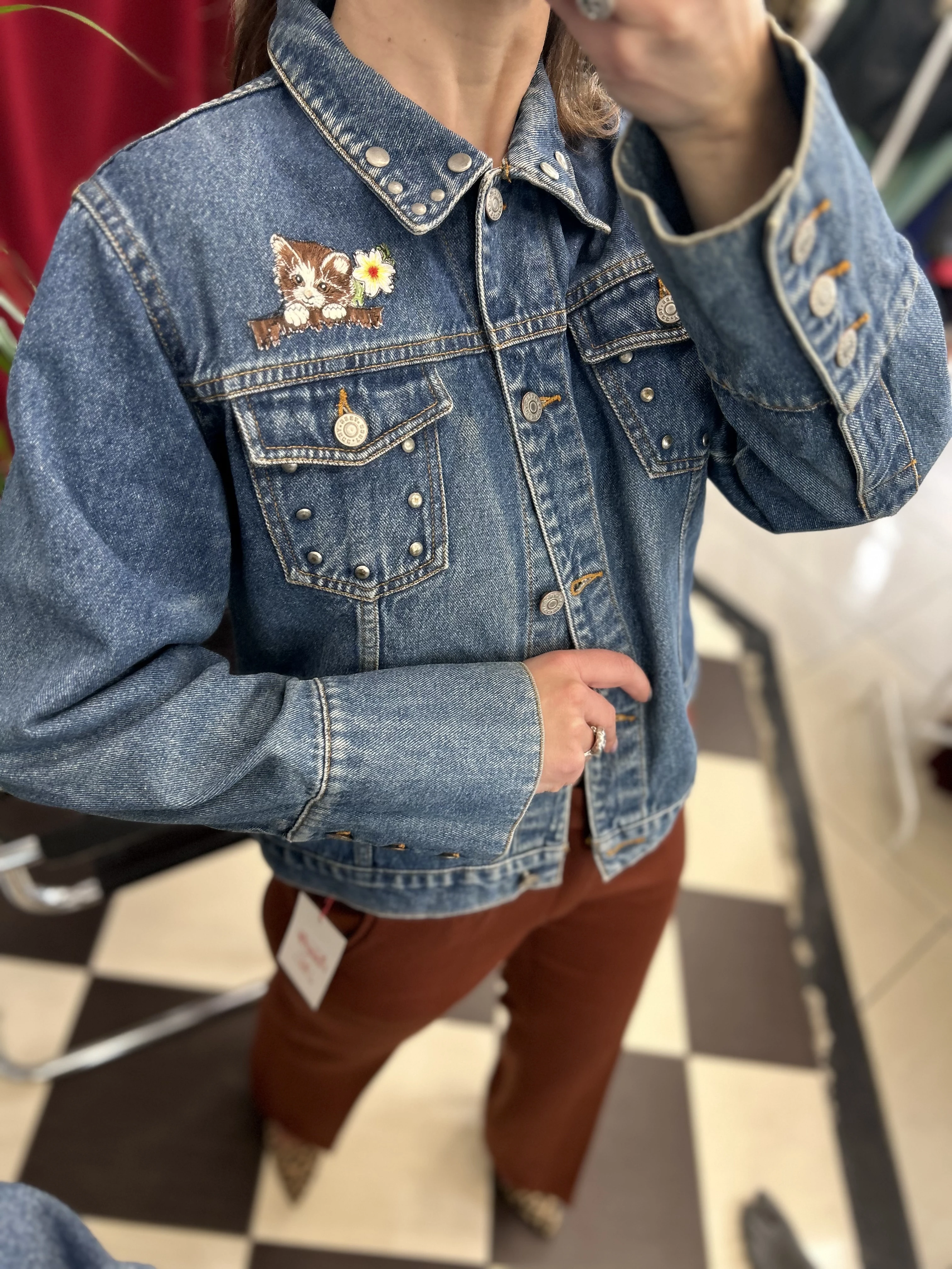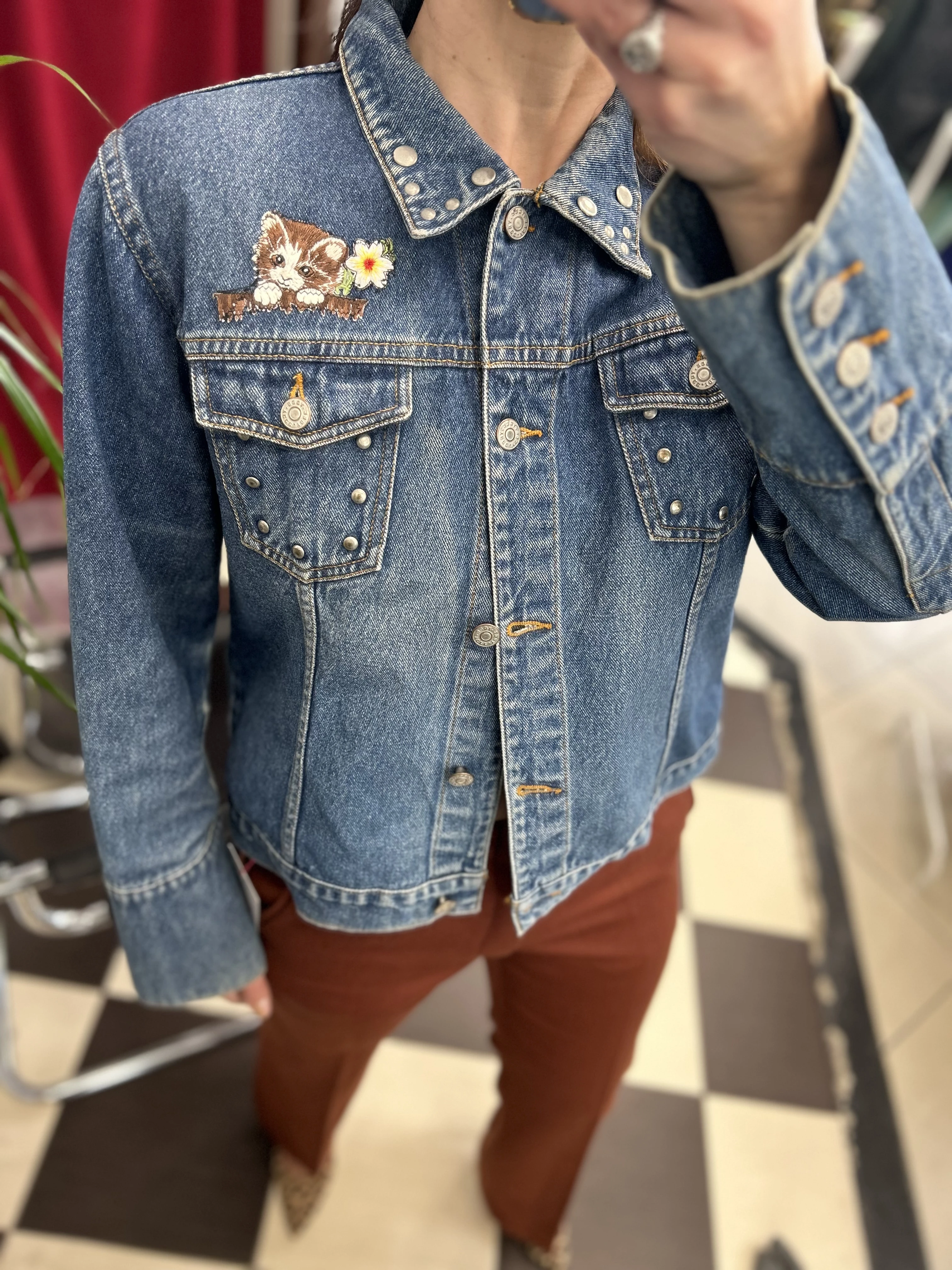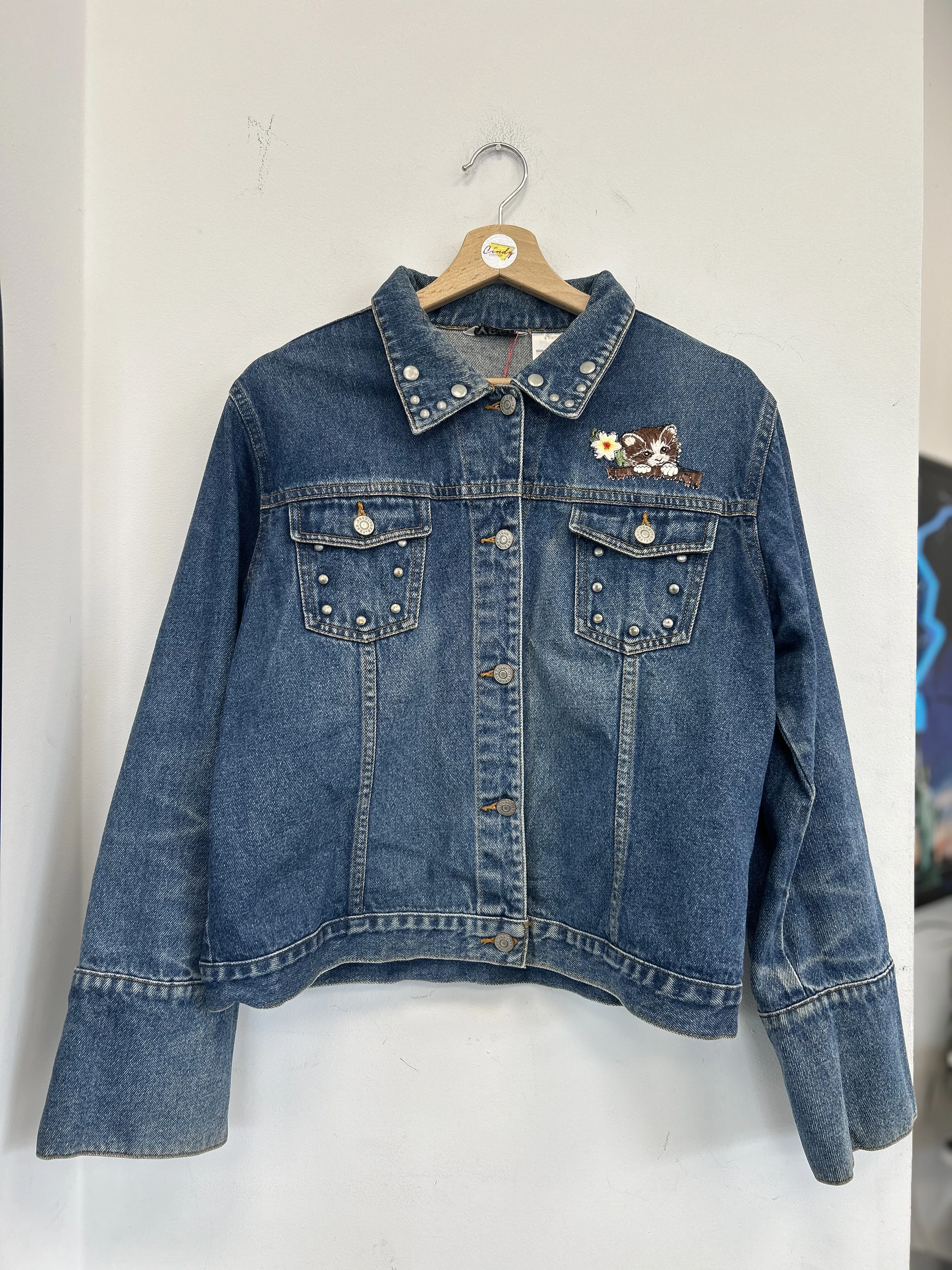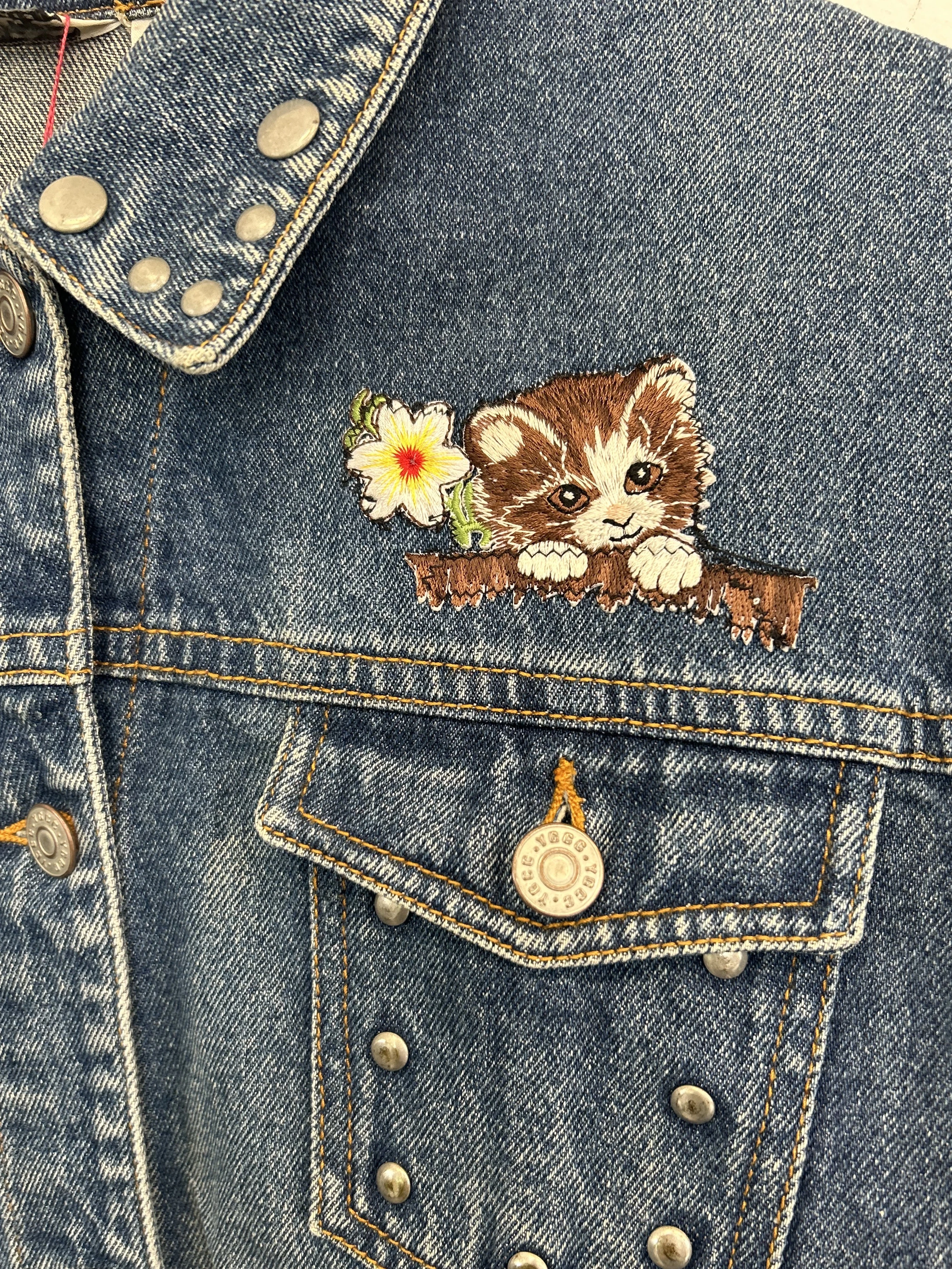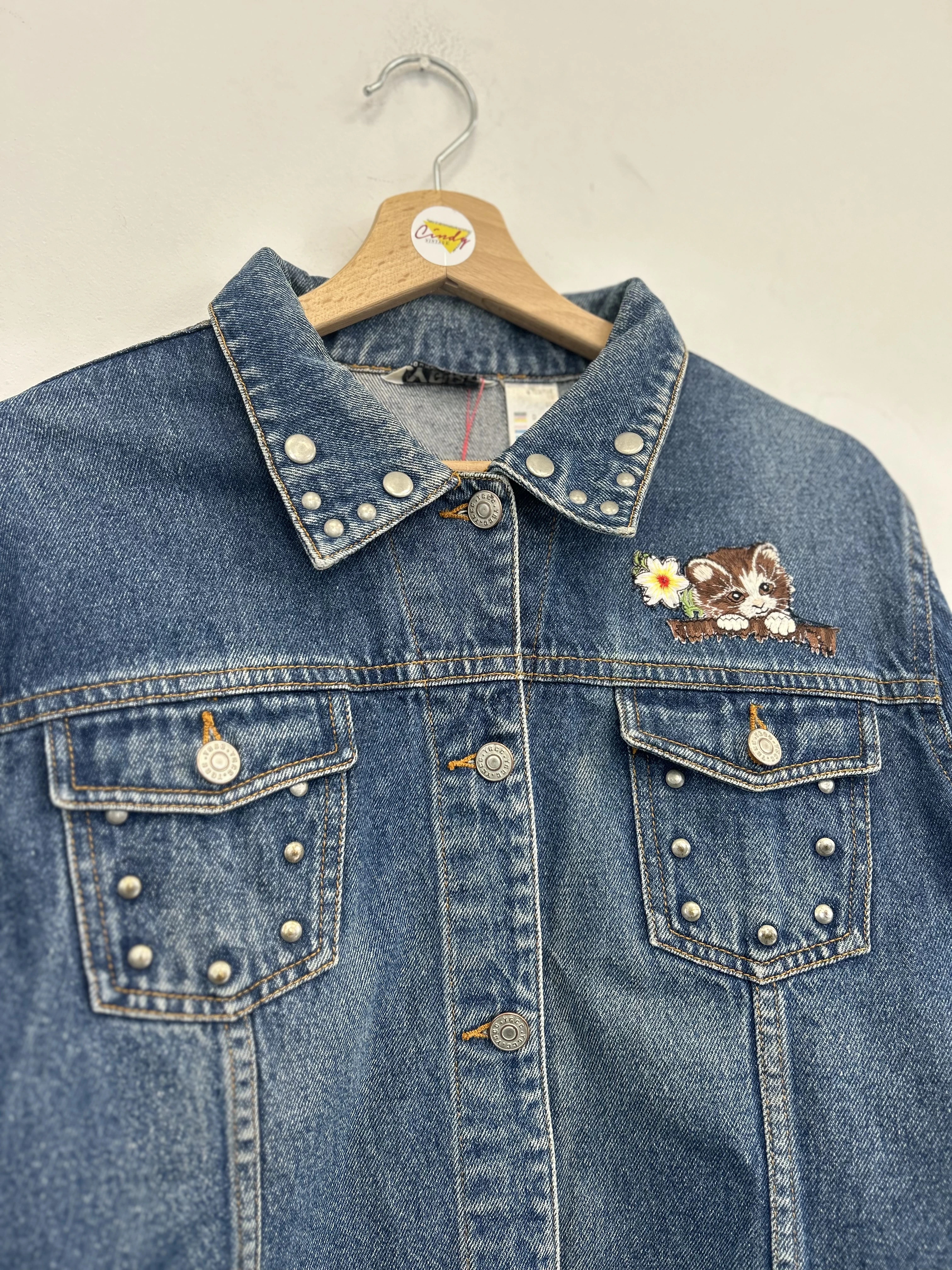Kurtka jeansowa vintage z kociakiem. Kurtka ozdobiona dżetami w srebrnym kolorze.