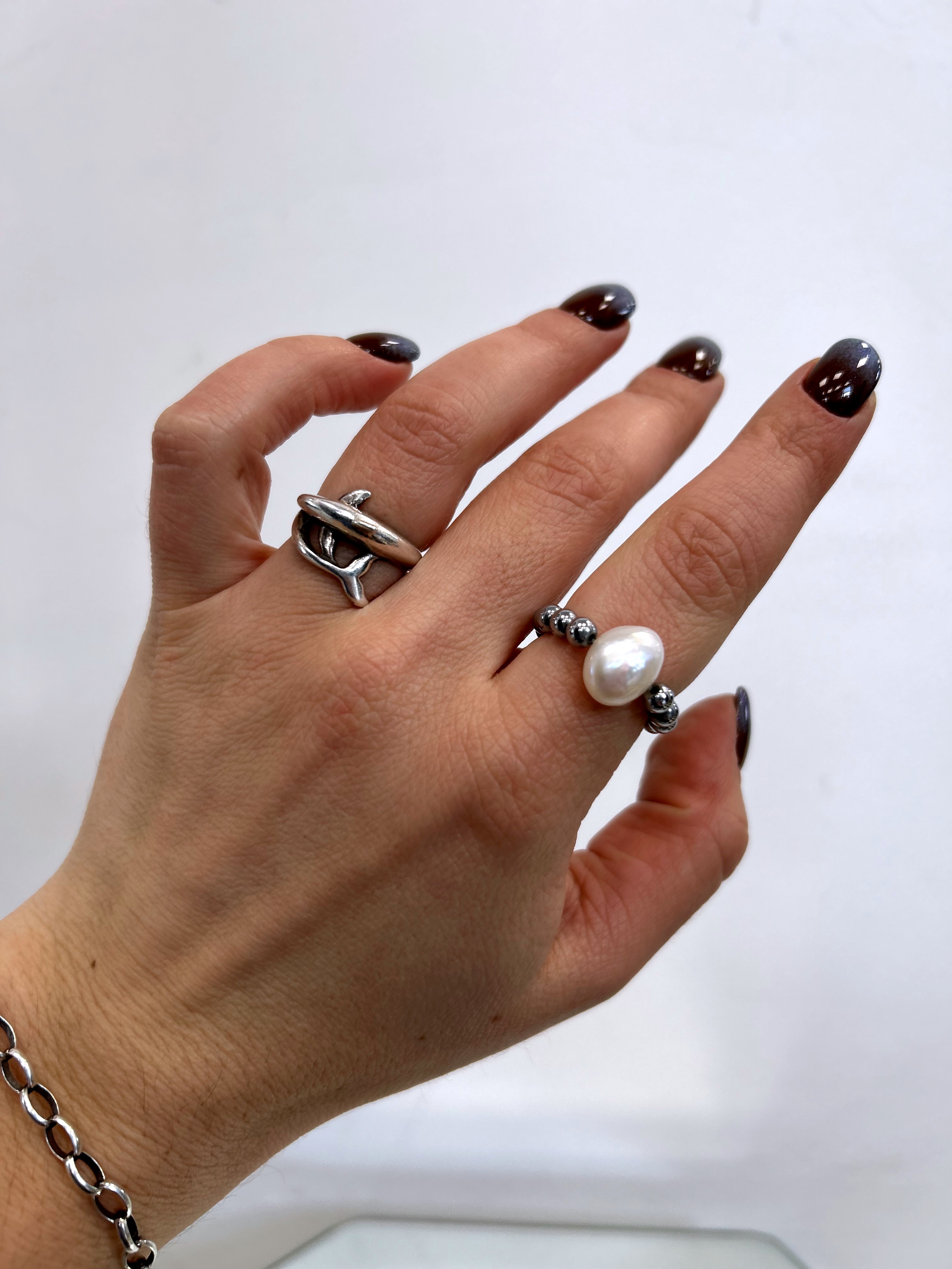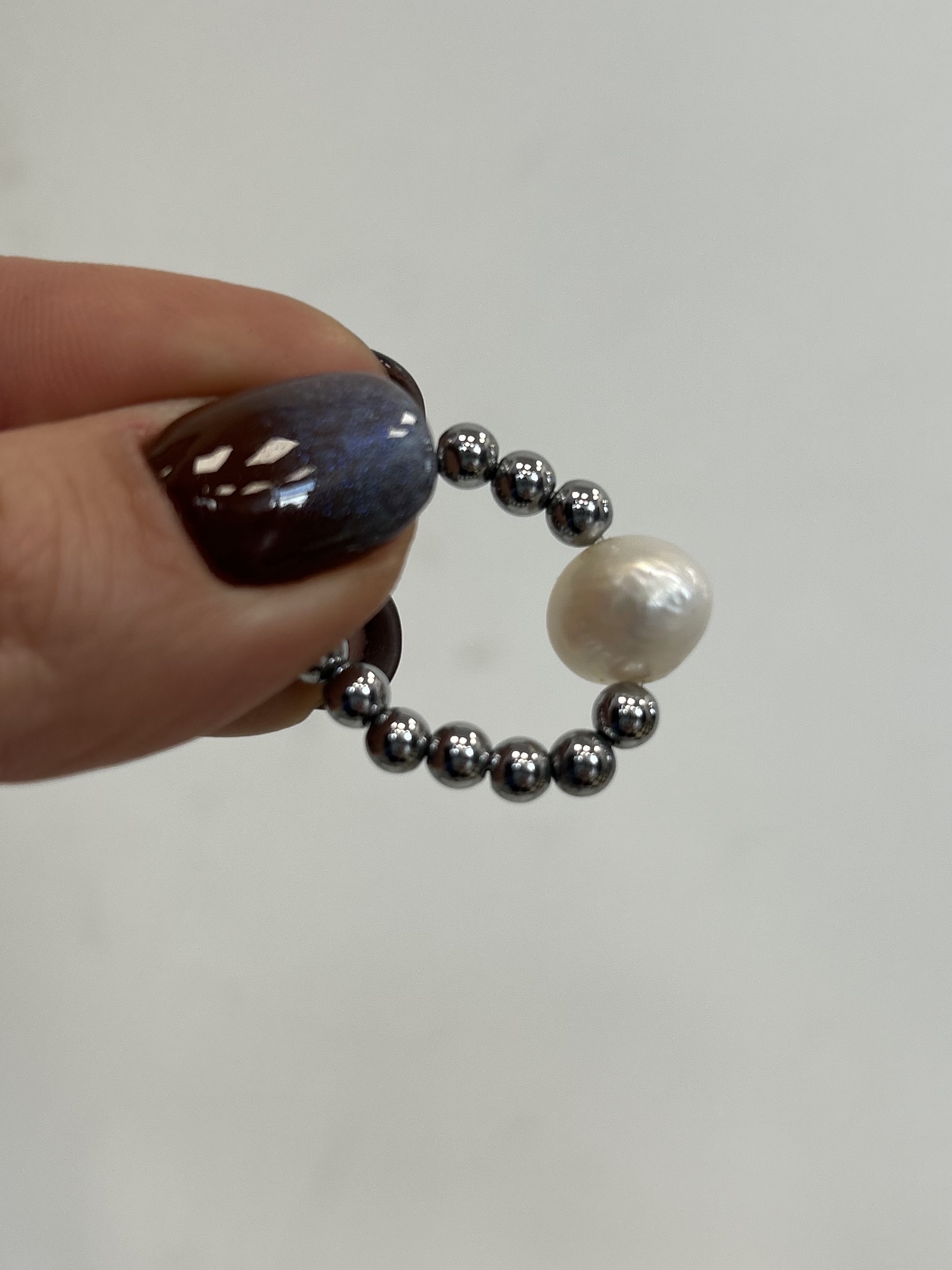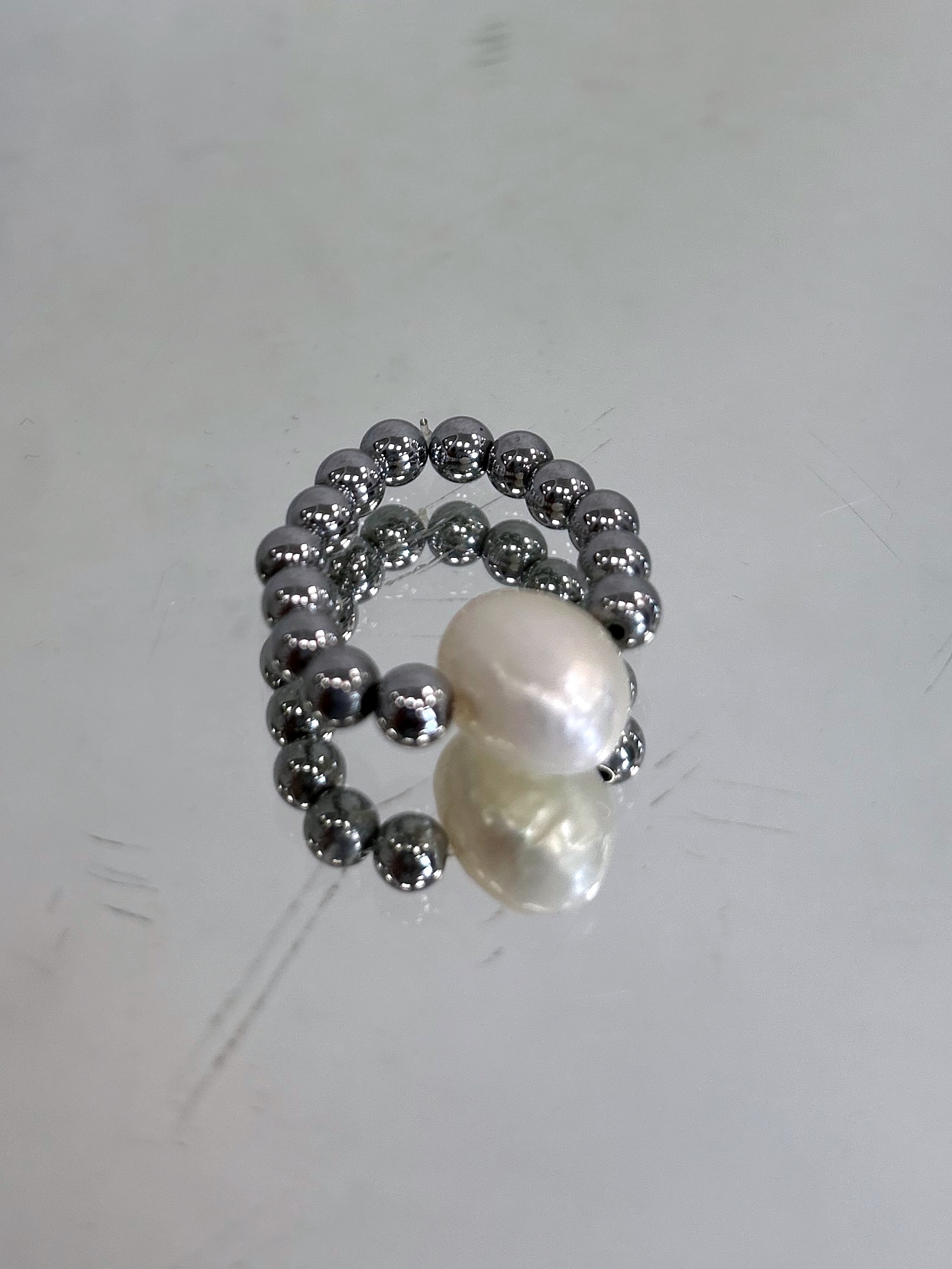 Wykonany z hematytu w srebrnym kolorze i perły naturalnej.