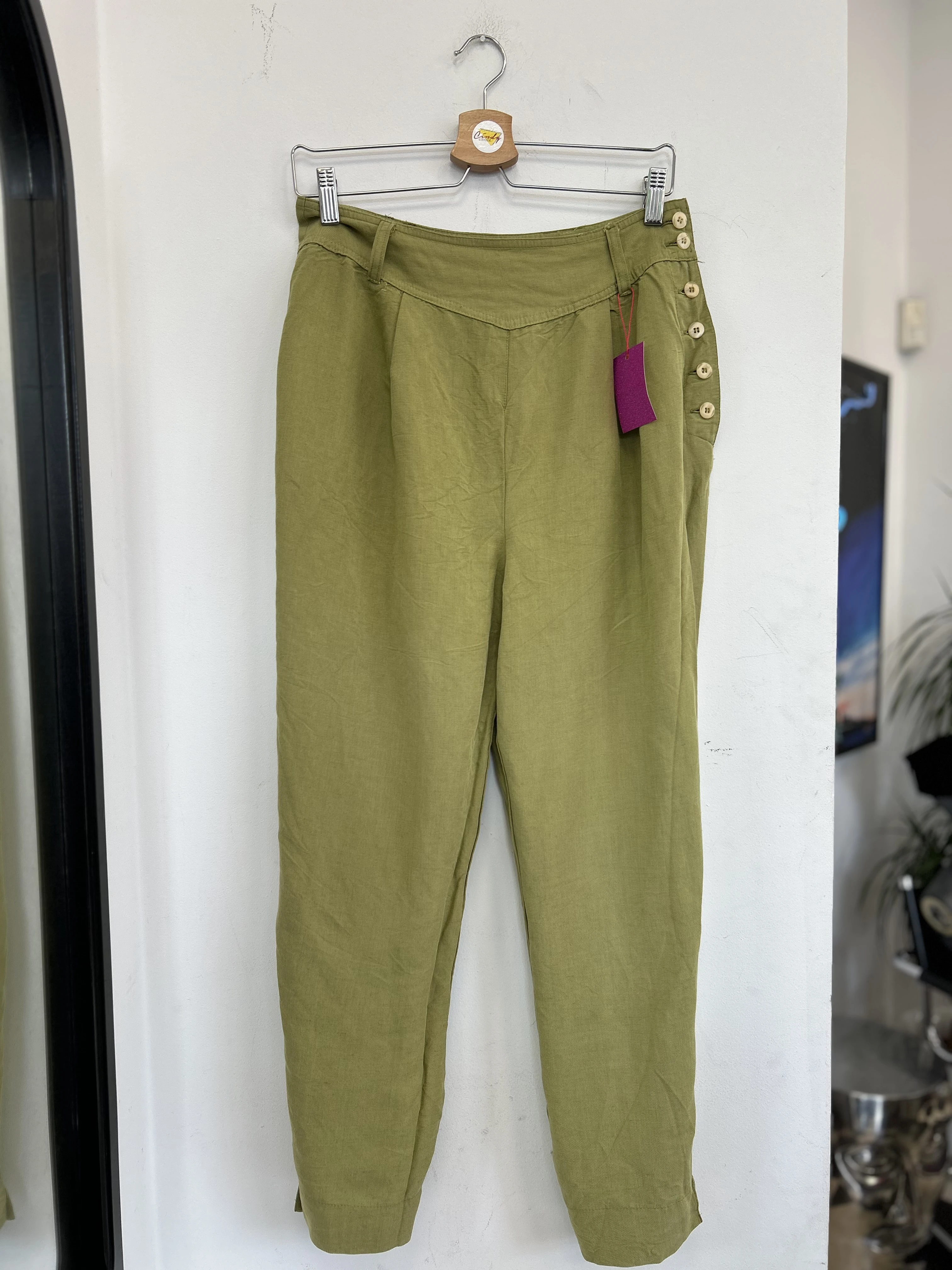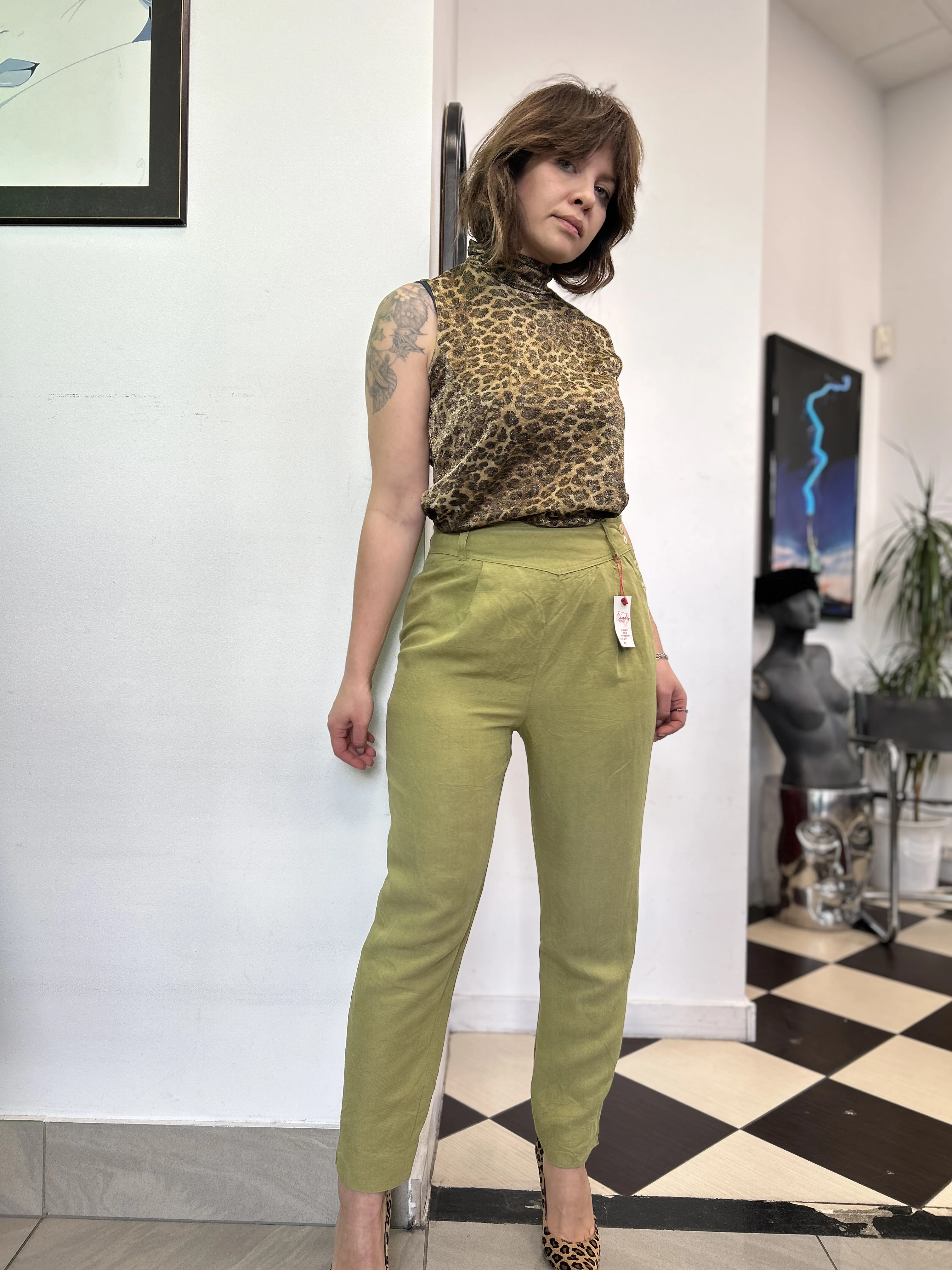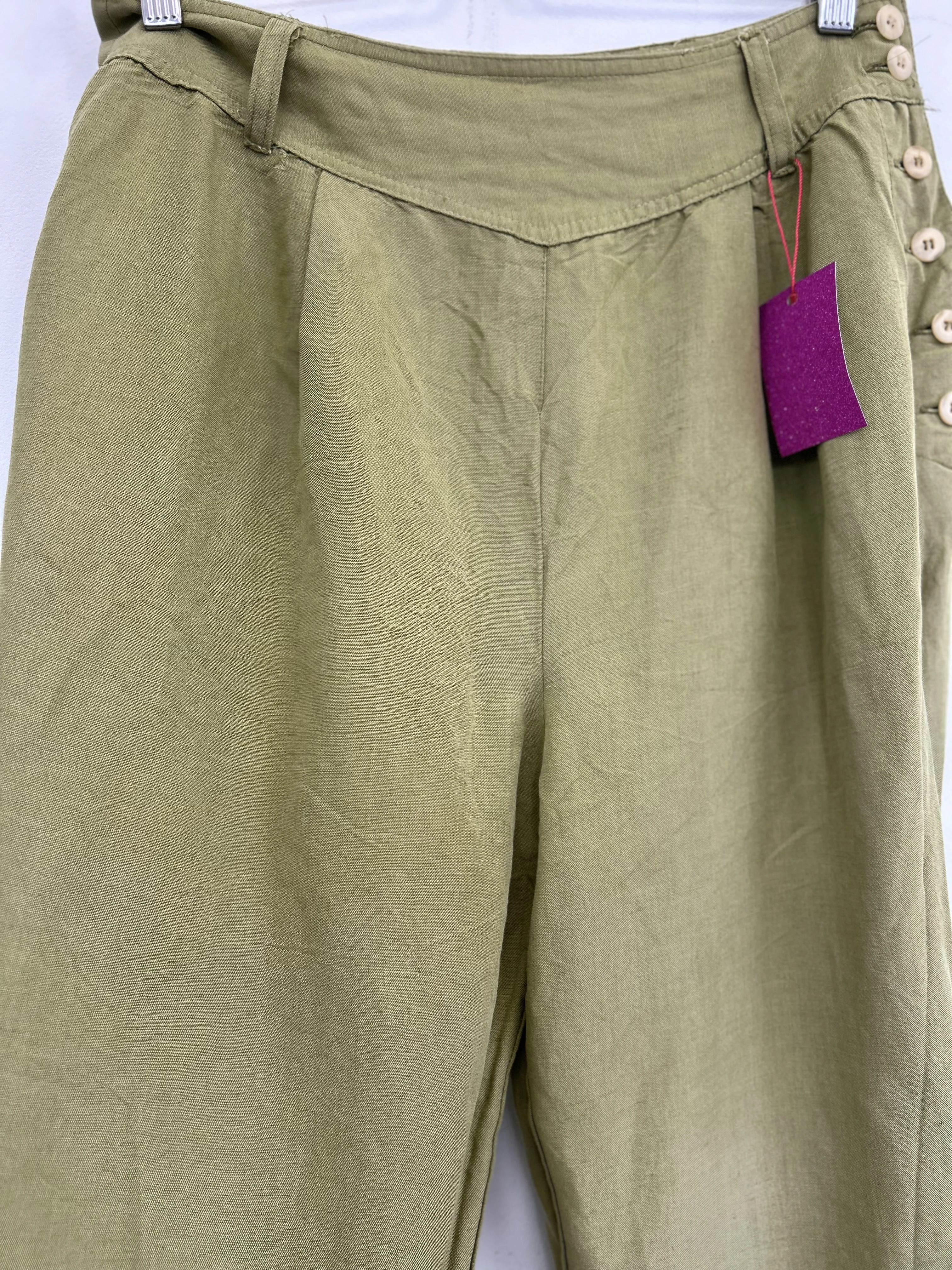 Letnie spodnie vintage z lat 80. Spodnie z wysokiem stanem i zaznaczonym karczkiem. W składzie 55 % lnu i wiskoza. Zapinane z boku na guziczki. Posiadają kieszenie.