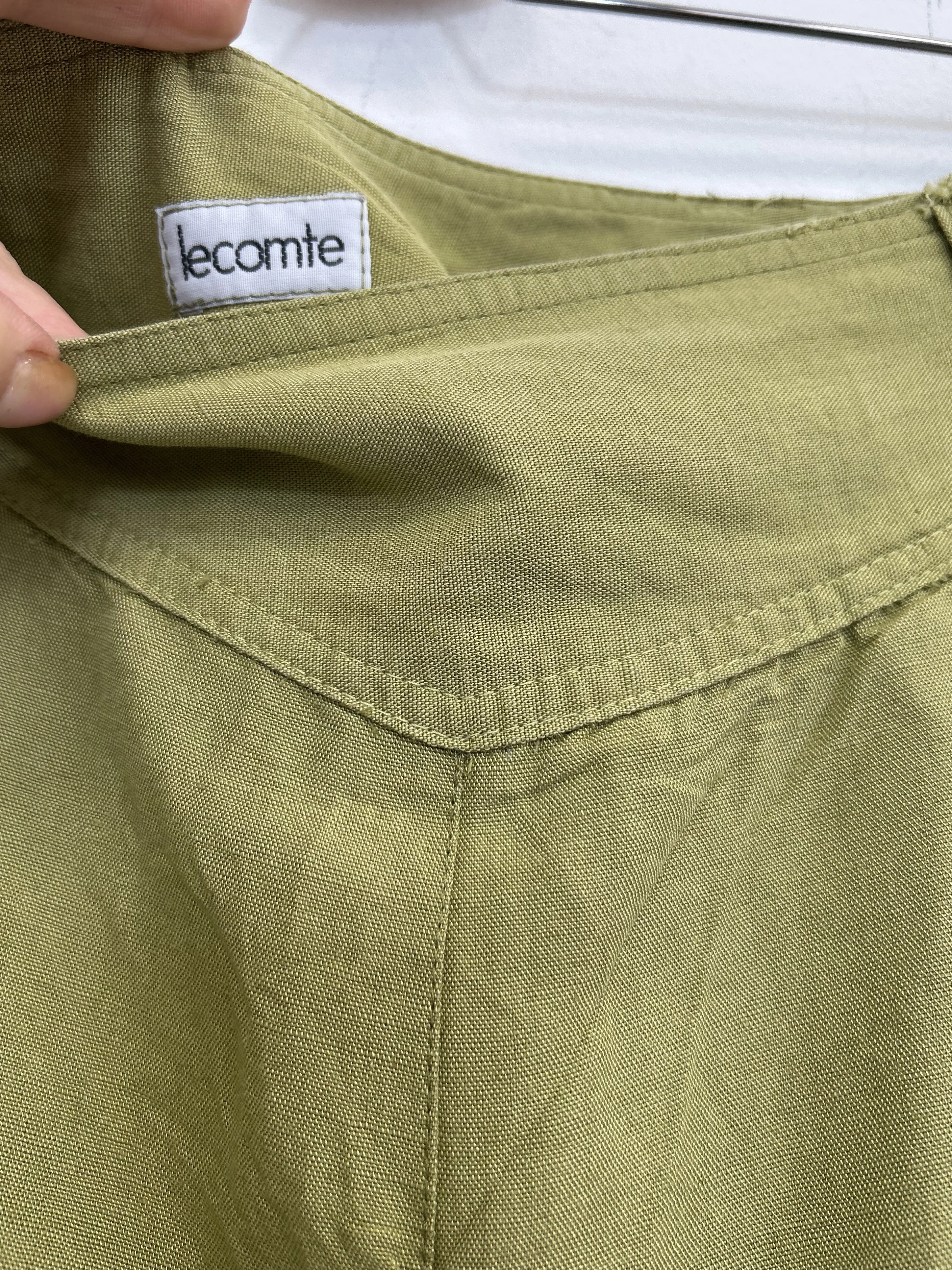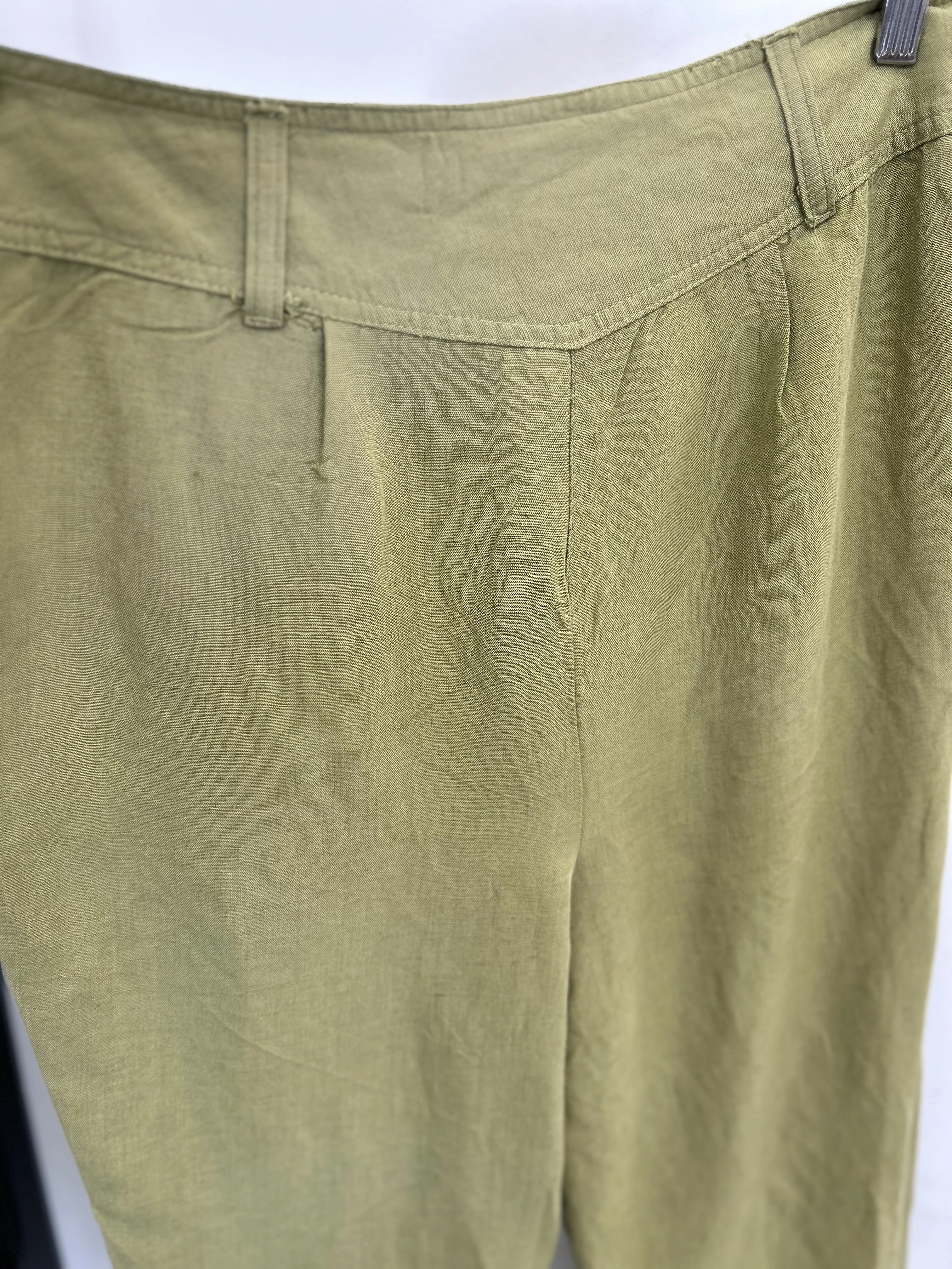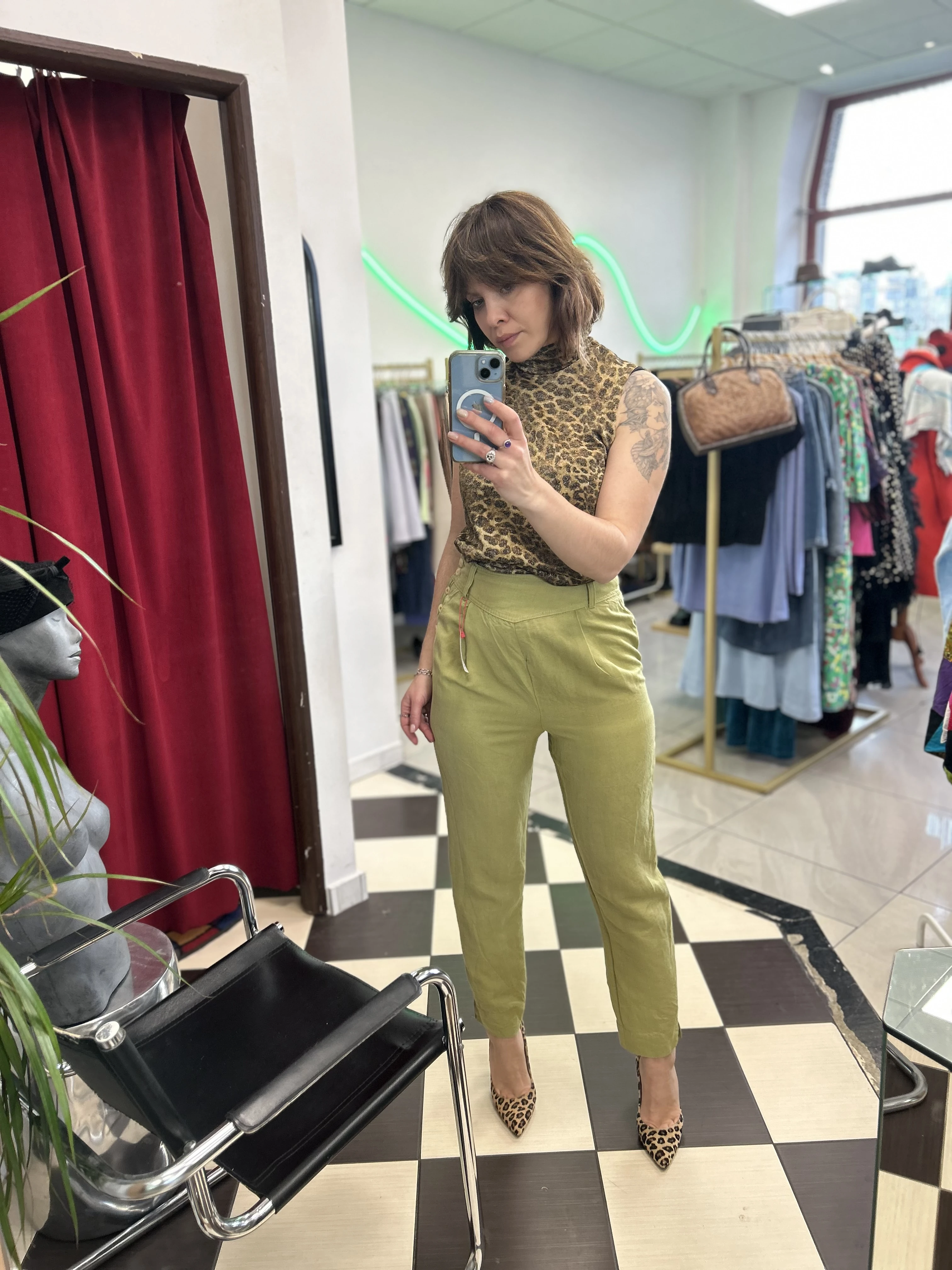 Letnie spodnie vintage z lat 80. Spodnie z wysokiem stanem i zaznaczonym karczkiem. W składzie 55 % lnu i wiskoza. Zapinane z boku na guziczki. Posiadają kieszenie.