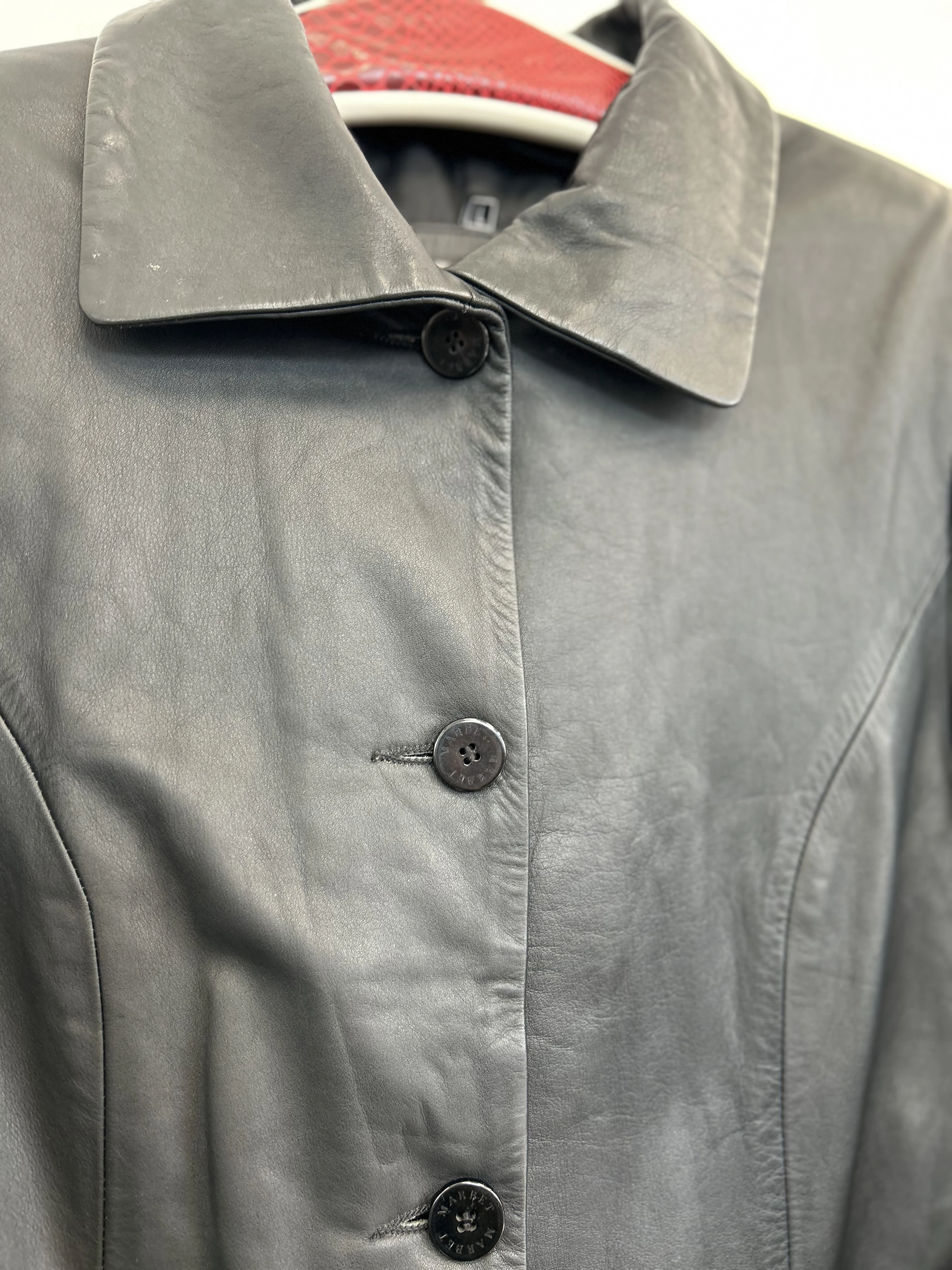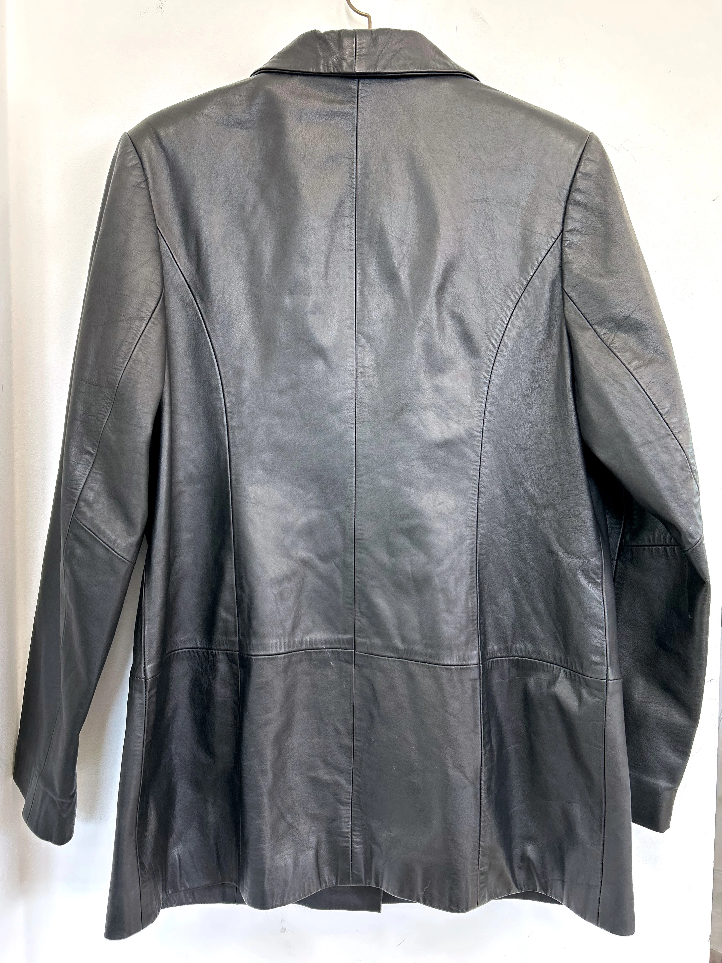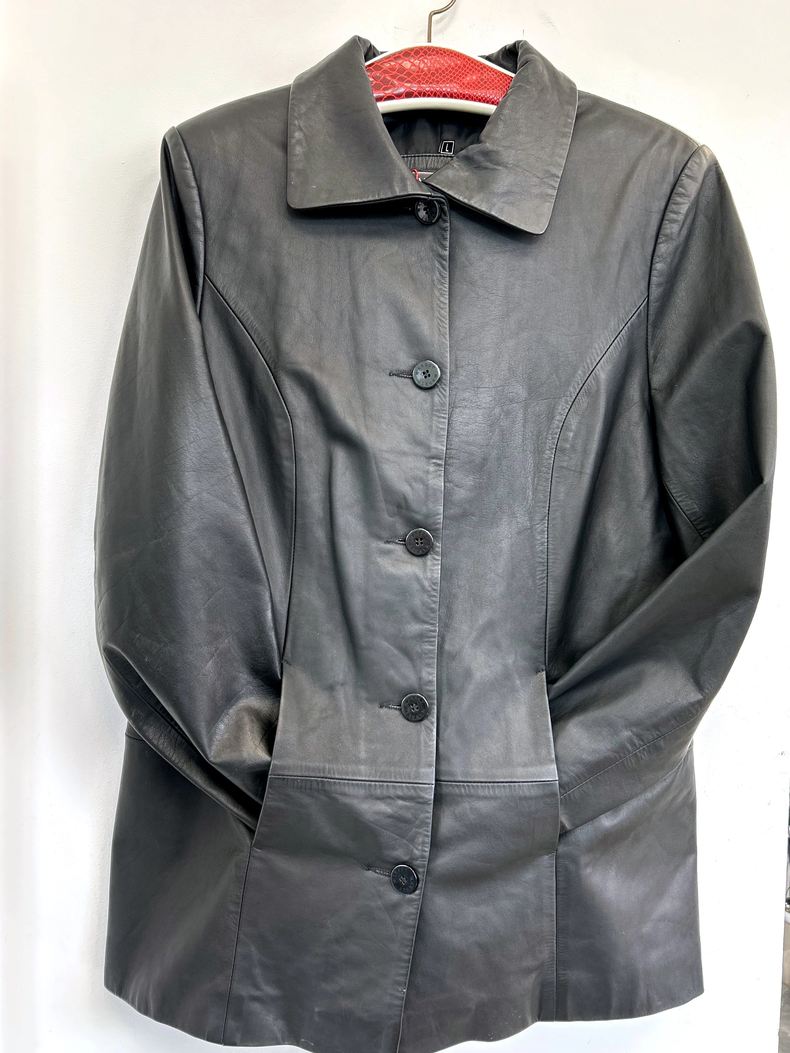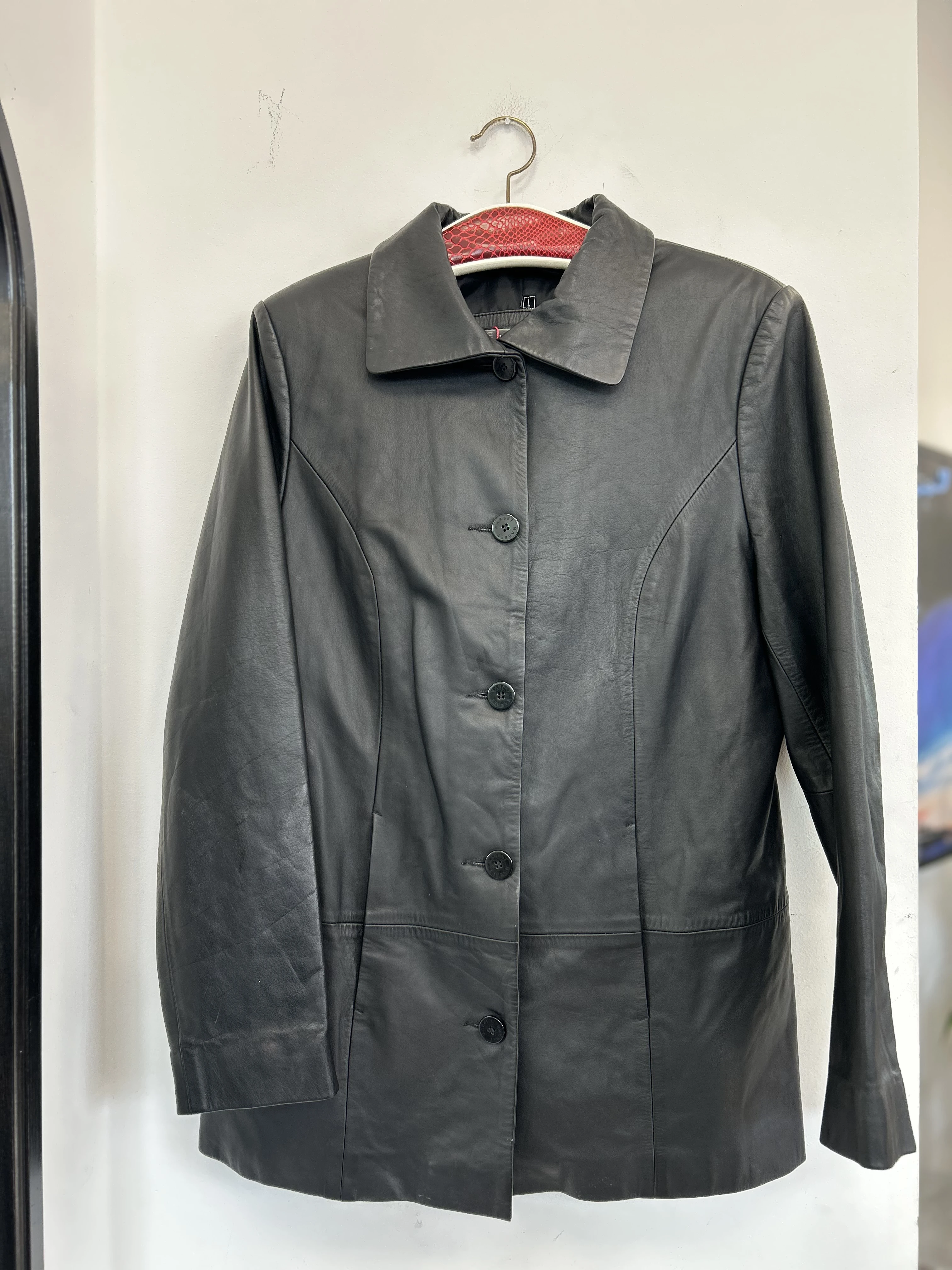 Czarna kurtka skórzana vintage z lat 90. Kurtka wykonana ze skóry naturalnej. Zapinana na guziki, posiada dwie zewnętrzne wpuszczane kieszenie. Kurtka została wyozonowana, wyczyszczona, kolor odświezony, skóra nawilżona i zaimpregnowana, gotowa do noszenia.
