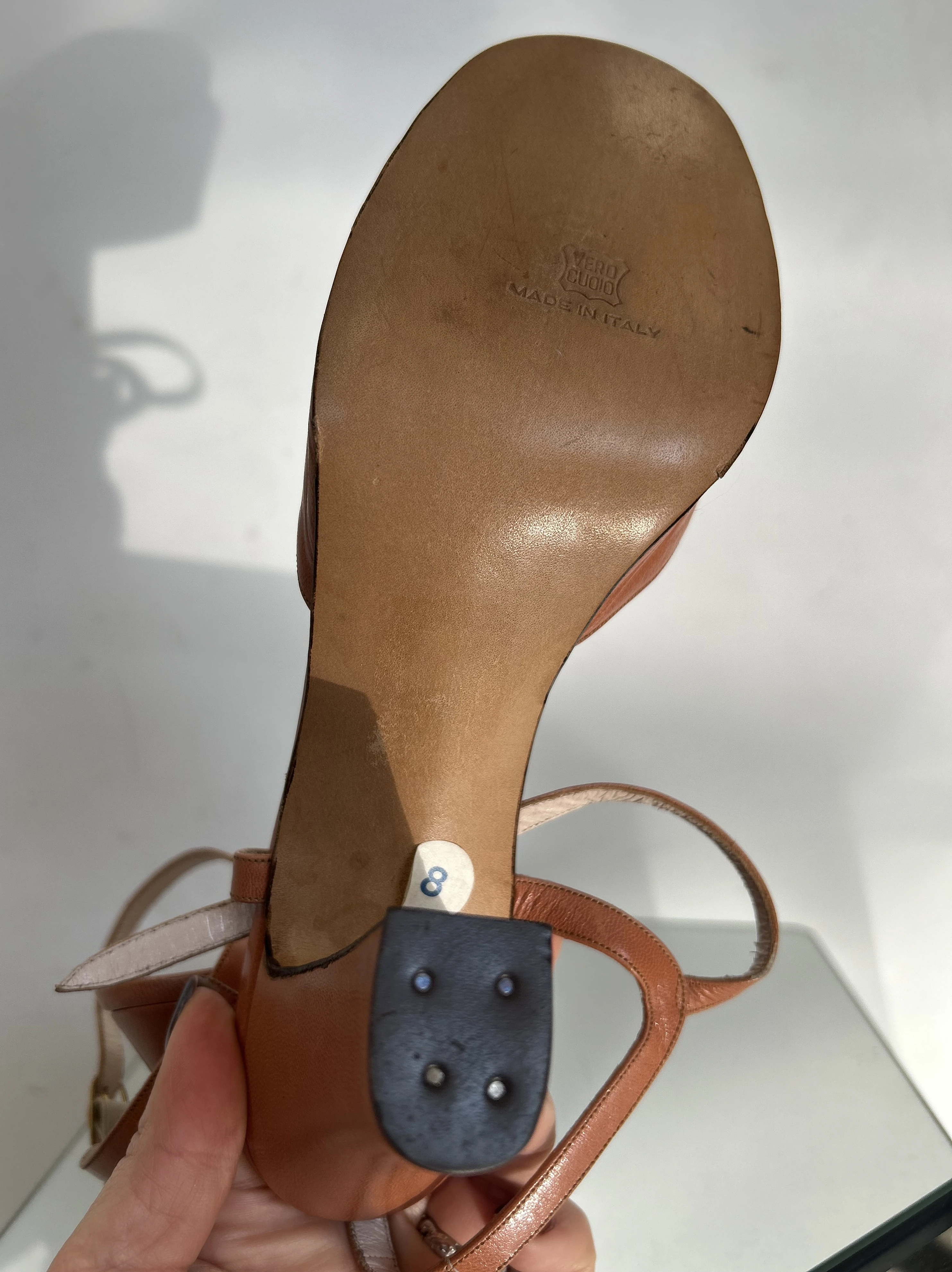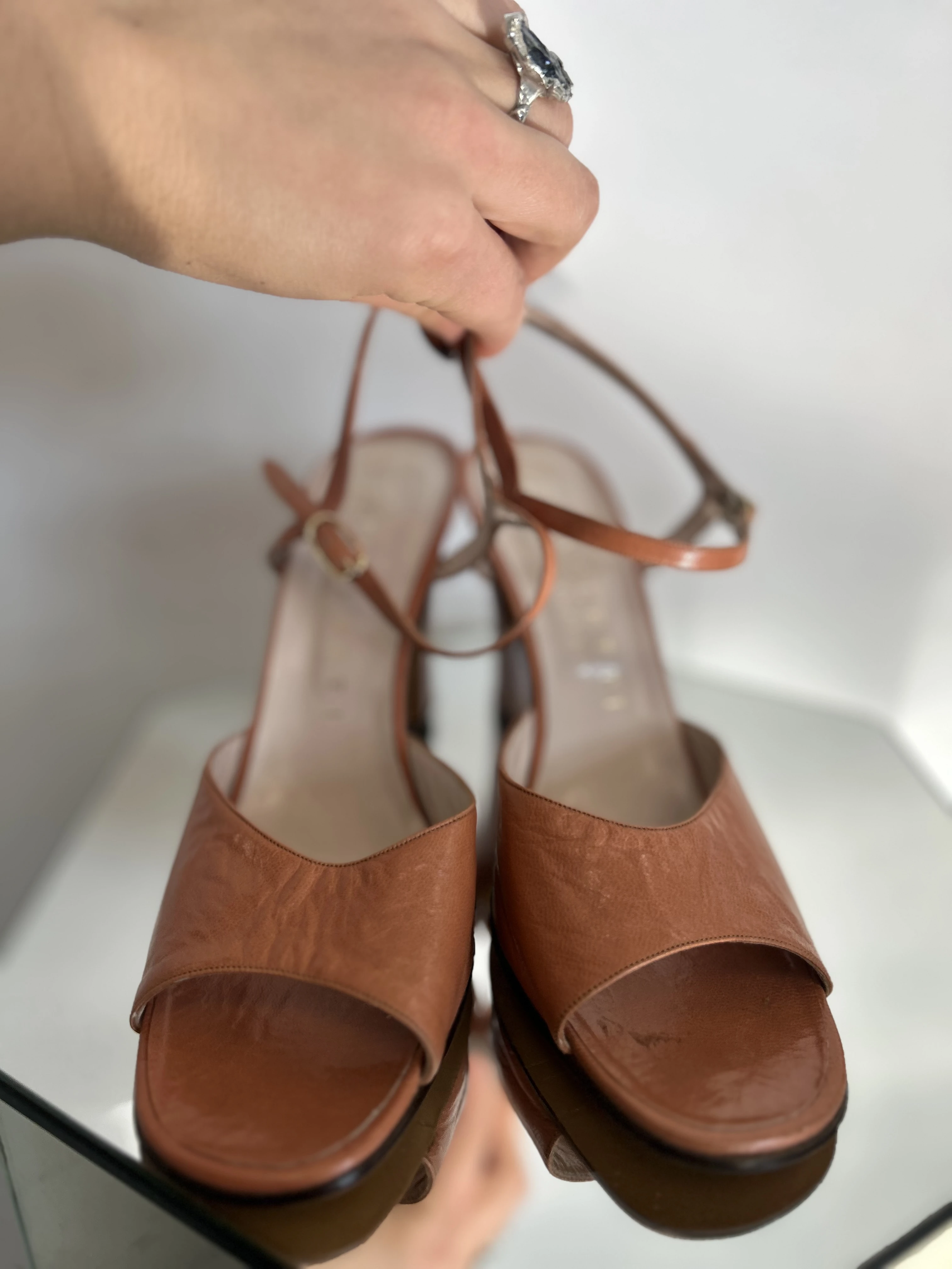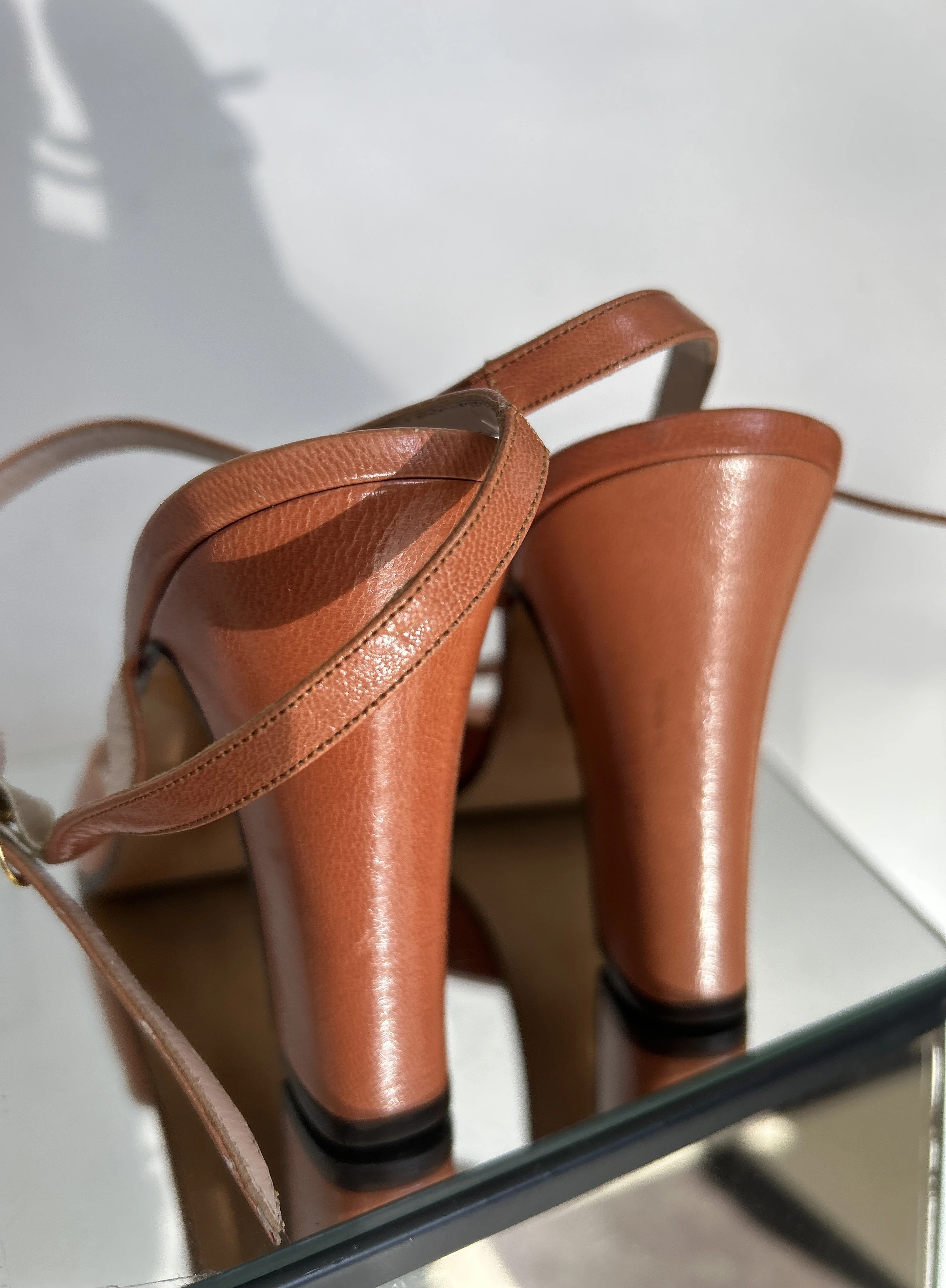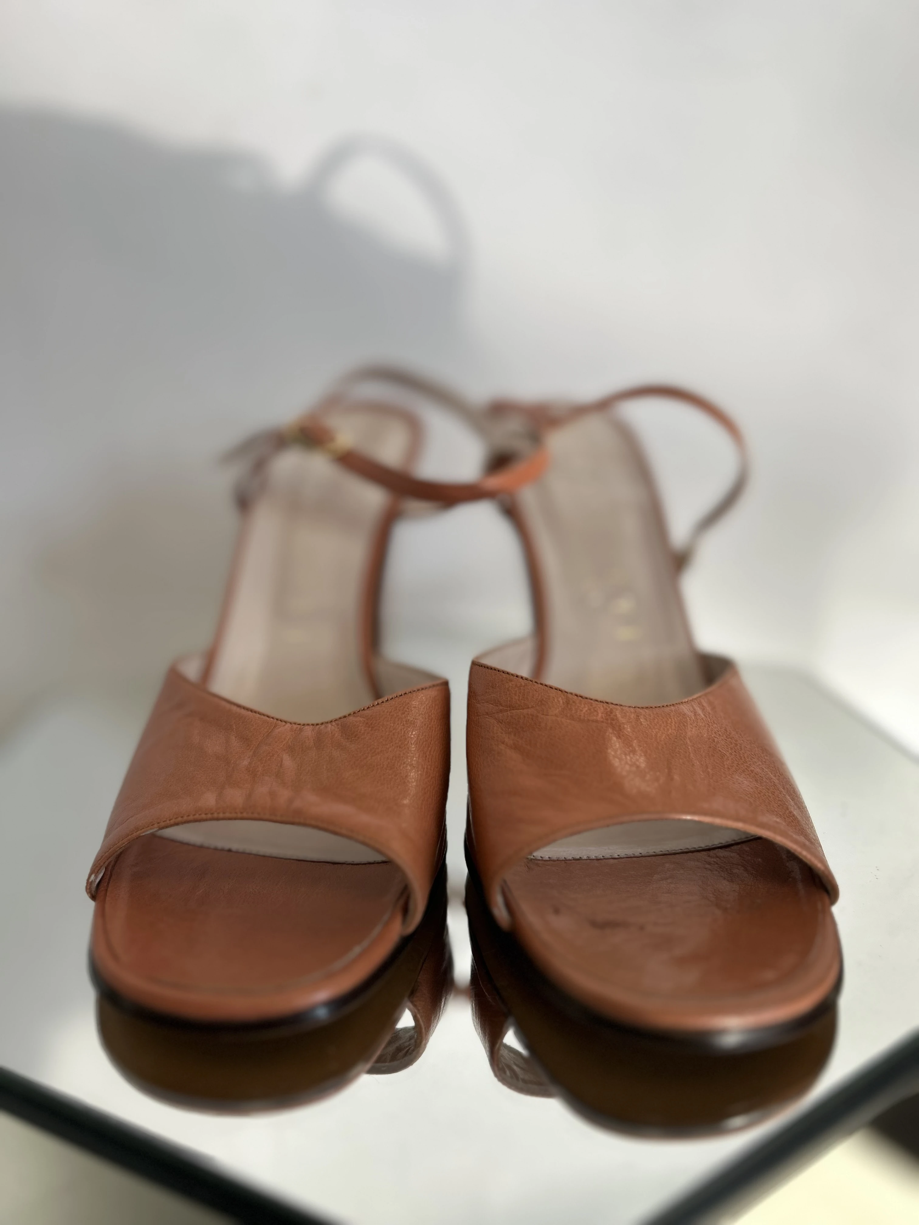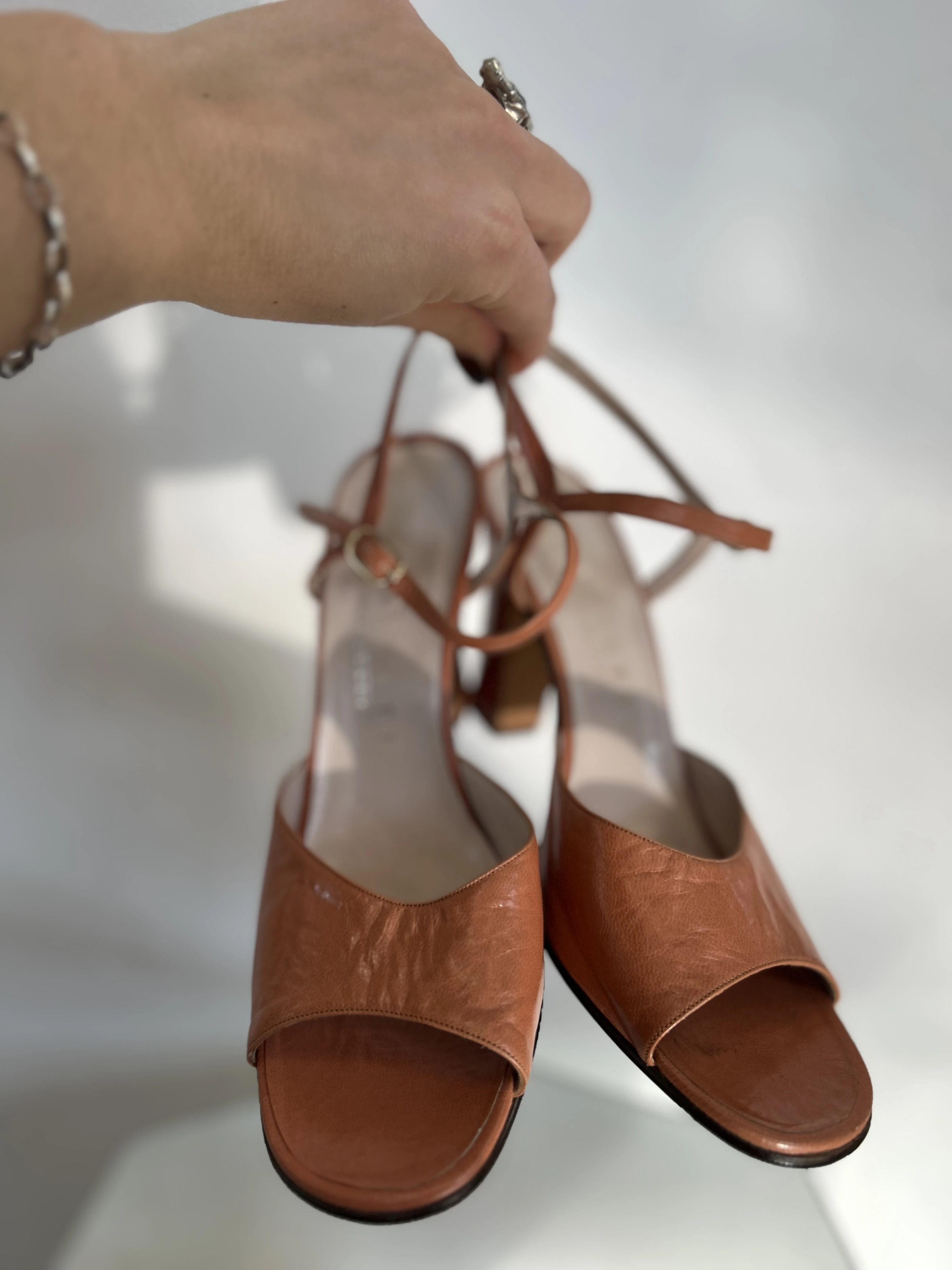 Sandałki na obcasie vintage. Sandałki wykonane w całości z wysokogatunkowej skóry naturalnej. Zapinane na paseczek nad kostką. Sandałki na stabilnym obcasie.