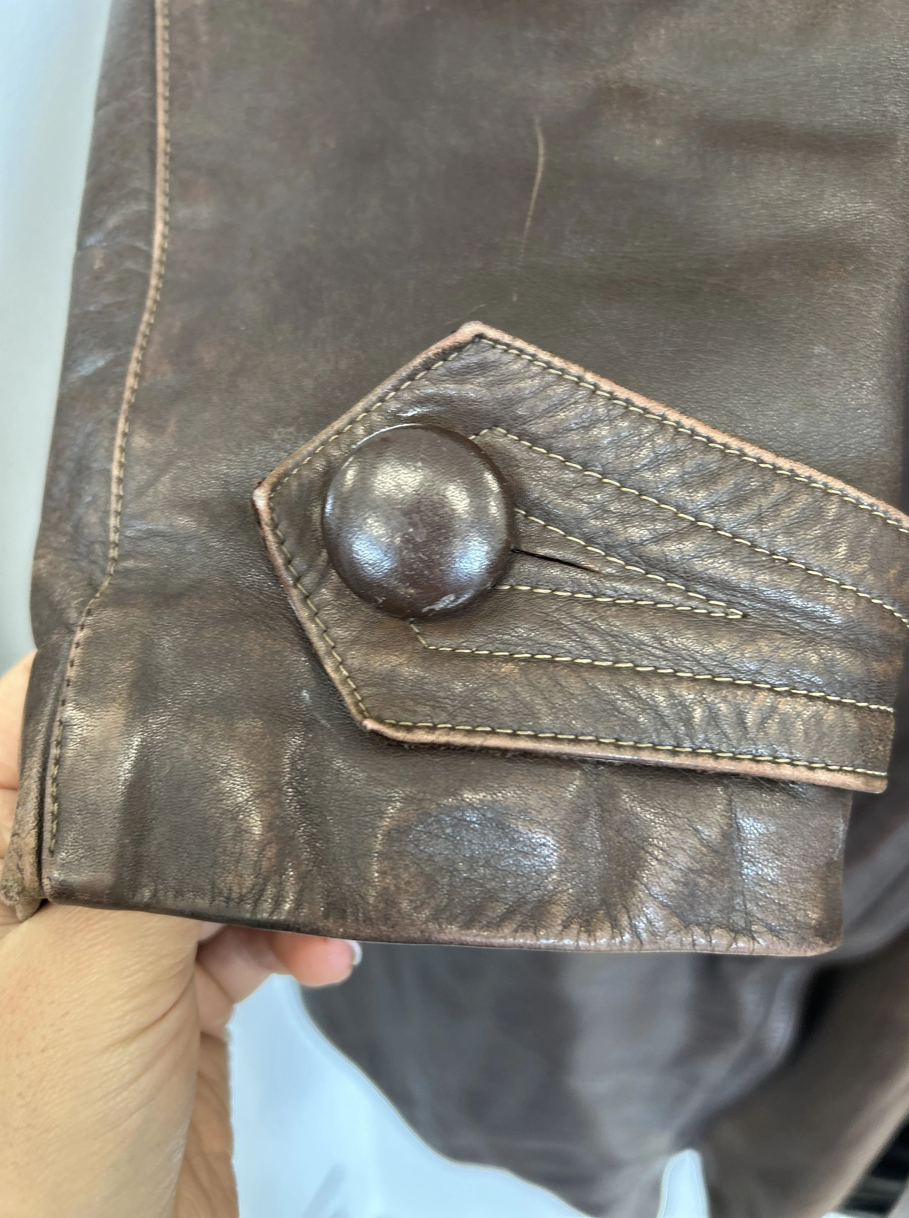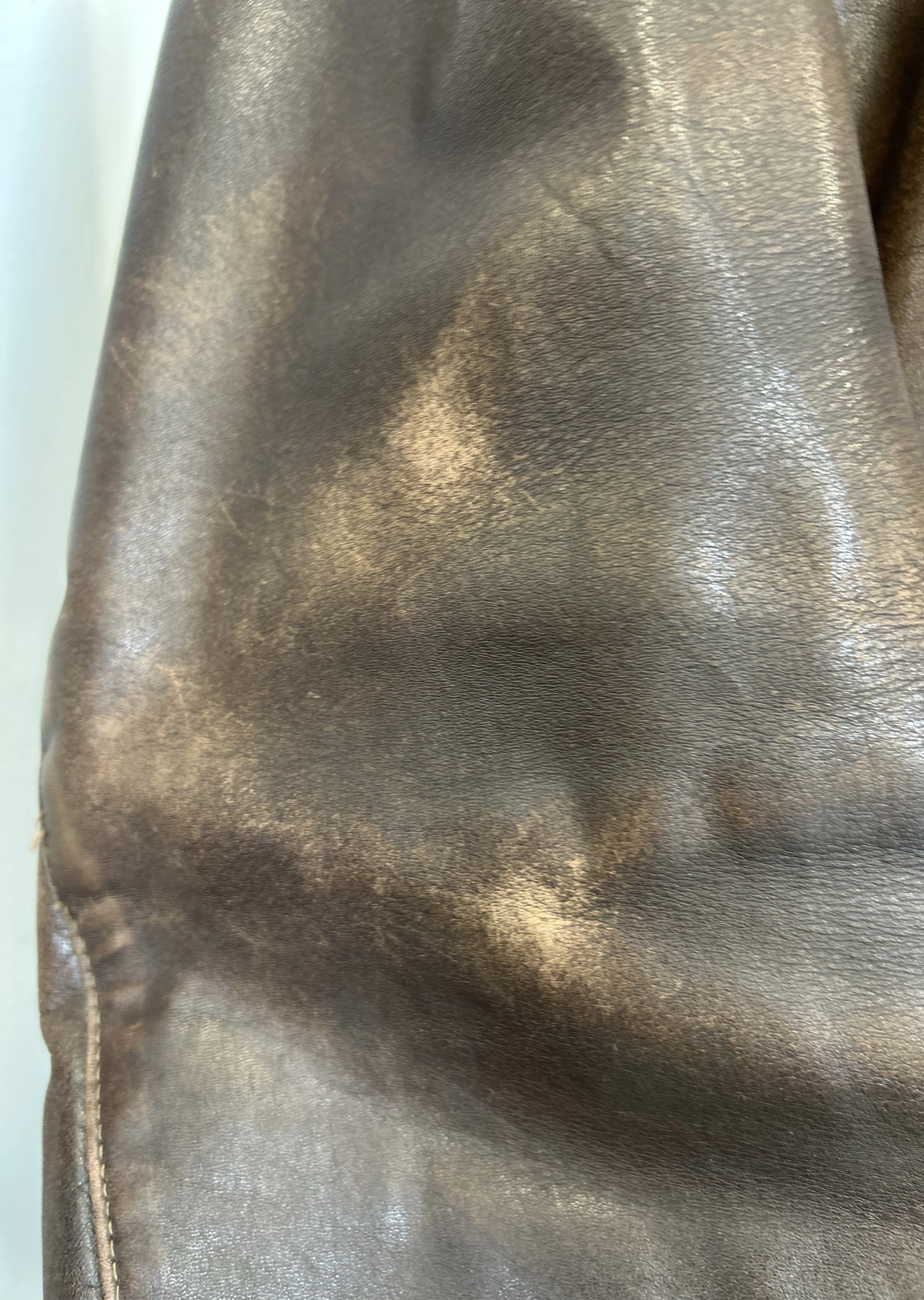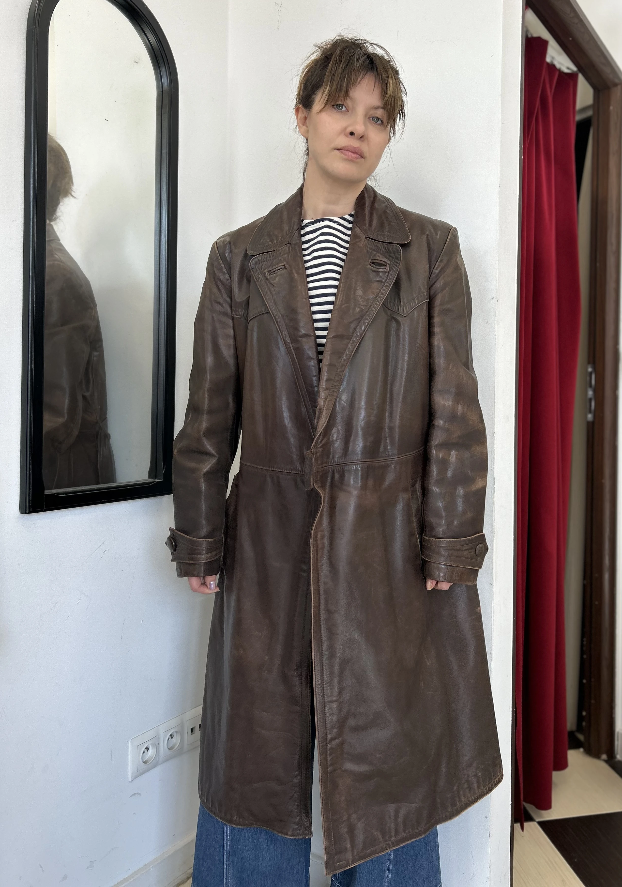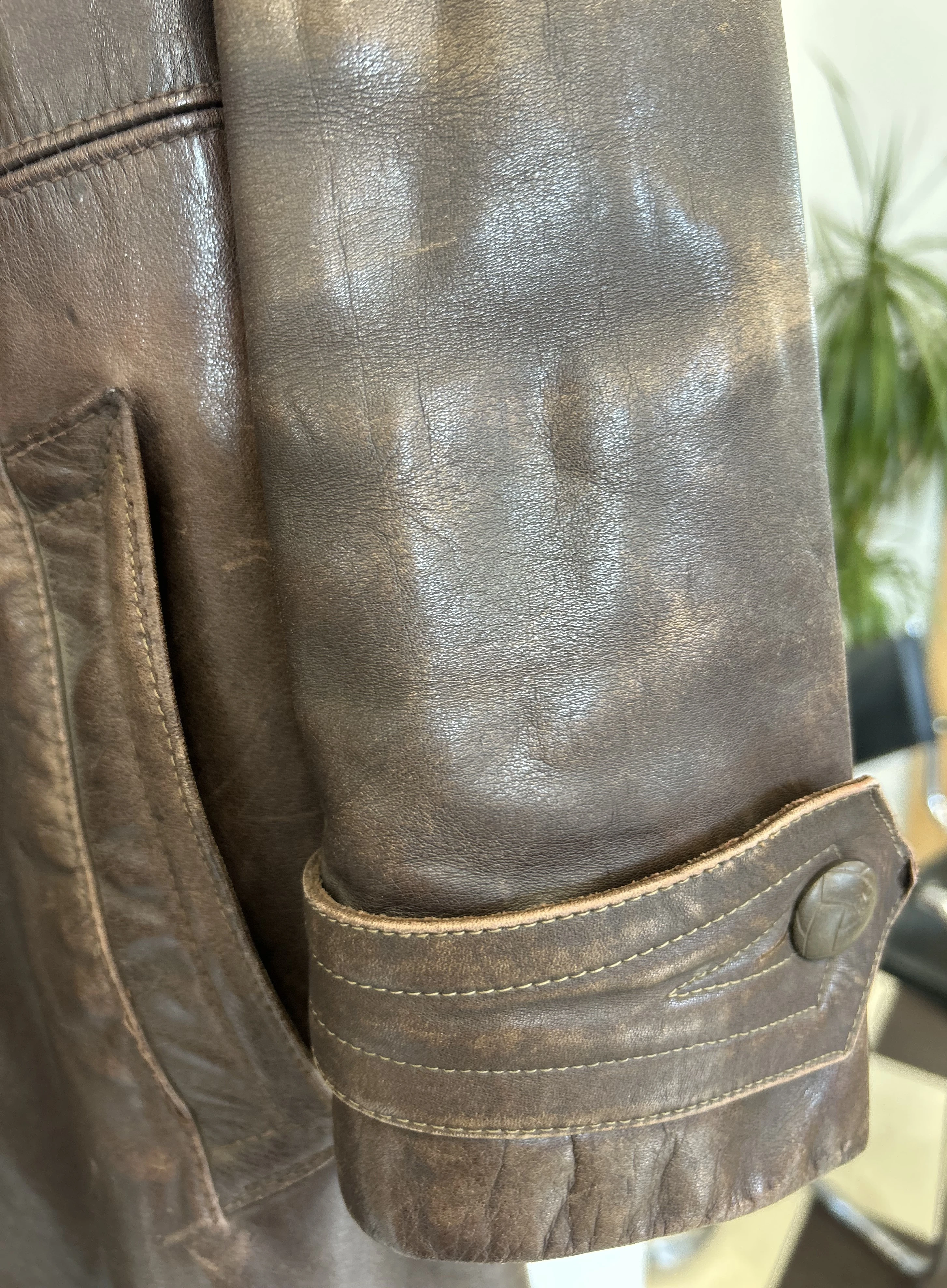 Masywny płaszcz skórzany vintage. Płaszcz w stylu militarnym. Wykonany z ciężkiej, grubej skóry naturalnej. Na skórze jaśniejsze przebarwienia, które nadają mu charakteru. Płaszcz z szerokim pasem. Posiada ślady zużycia, rozprucie wewnątrz jednej kieszeni. Płaszcz został wyczyszczony, wyozonowany, skóra nawilżona i zaimpregnowana. Jest gotowy do noszenia.