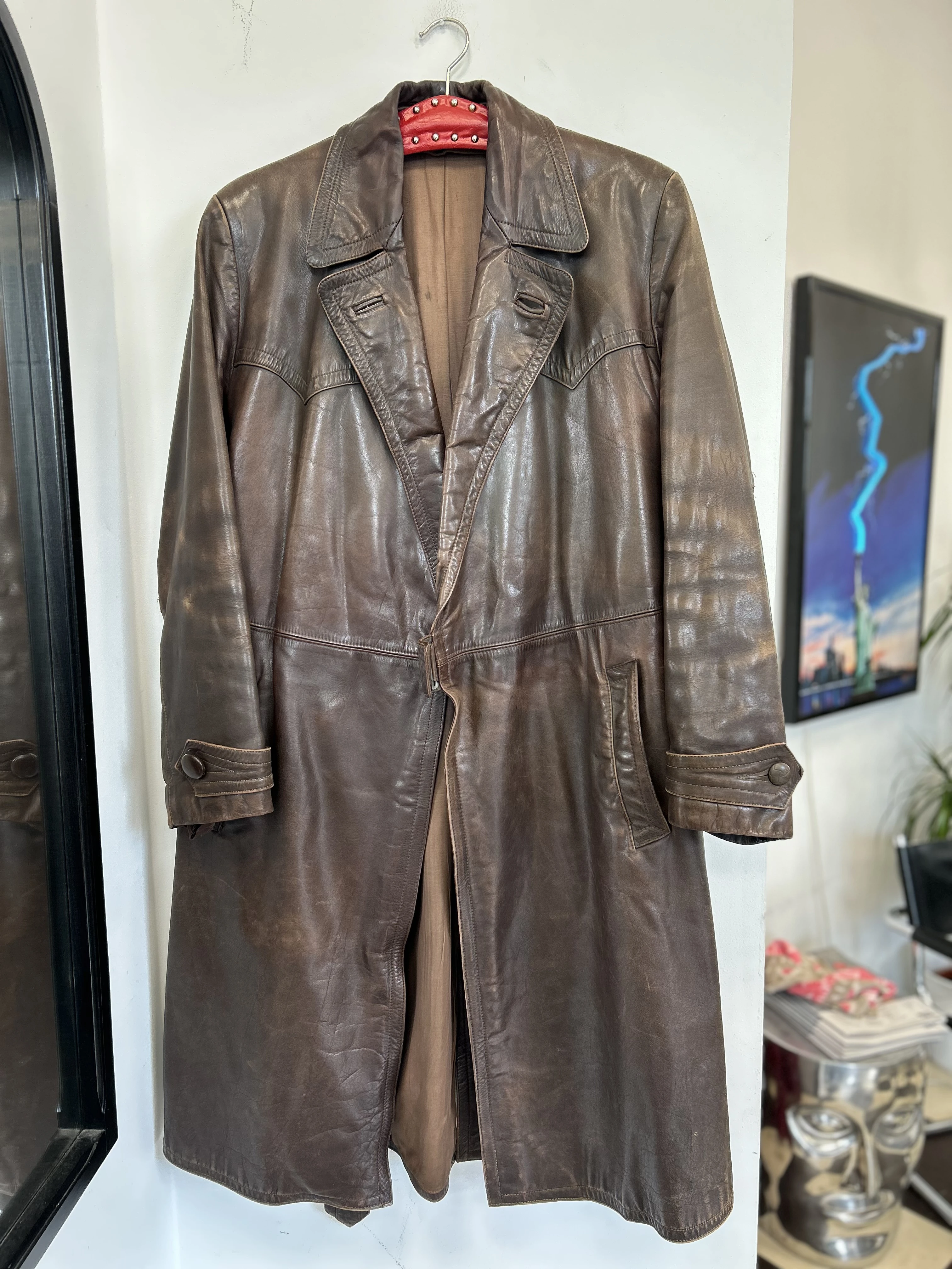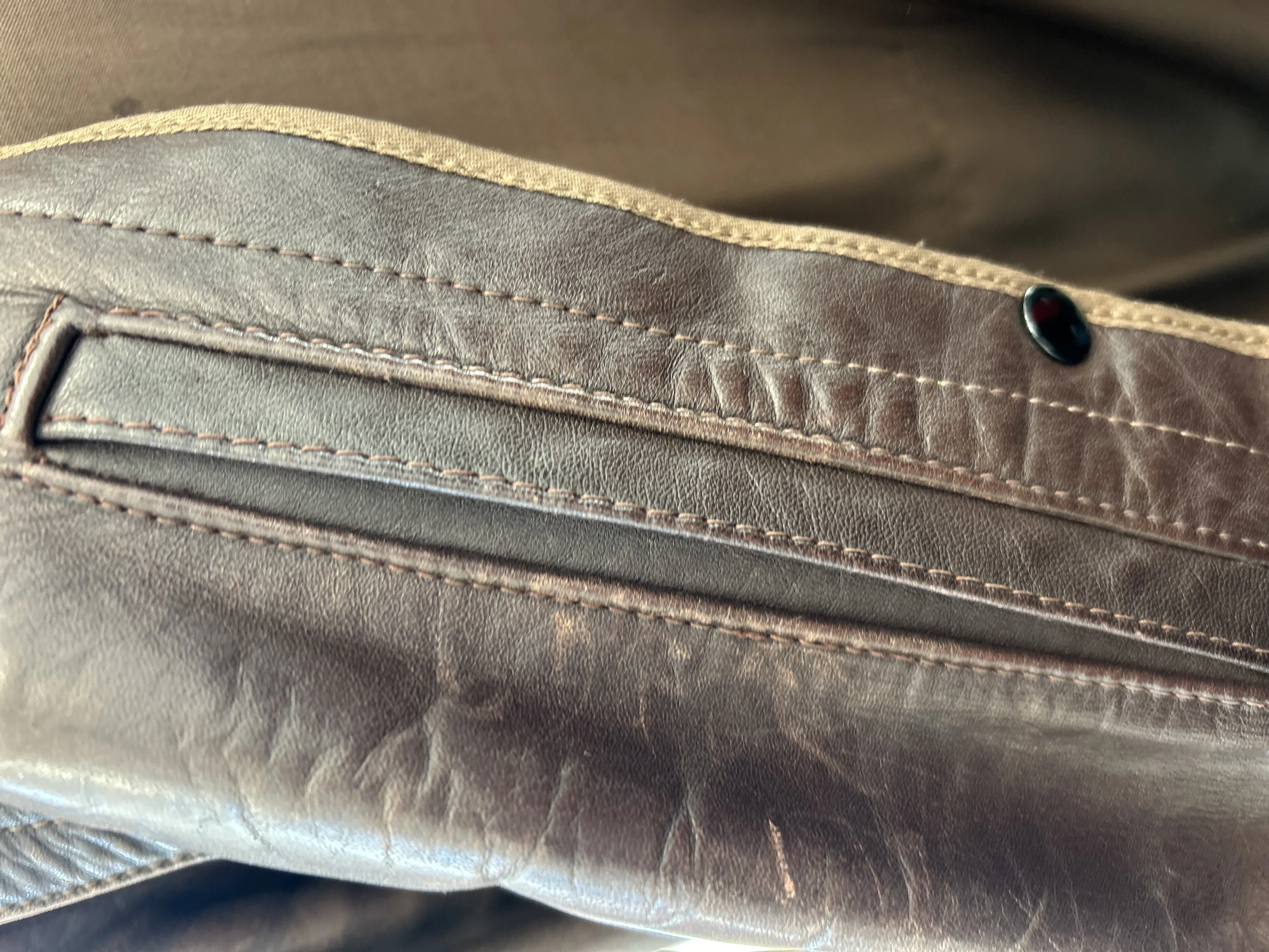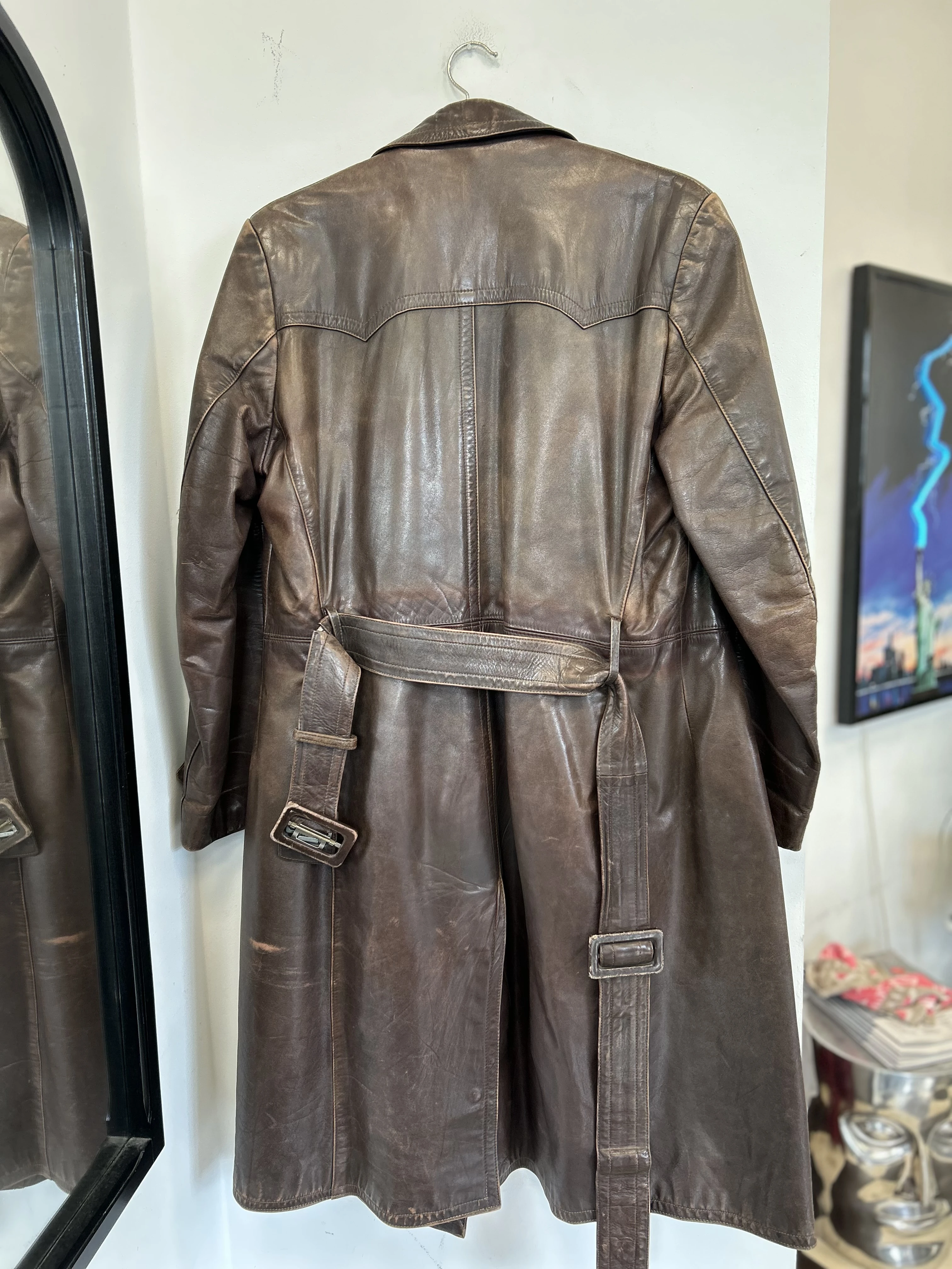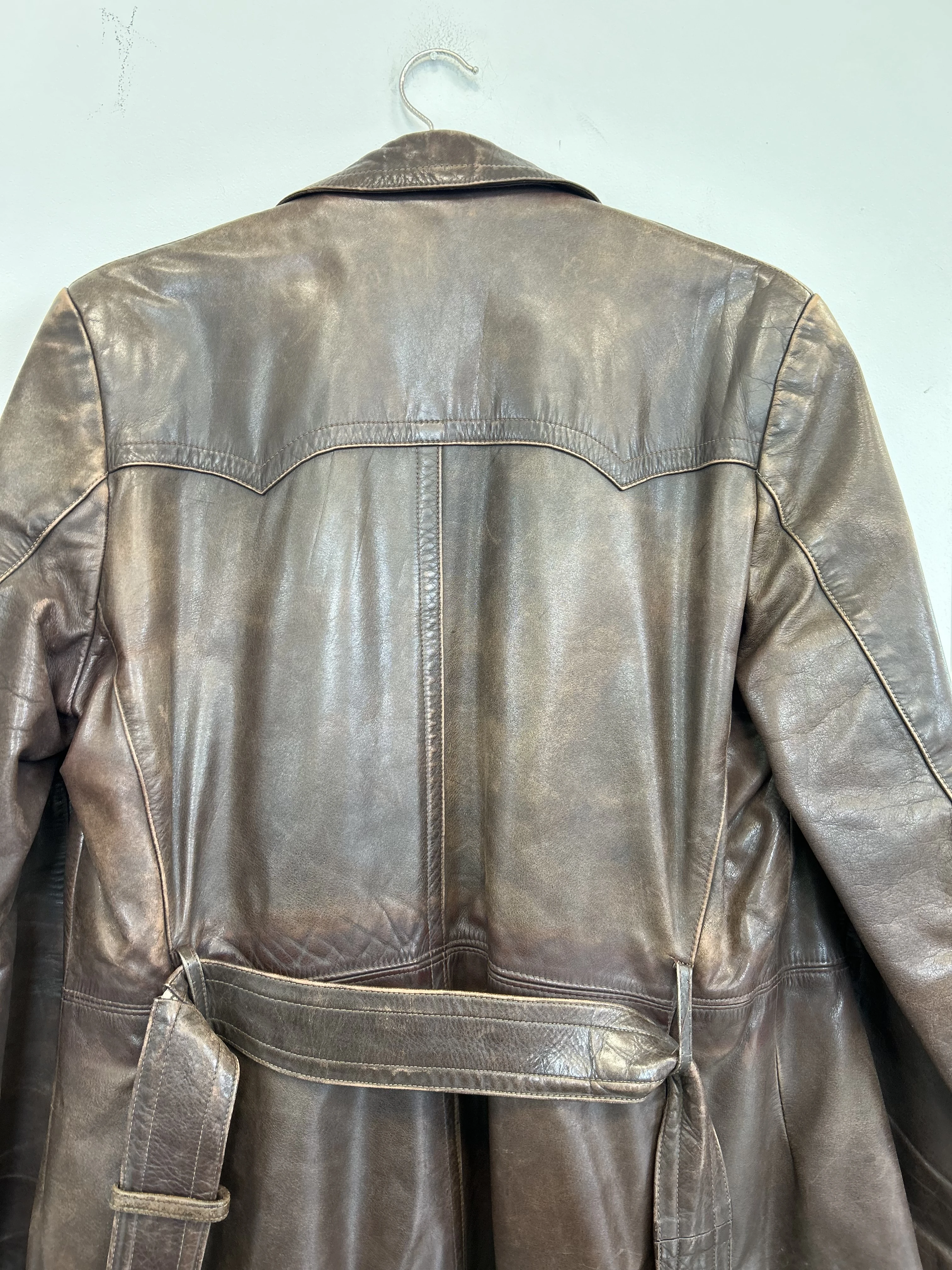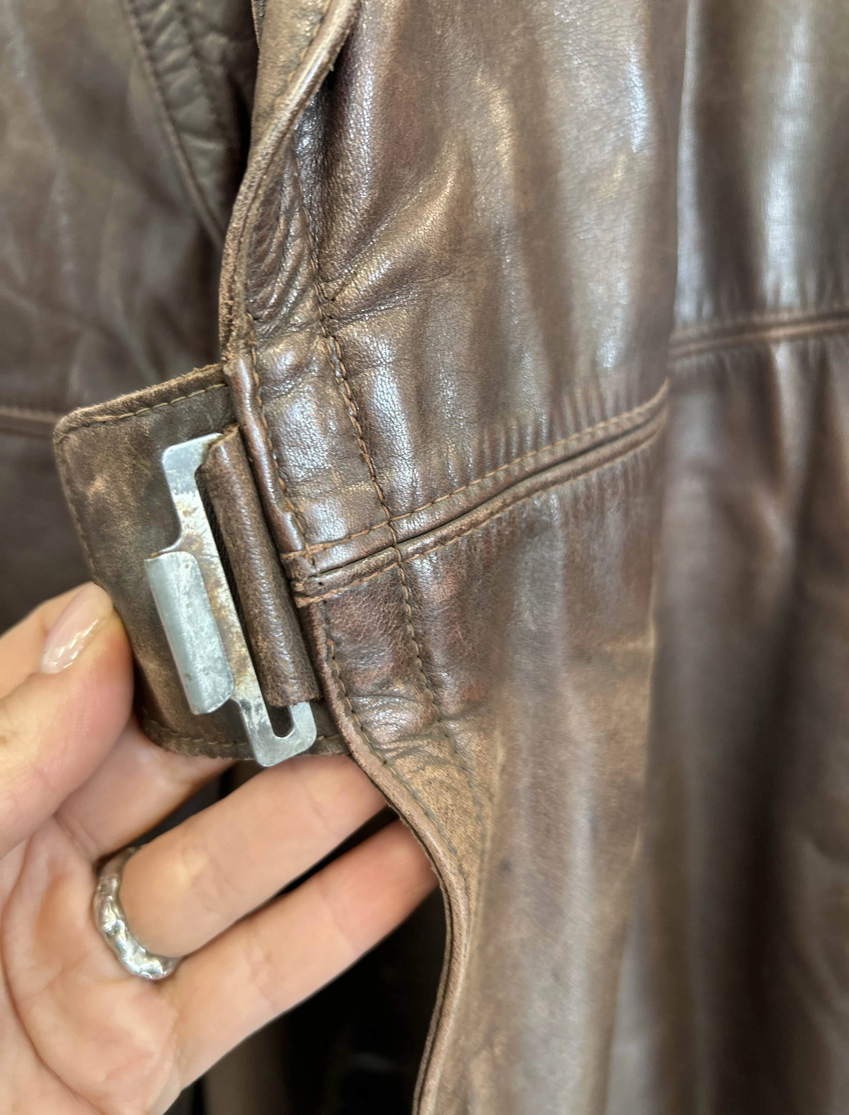 Masywny płaszcz skórzany vintage. Płaszcz w stylu militarnym. Wykonany z ciężkiej, grubej skóry naturalnej. Na skórze jaśniejsze przebarwienia, które nadają mu charakteru. Płaszcz z szerokim pasem. Posiada ślady zużycia, rozprucie wewnątrz jednej kieszeni. Płaszcz został wyczyszczony, wyozonowany, skóra nawilżona i zaimpregnowana. Jest gotowy do noszenia.