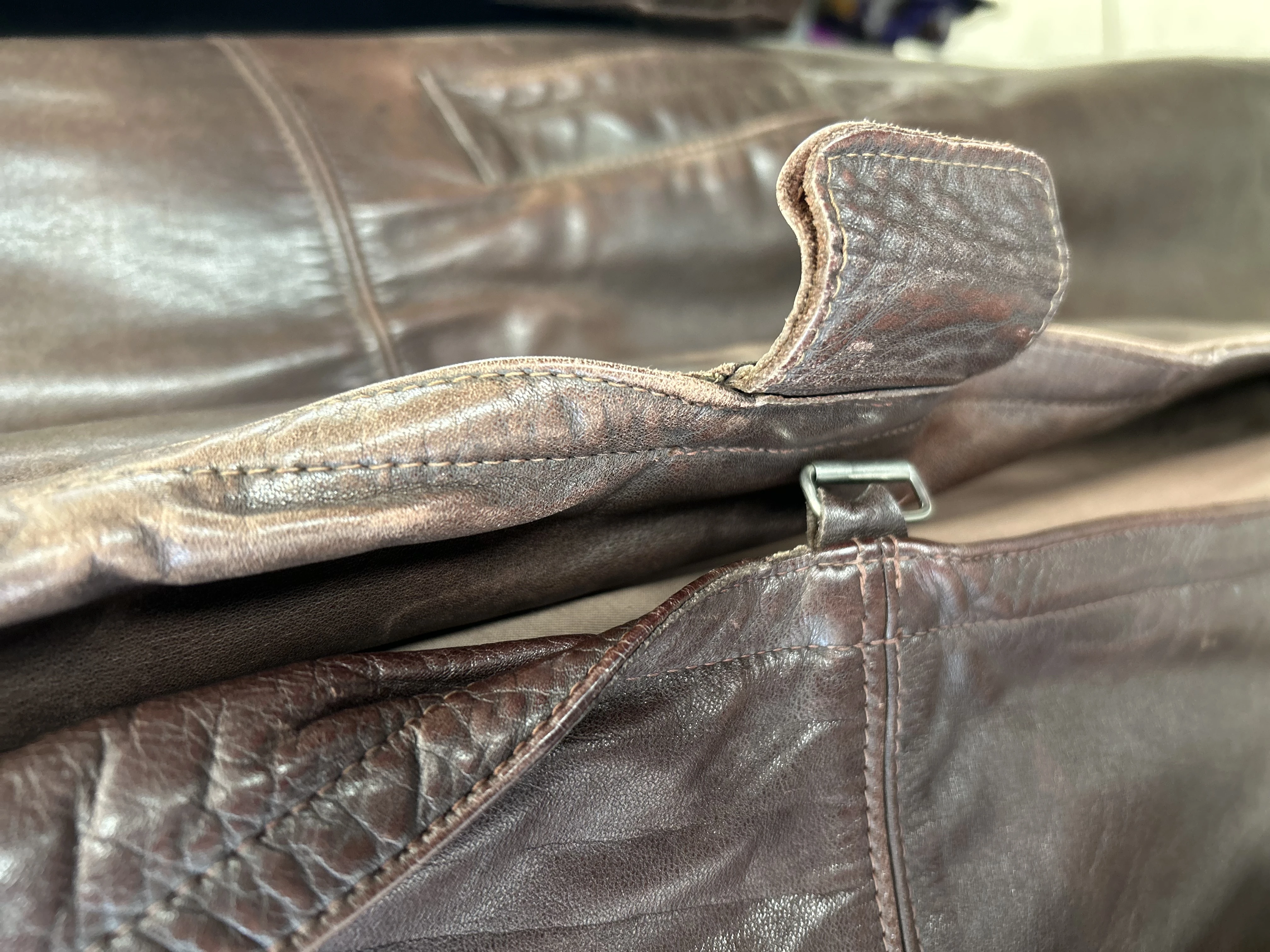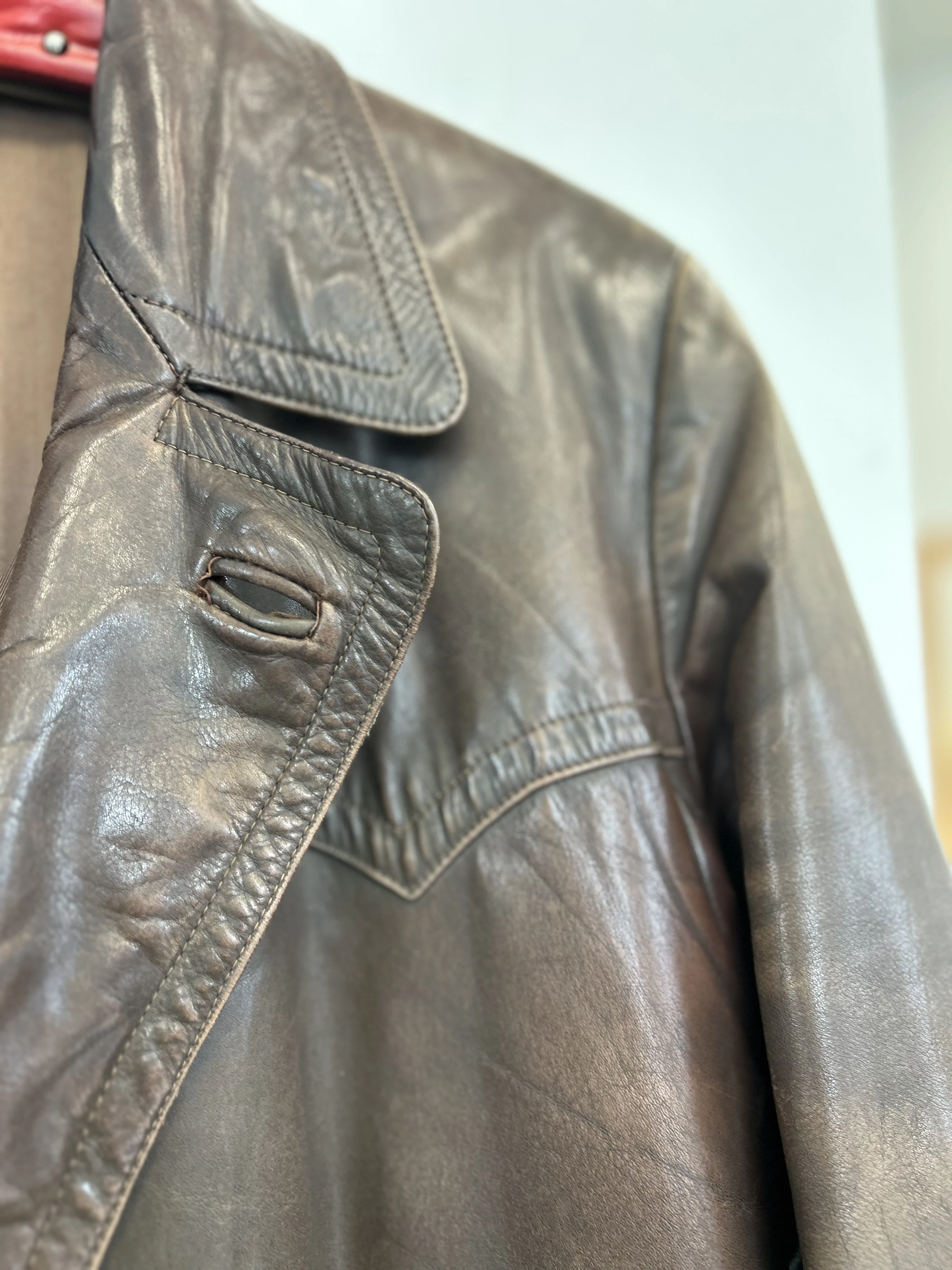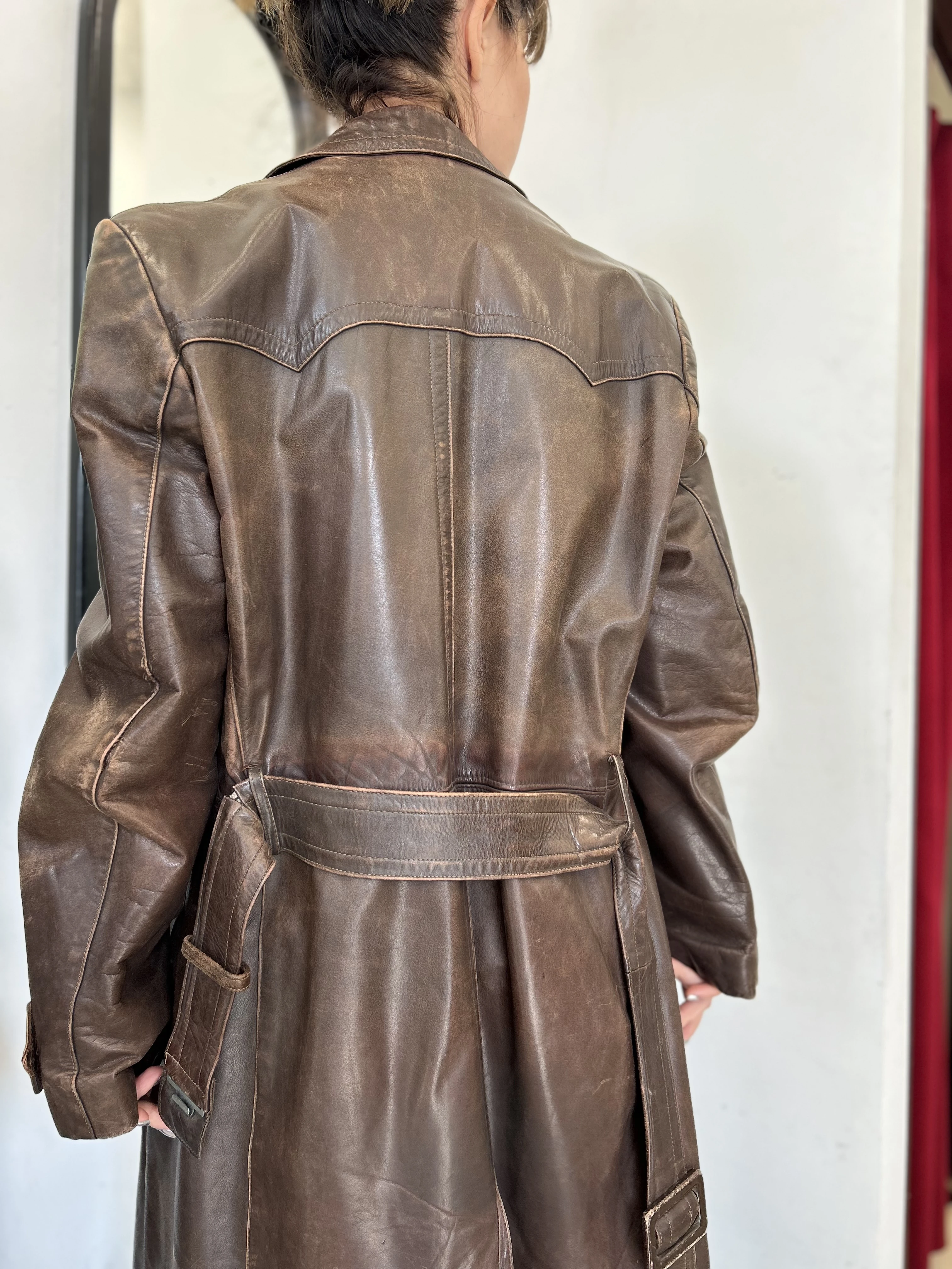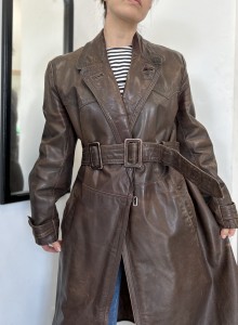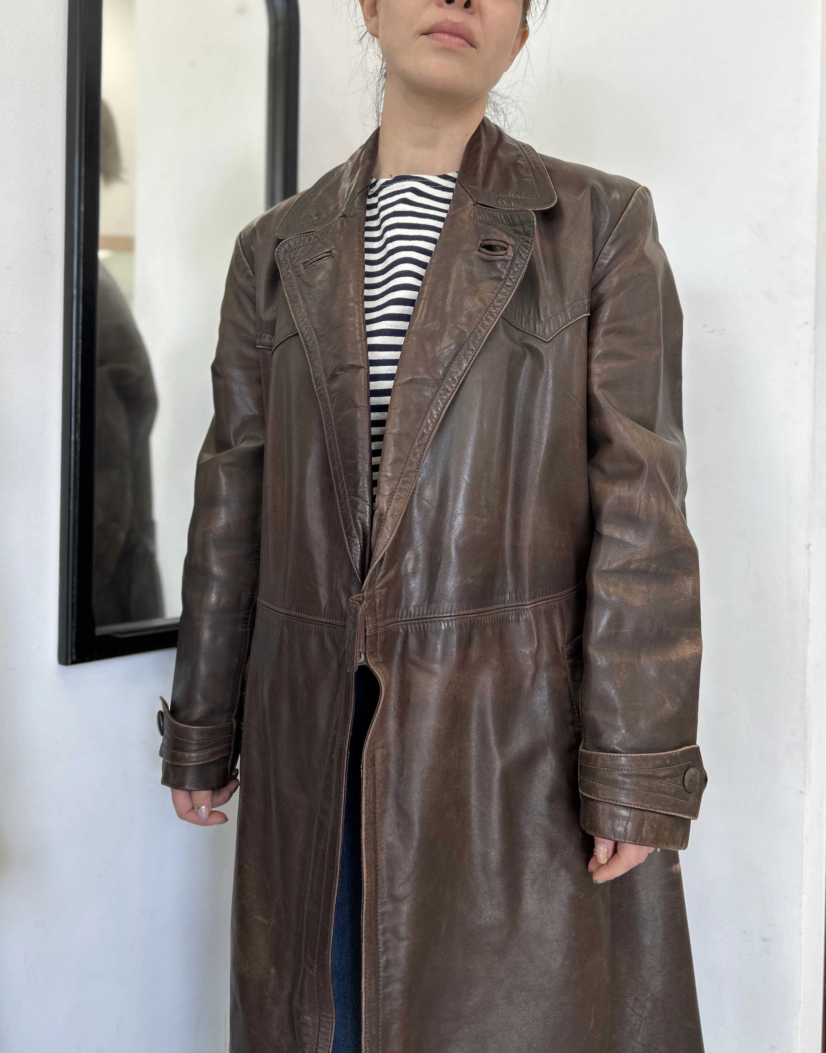Masywny płaszcz skórzany vintage. Płaszcz w stylu militarnym. Wykonany z ciężkiej, grubej skóry naturalnej. Na skórze jaśniejsze przebarwienia, które nadają mu charakteru. Płaszcz z szerokim pasem. Posiada ślady zużycia, rozprucie wewnątrz jednej kieszeni. Płaszcz został wyczyszczony, wyozonowany, skóra nawilżona i zaimpregnowana. Jest gotowy do noszenia.