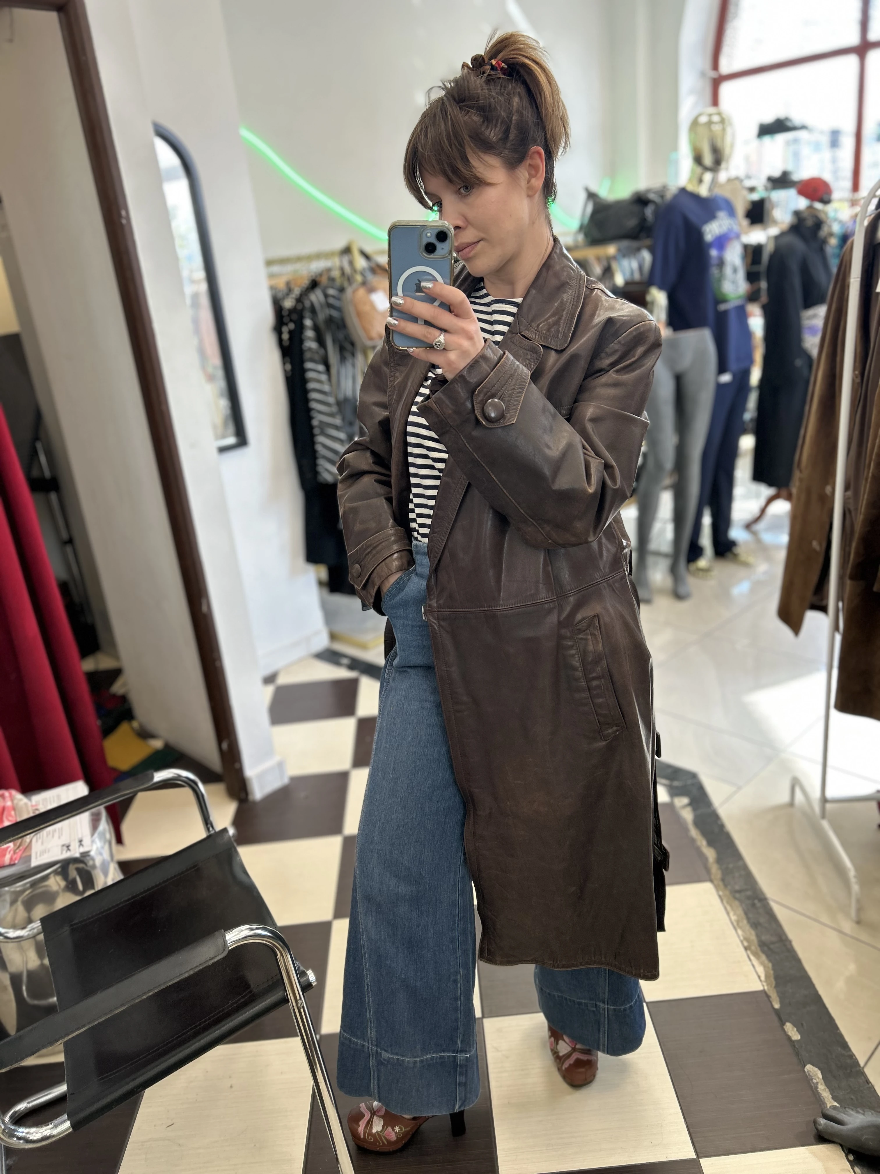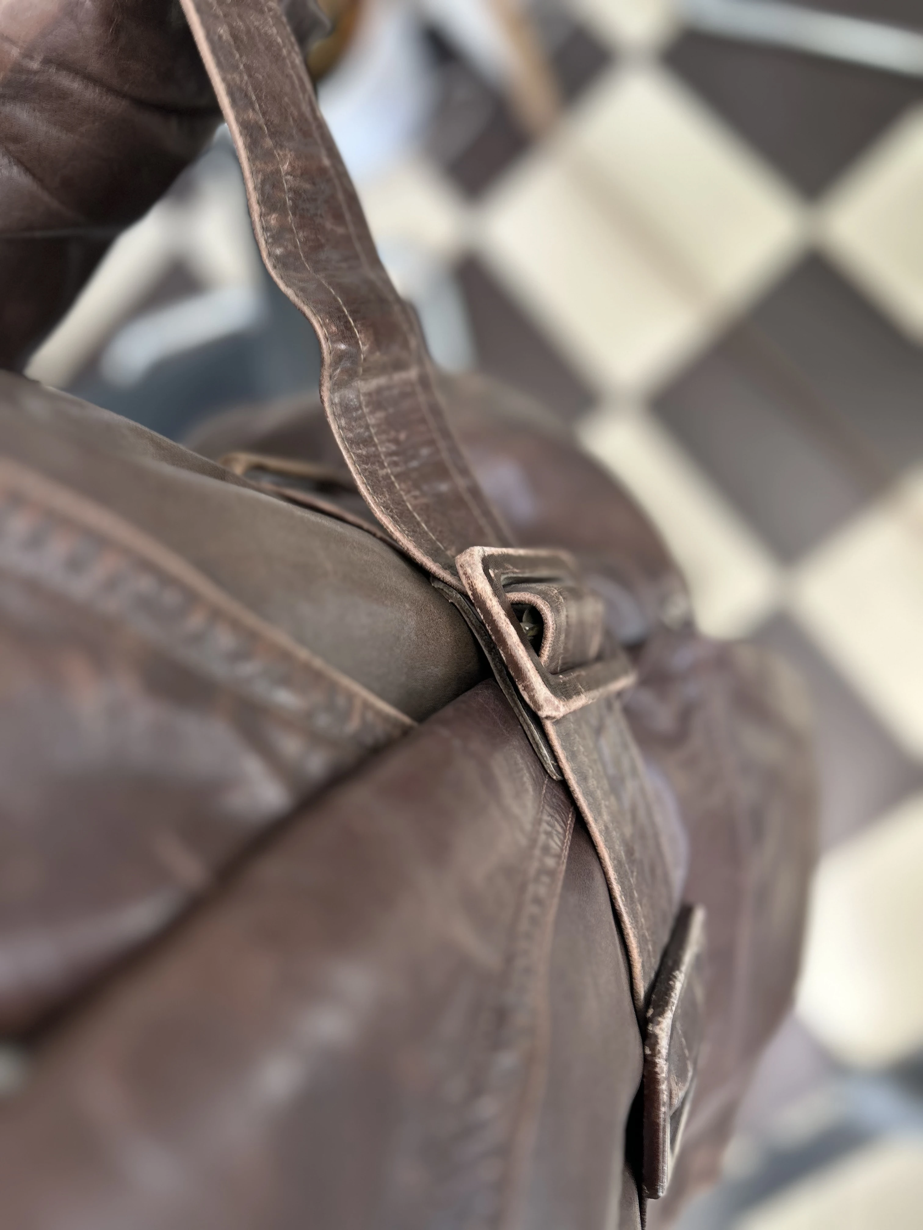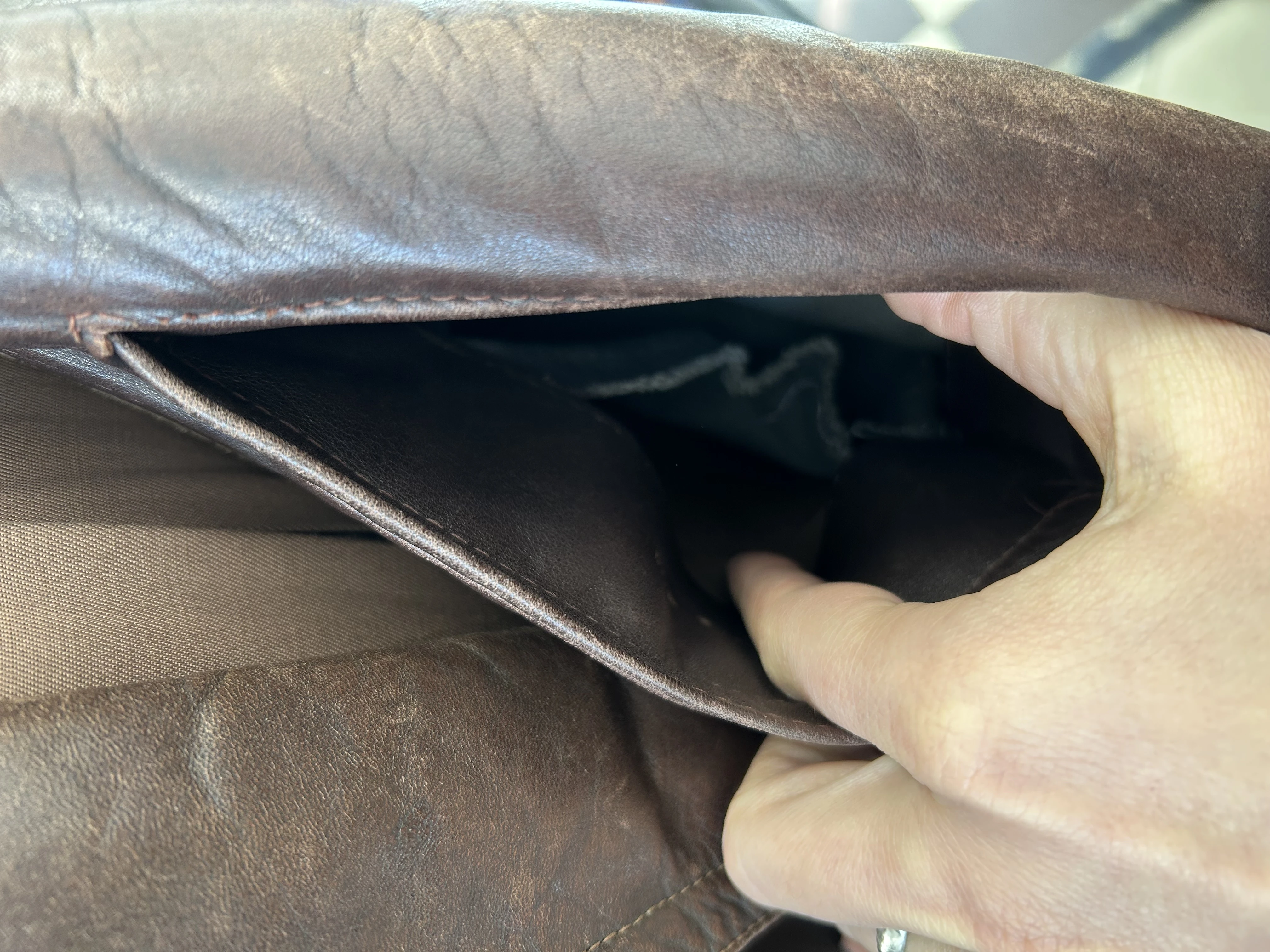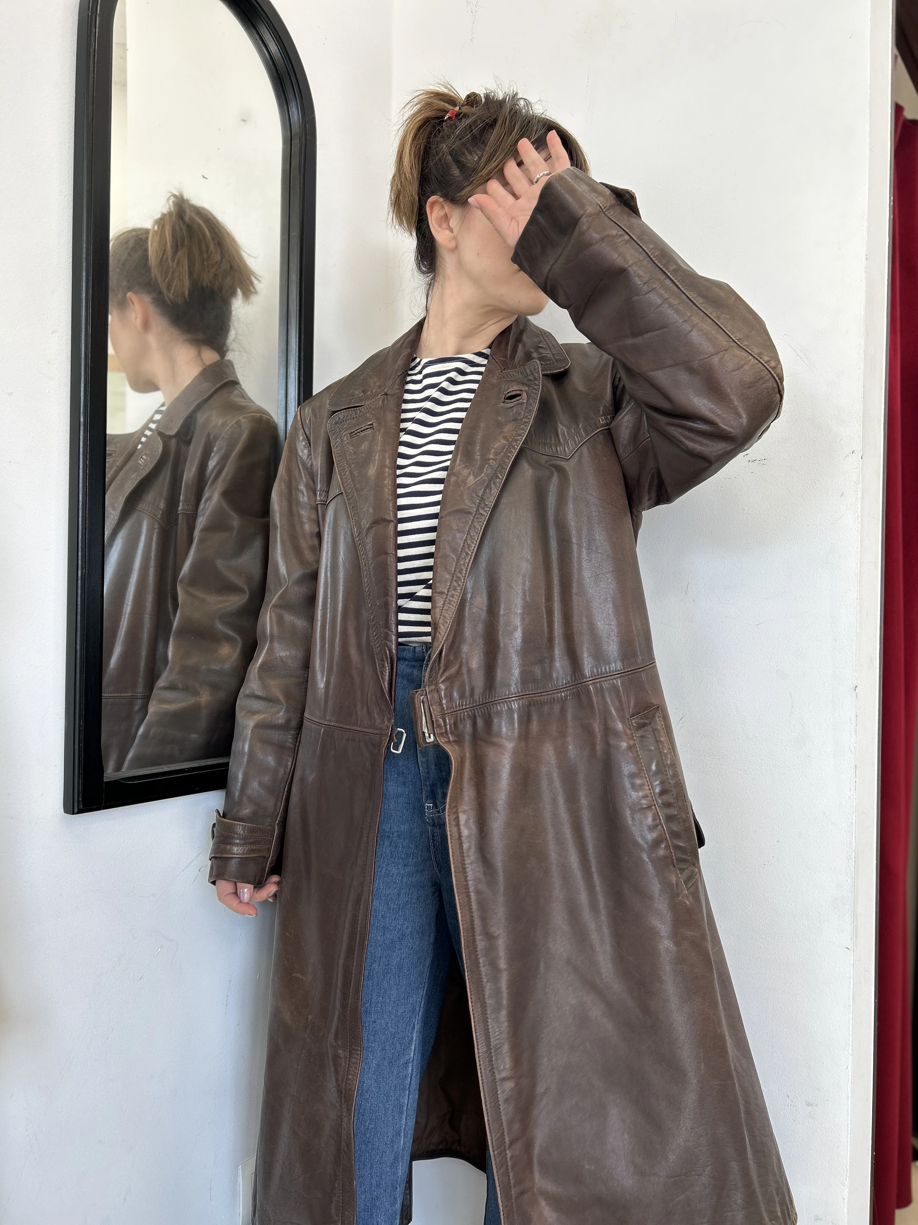 Masywny płaszcz skórzany vintage. Płaszcz w stylu militarnym. Wykonany z ciężkiej, grubej skóry naturalnej. Na skórze jaśniejsze przebarwienia, które nadają mu charakteru. Płaszcz z szerokim pasem. Posiada ślady zużycia, rozprucie wewnątrz jednej kieszeni. Płaszcz został wyczyszczony, wyozonowany, skóra nawilżona i zaimpregnowana. Jest gotowy do noszenia.