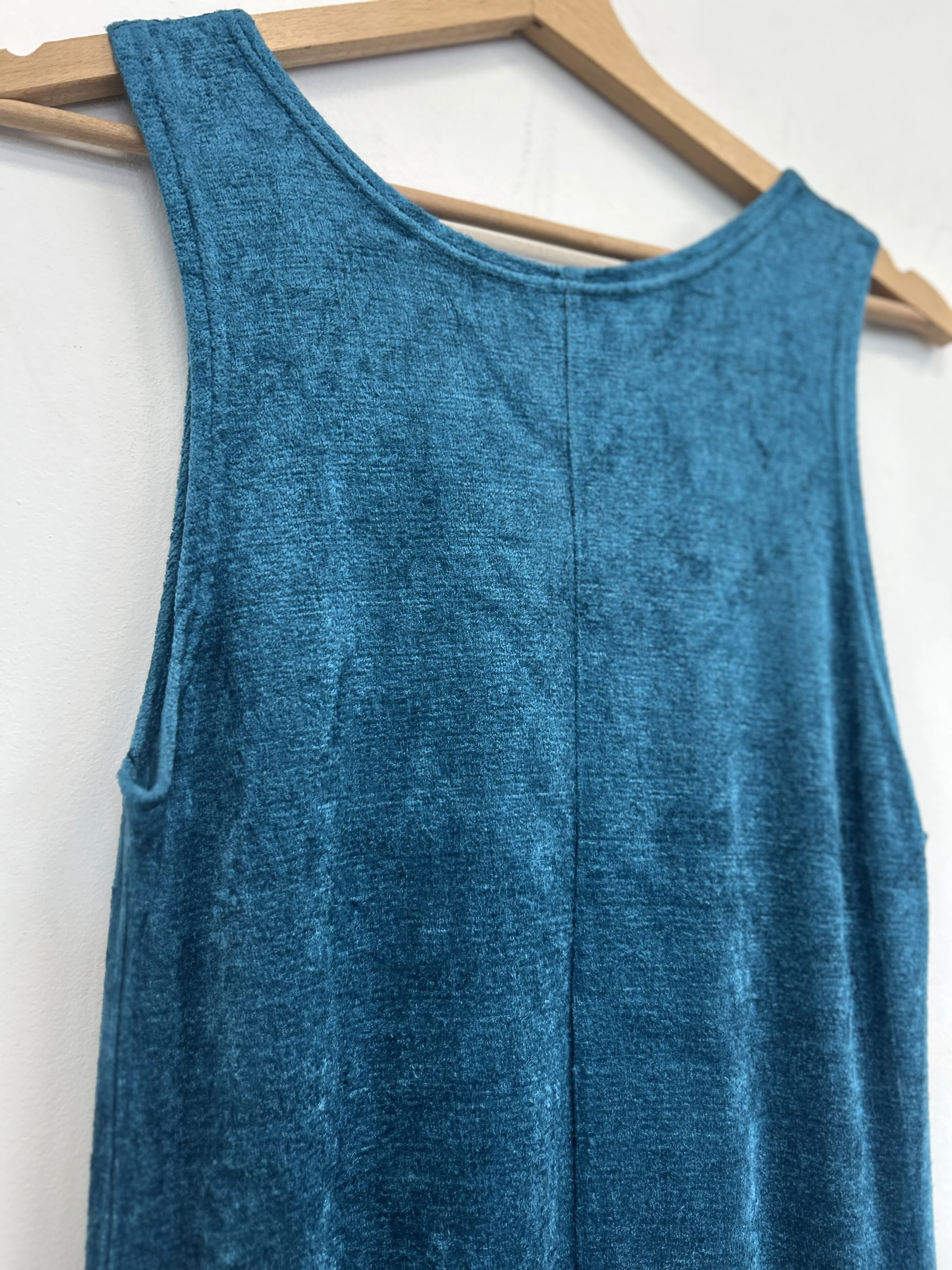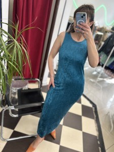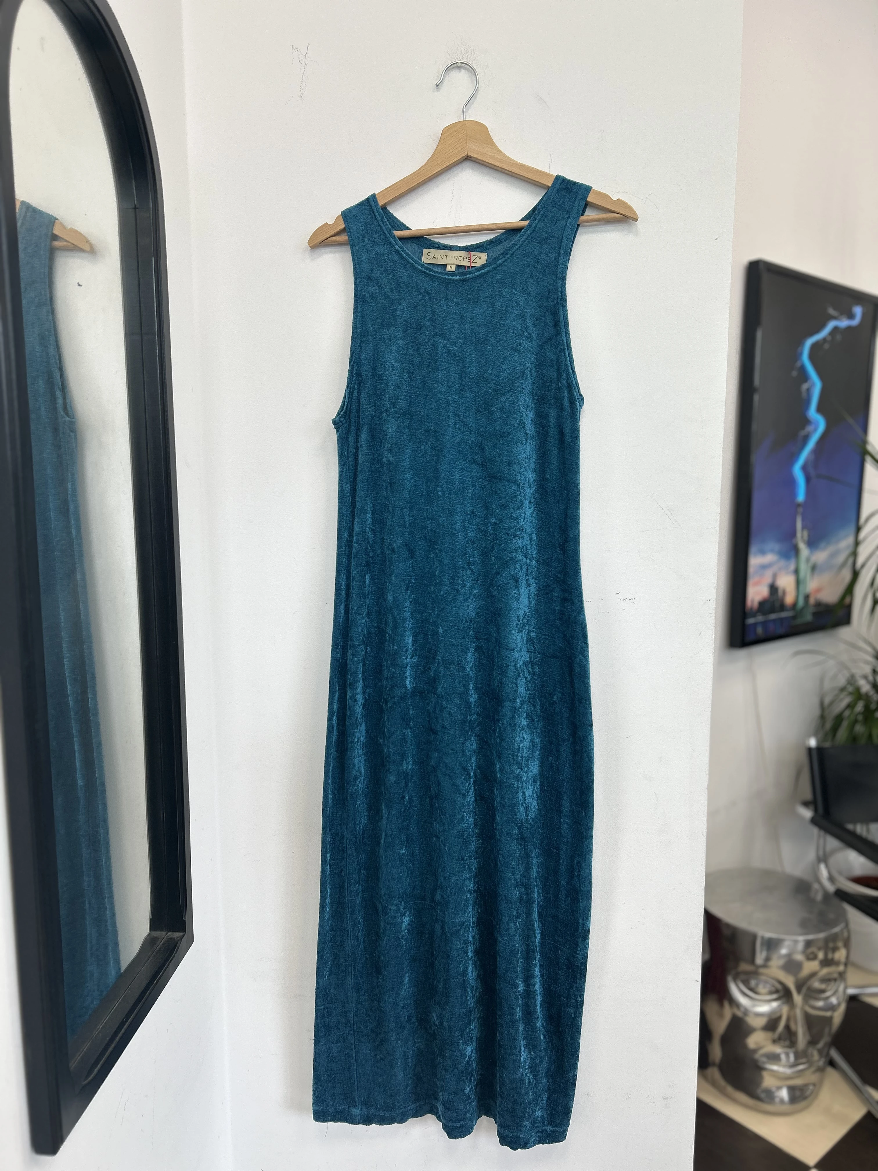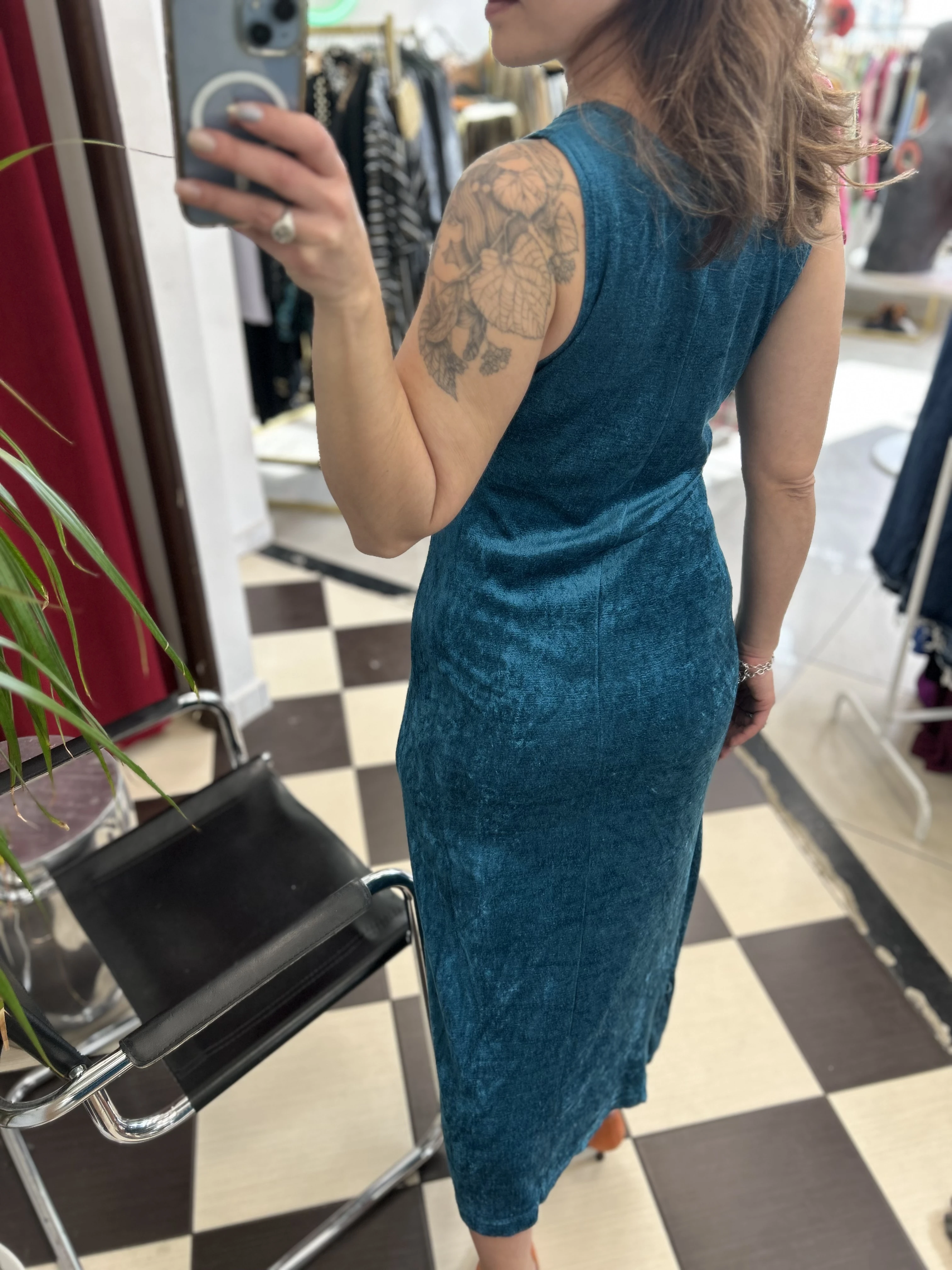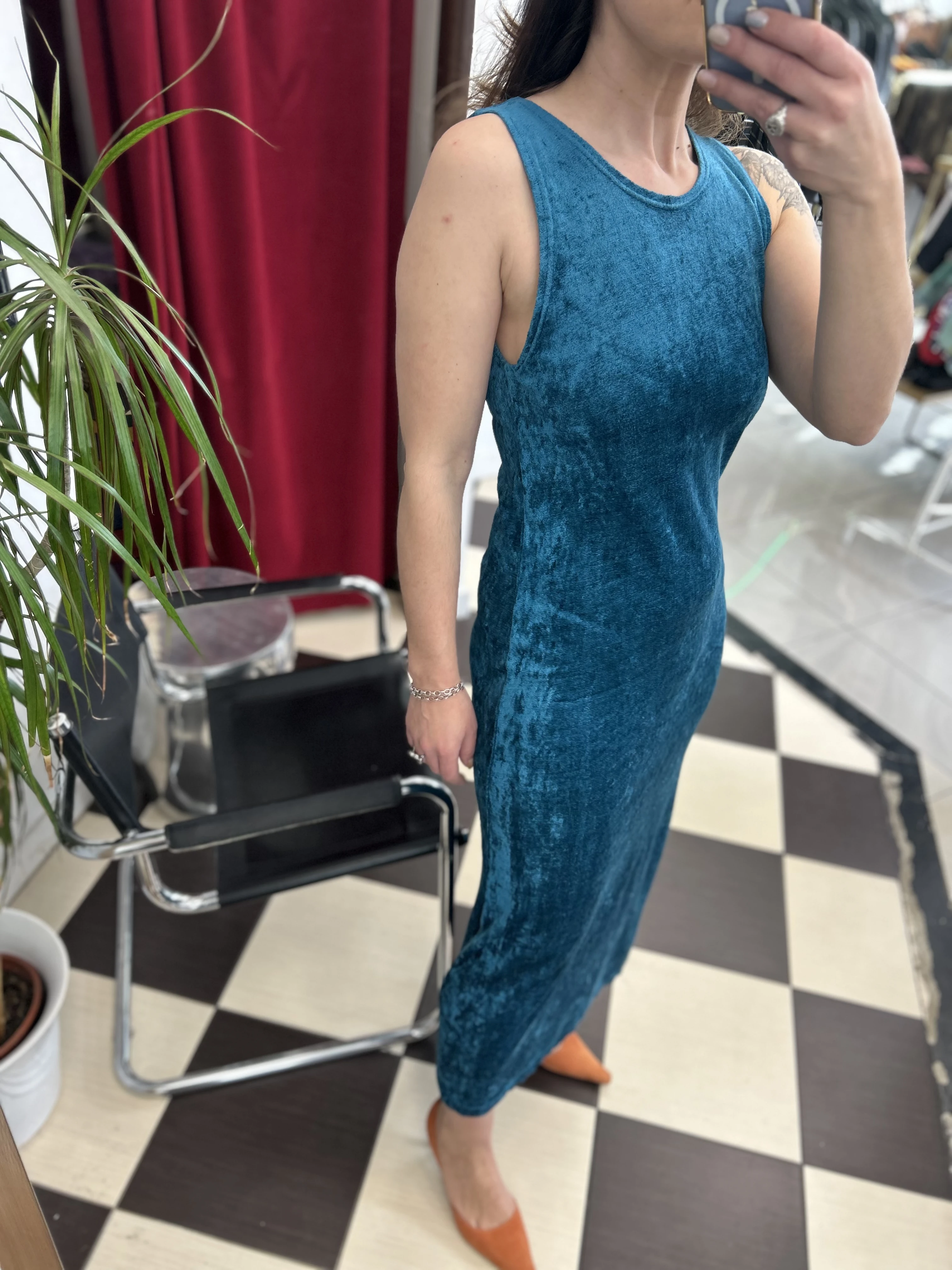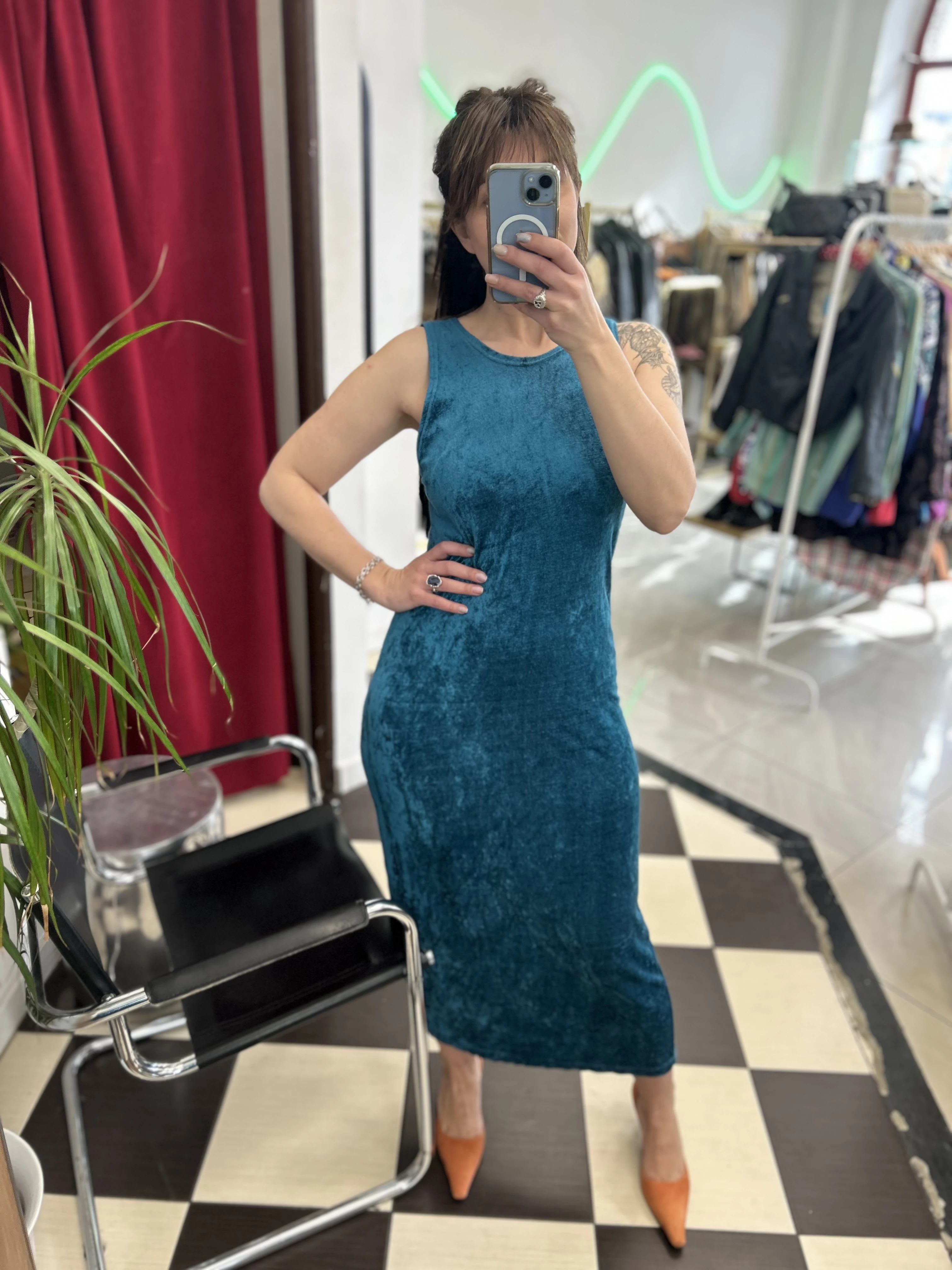 Welurowa sukienka vintage w kolorze turkusowym. Sukienka maxi o dopasowanym fasonie. MIękka i zwracająca uwagę.