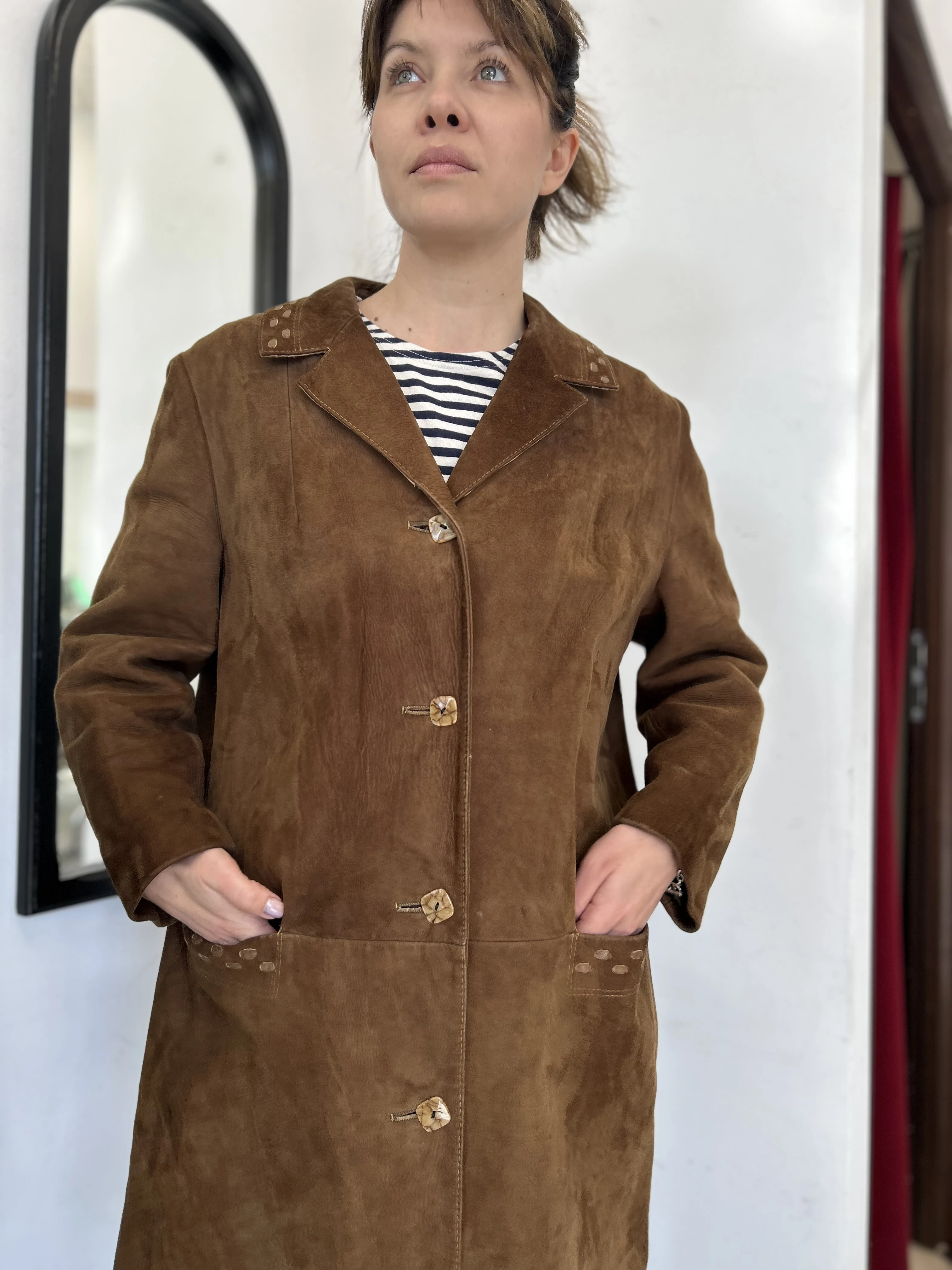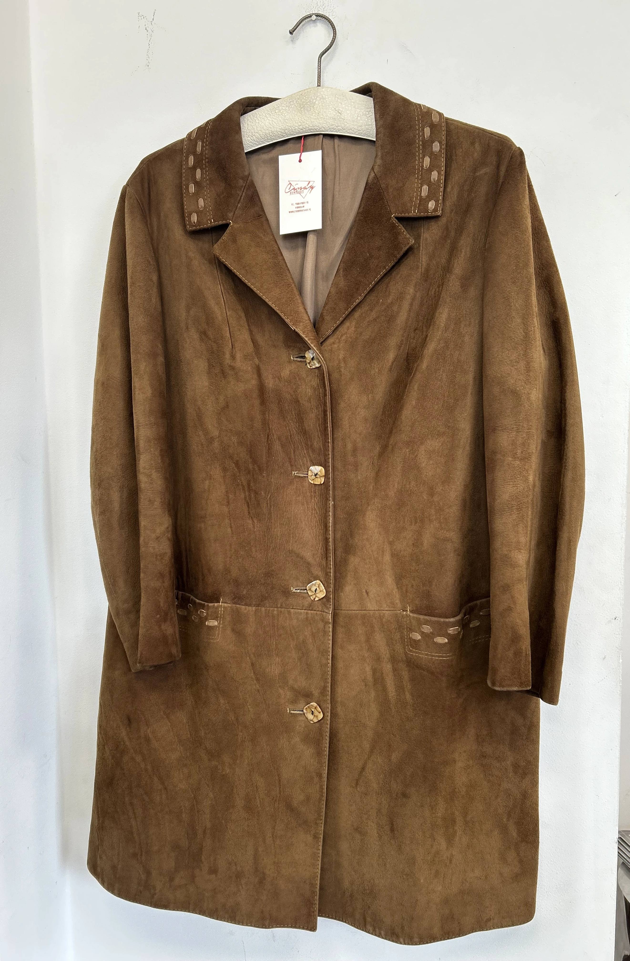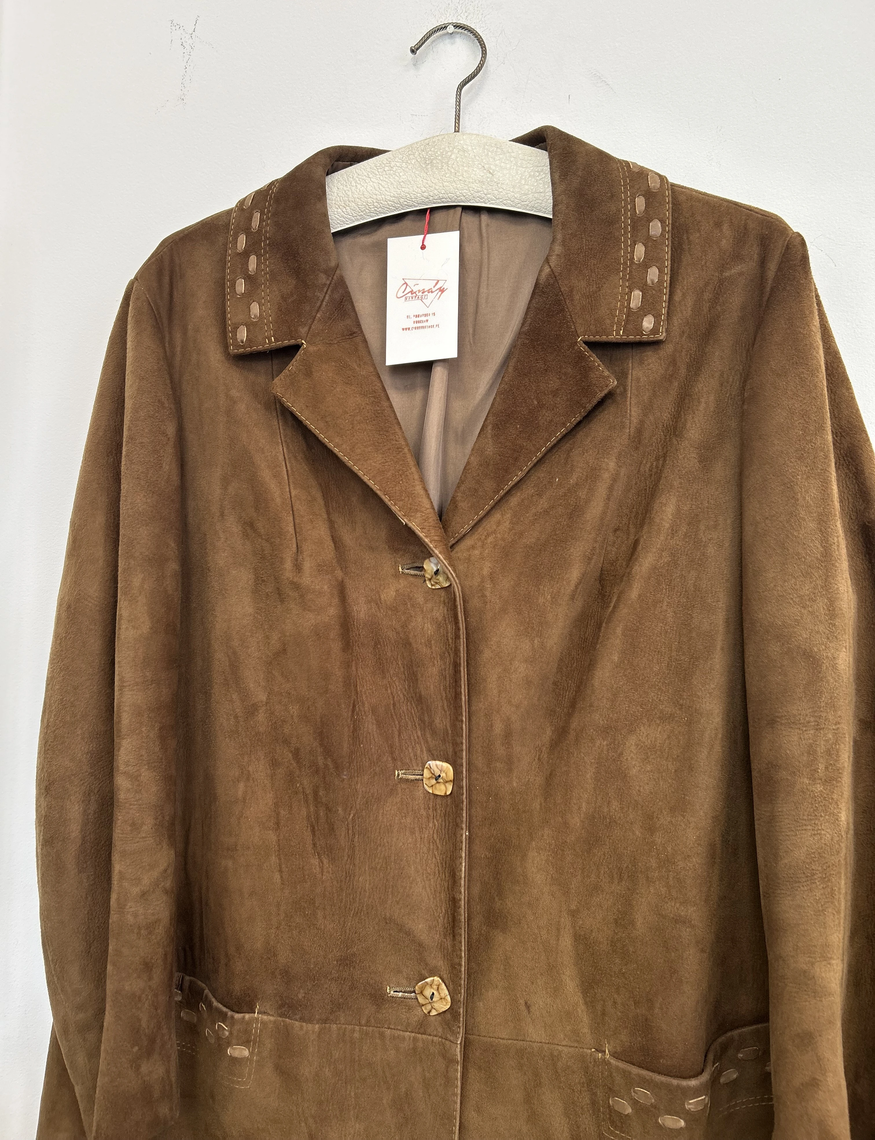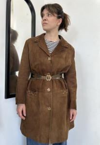 Zamszowy płaszcz vintage. Płaszcz z miękkiej skóry naturalnej zamszowej. Zapinany na guziki. Płaszcz po wyczyszczeniu, wyozonowaniu i zaimpregnowaniu.