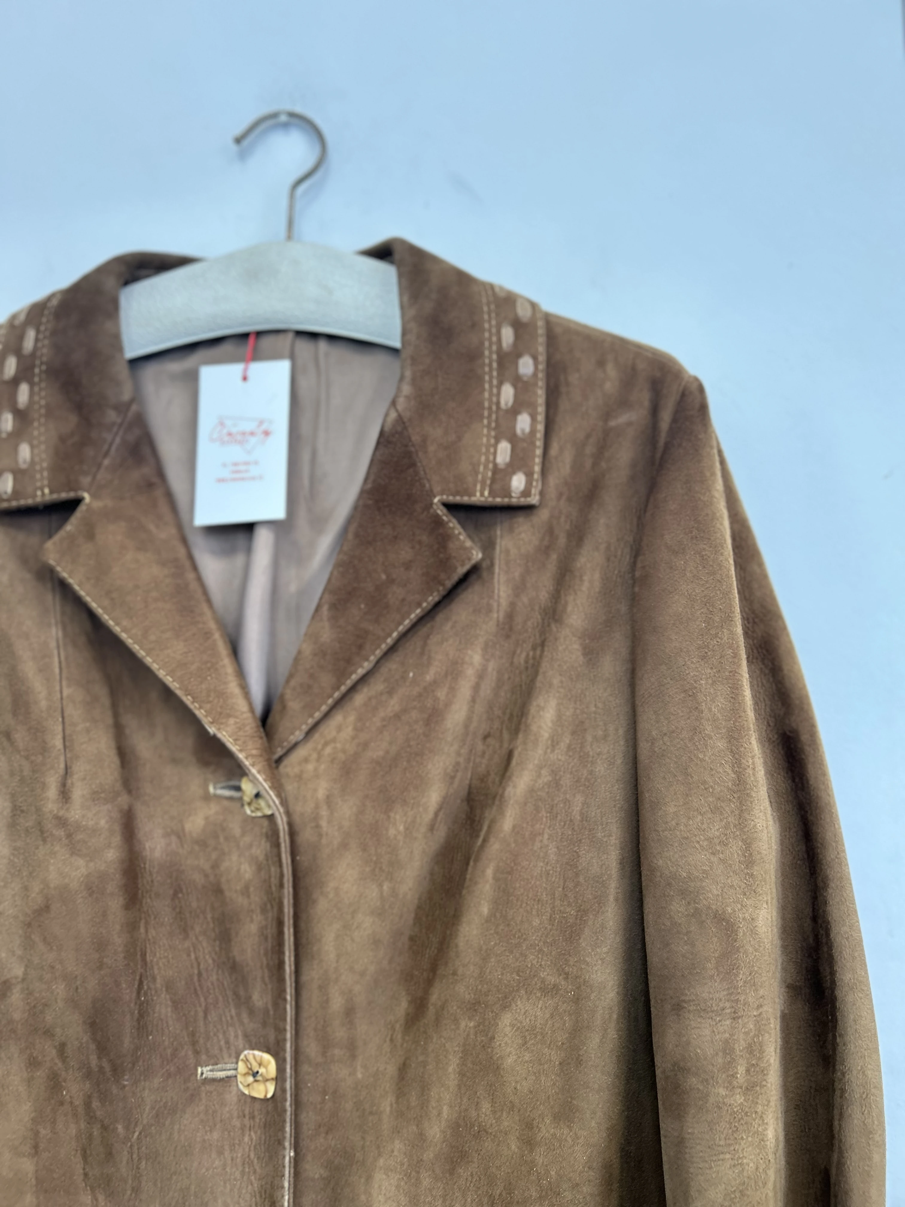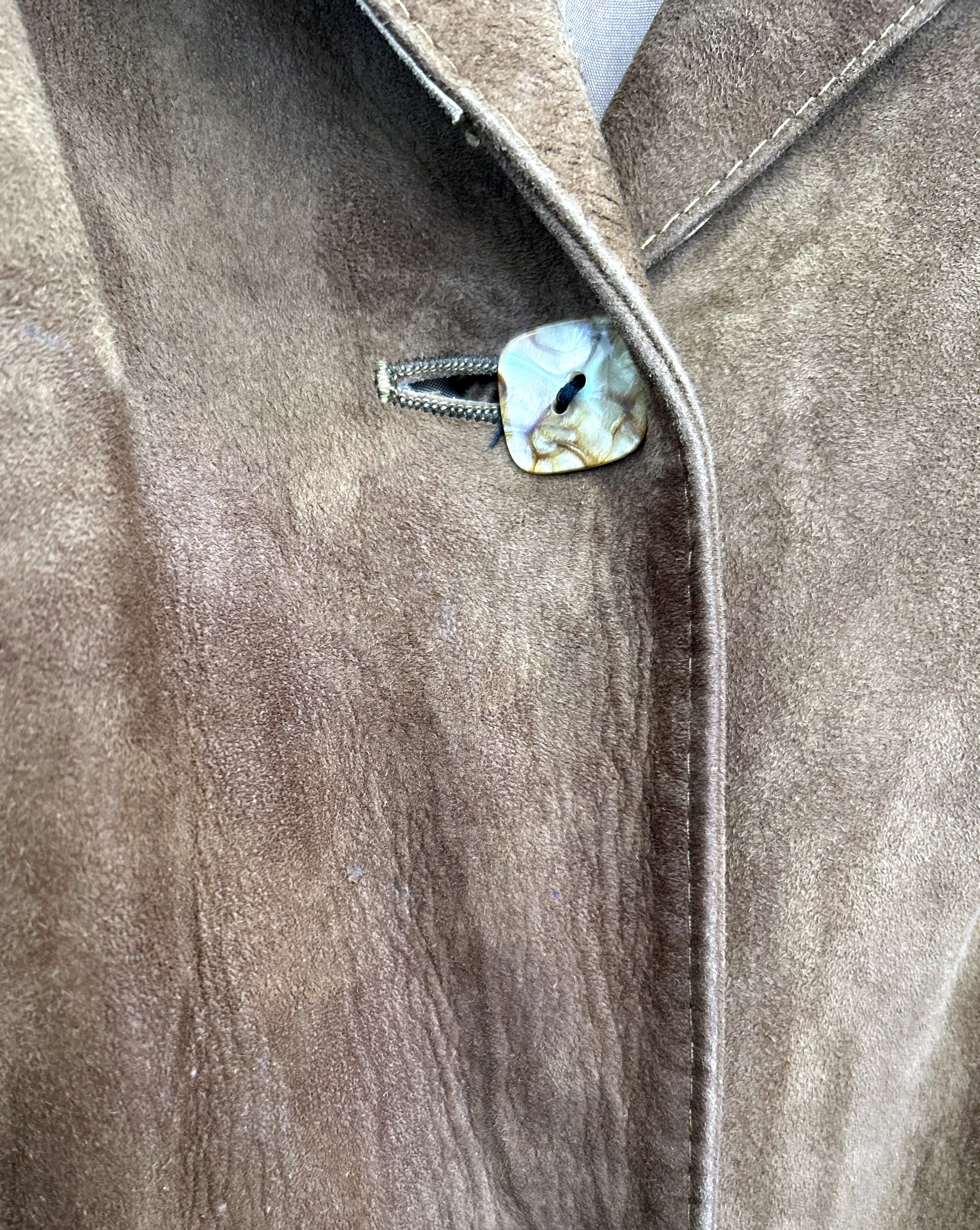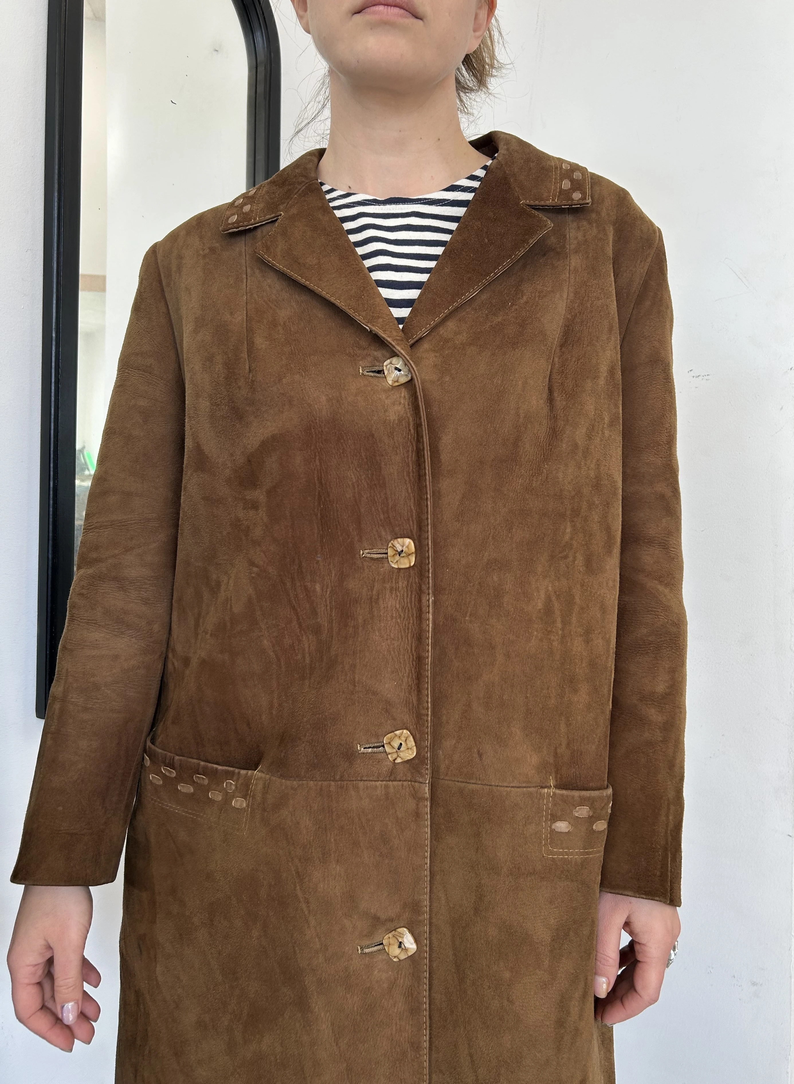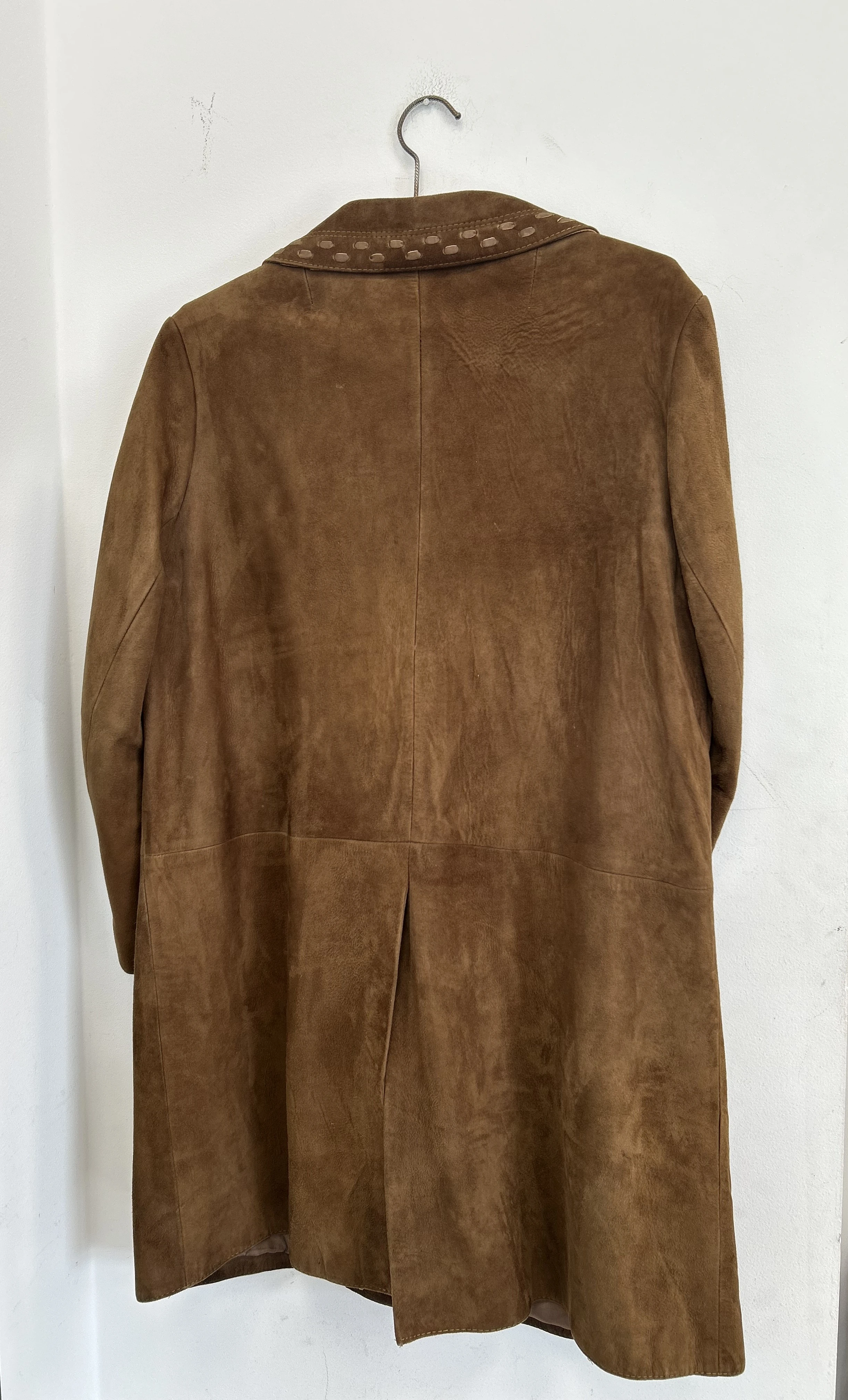 Zamszowy płaszcz vintage. Płaszcz z miękkiej skóry naturalnej zamszowej. Zapinany na guziki. Płaszcz po wyczyszczeniu, wyozonowaniu i zaimpregnowaniu.