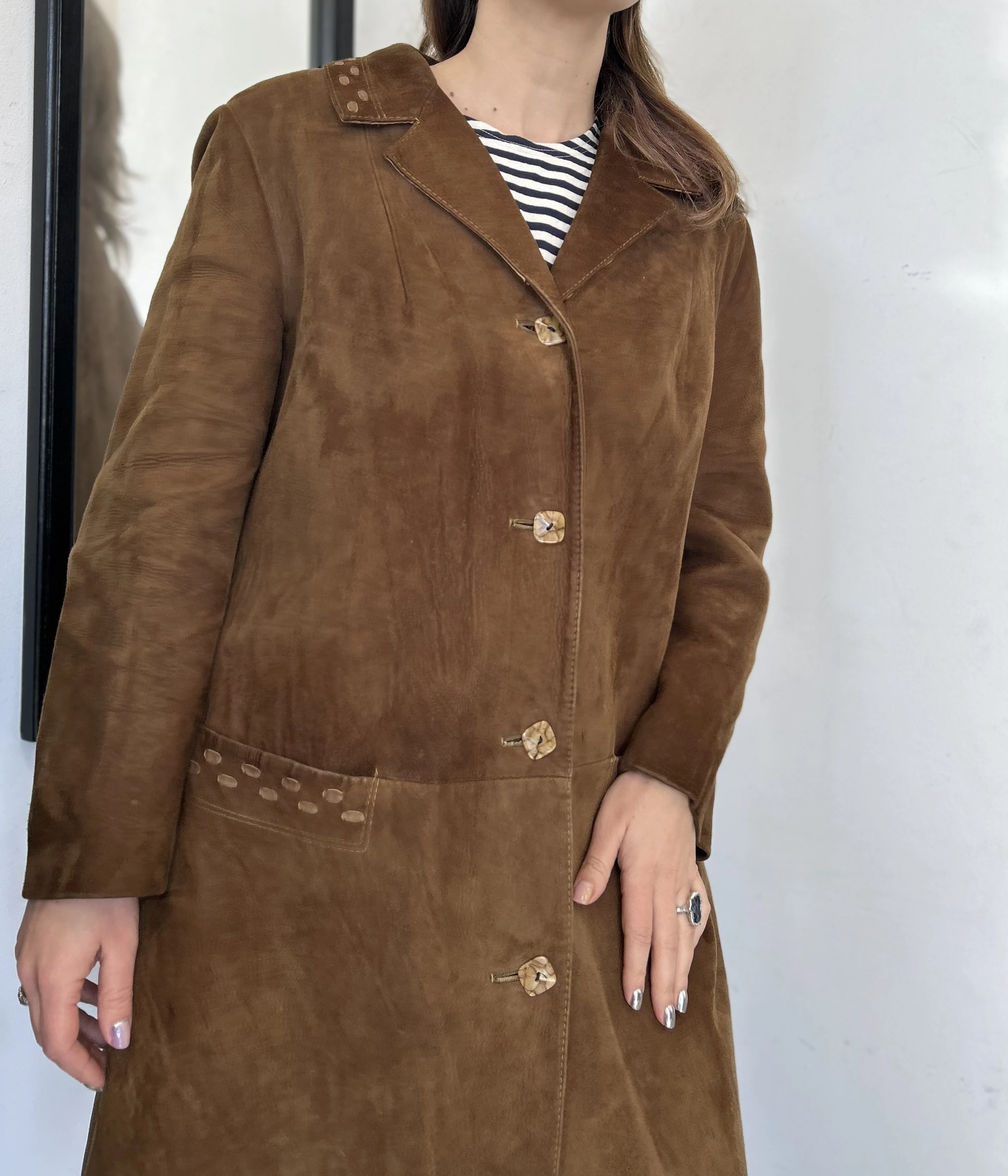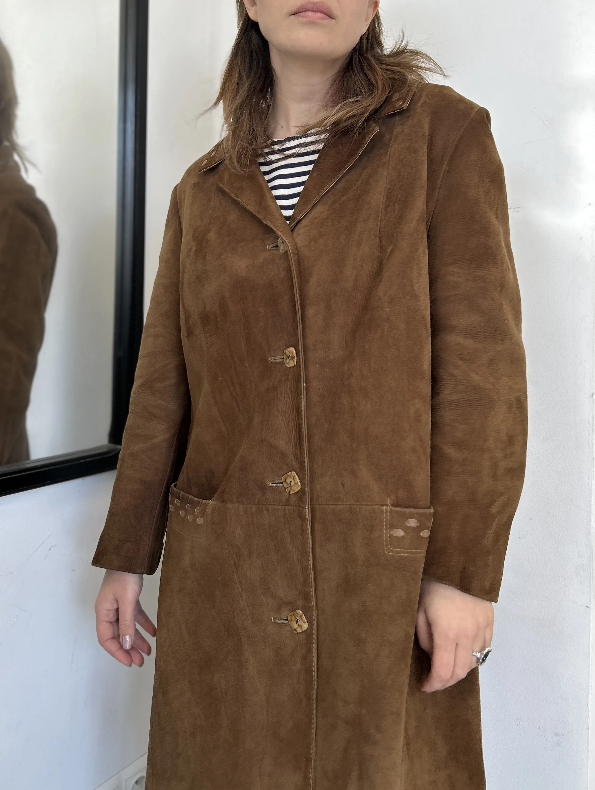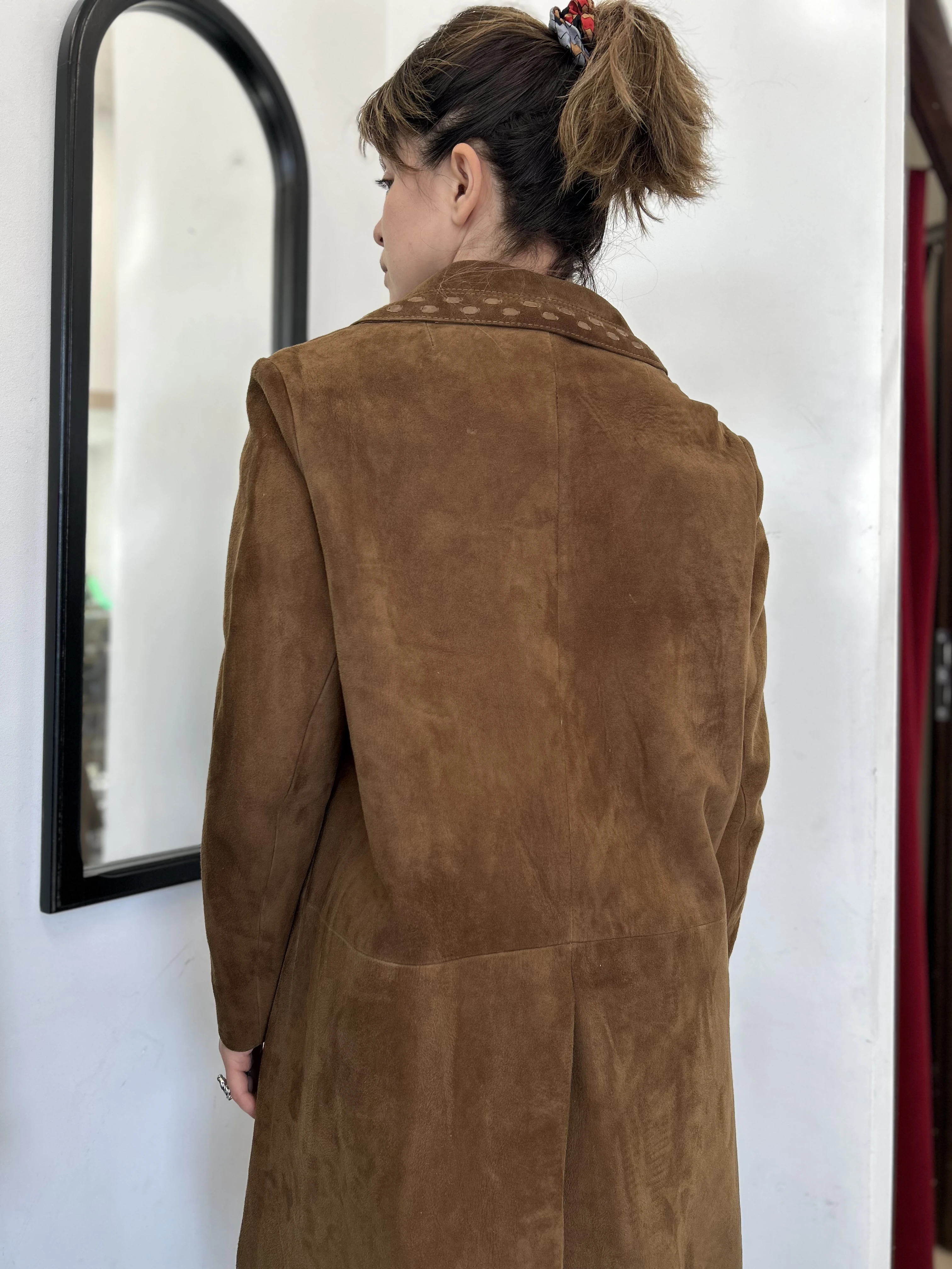 Zamszowy brązowy płaszcz vintage midi