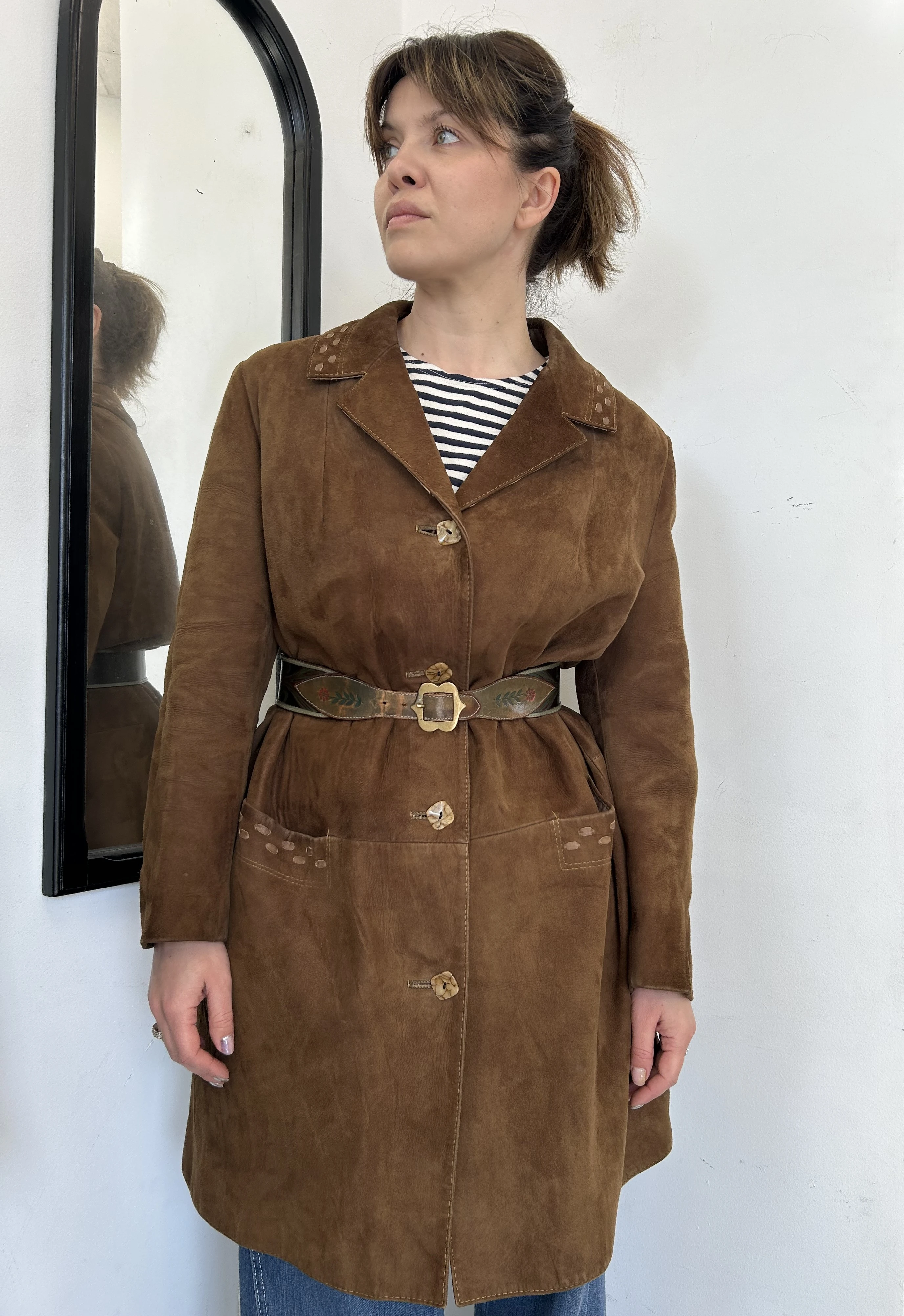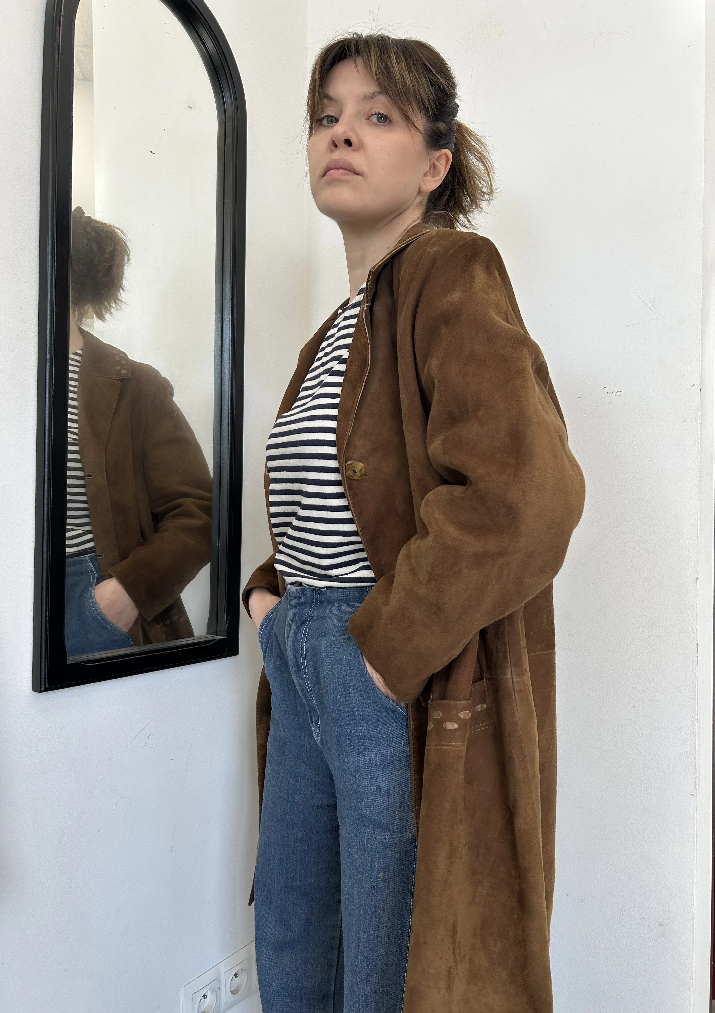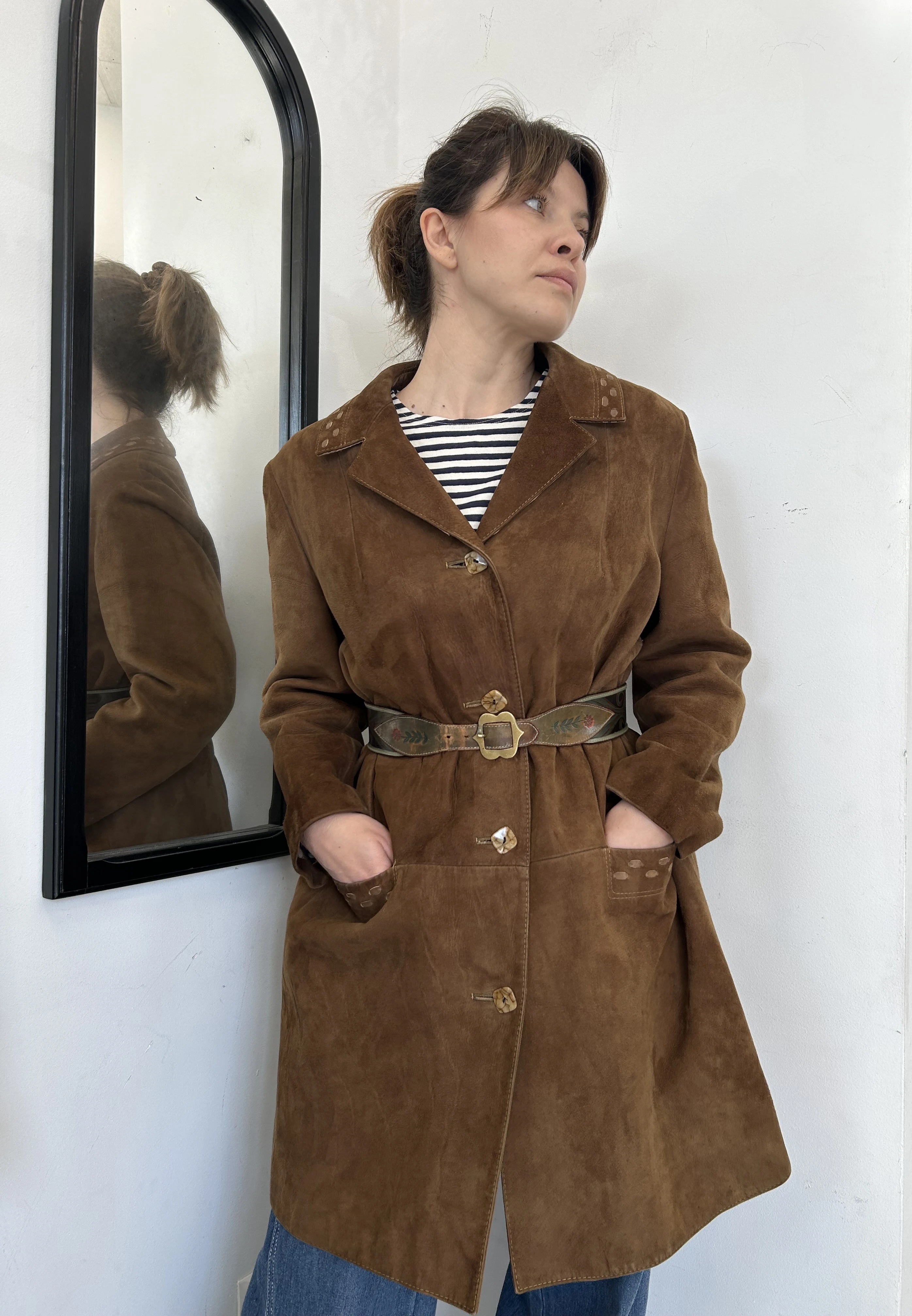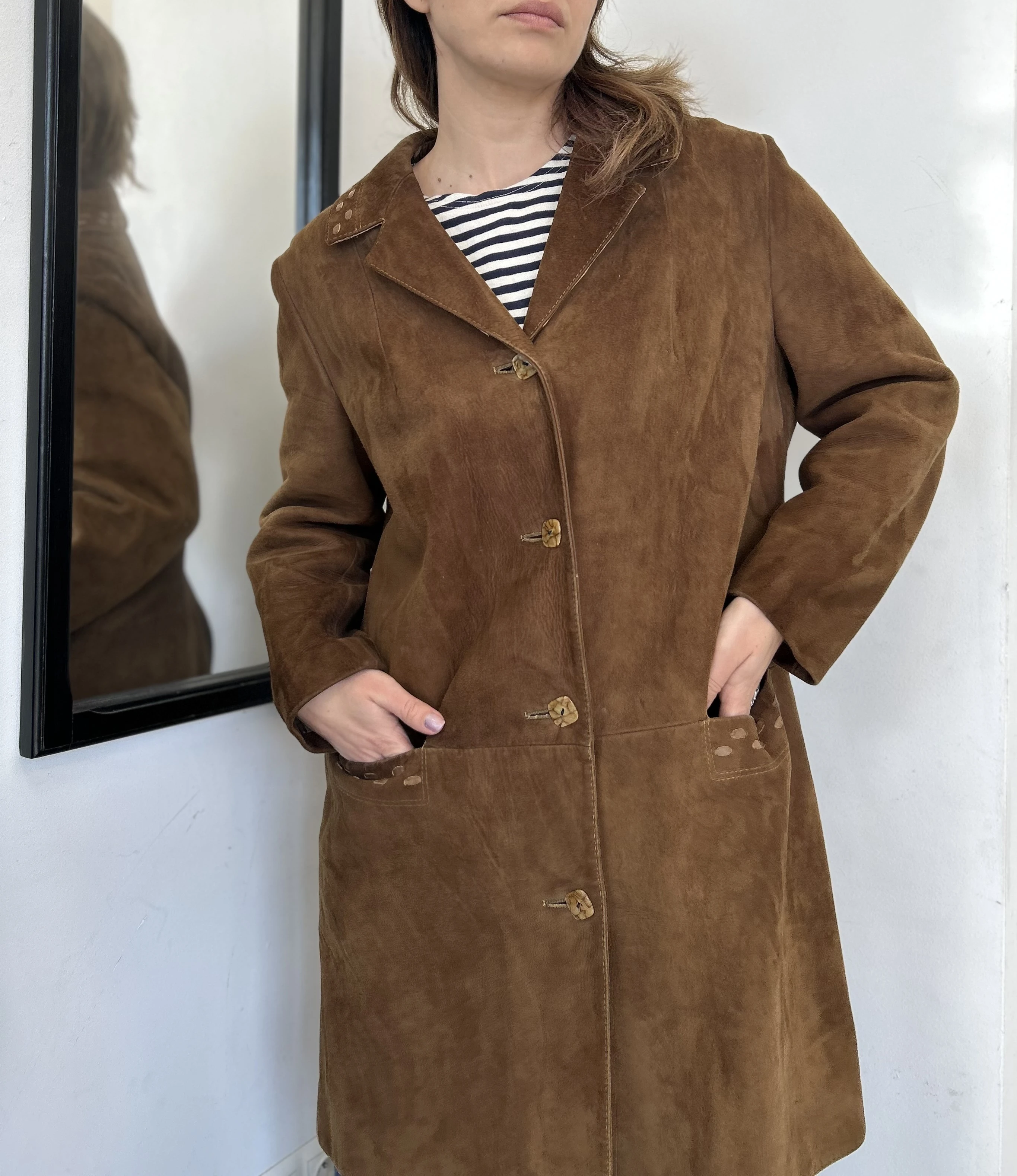 Zamszowy brązowy płaszcz vintage midi